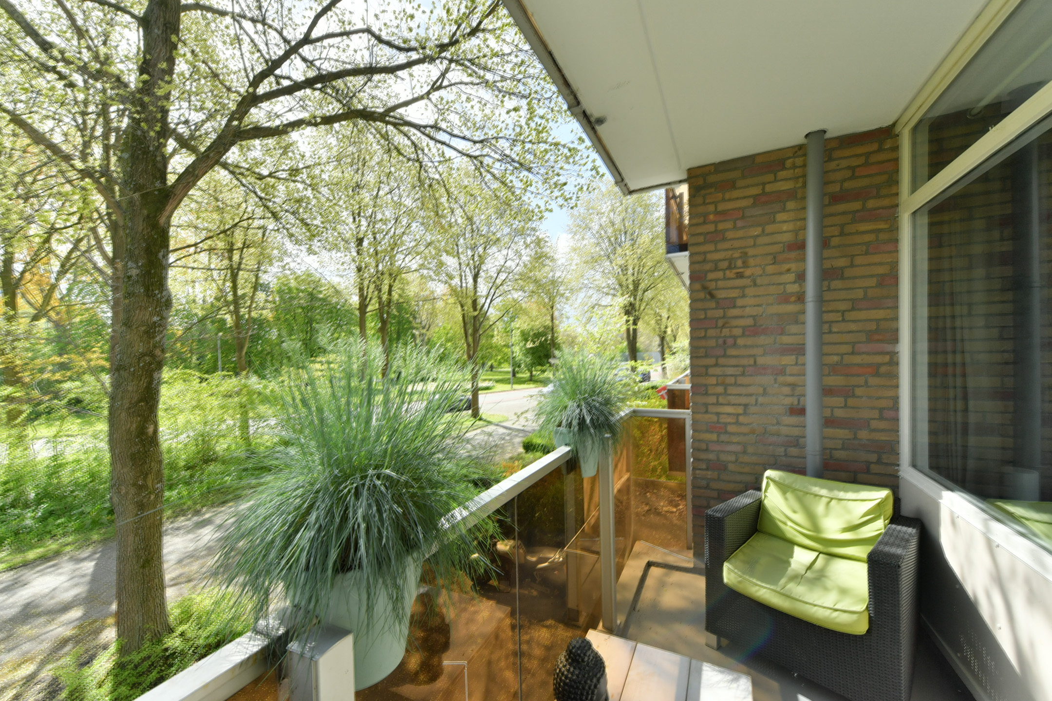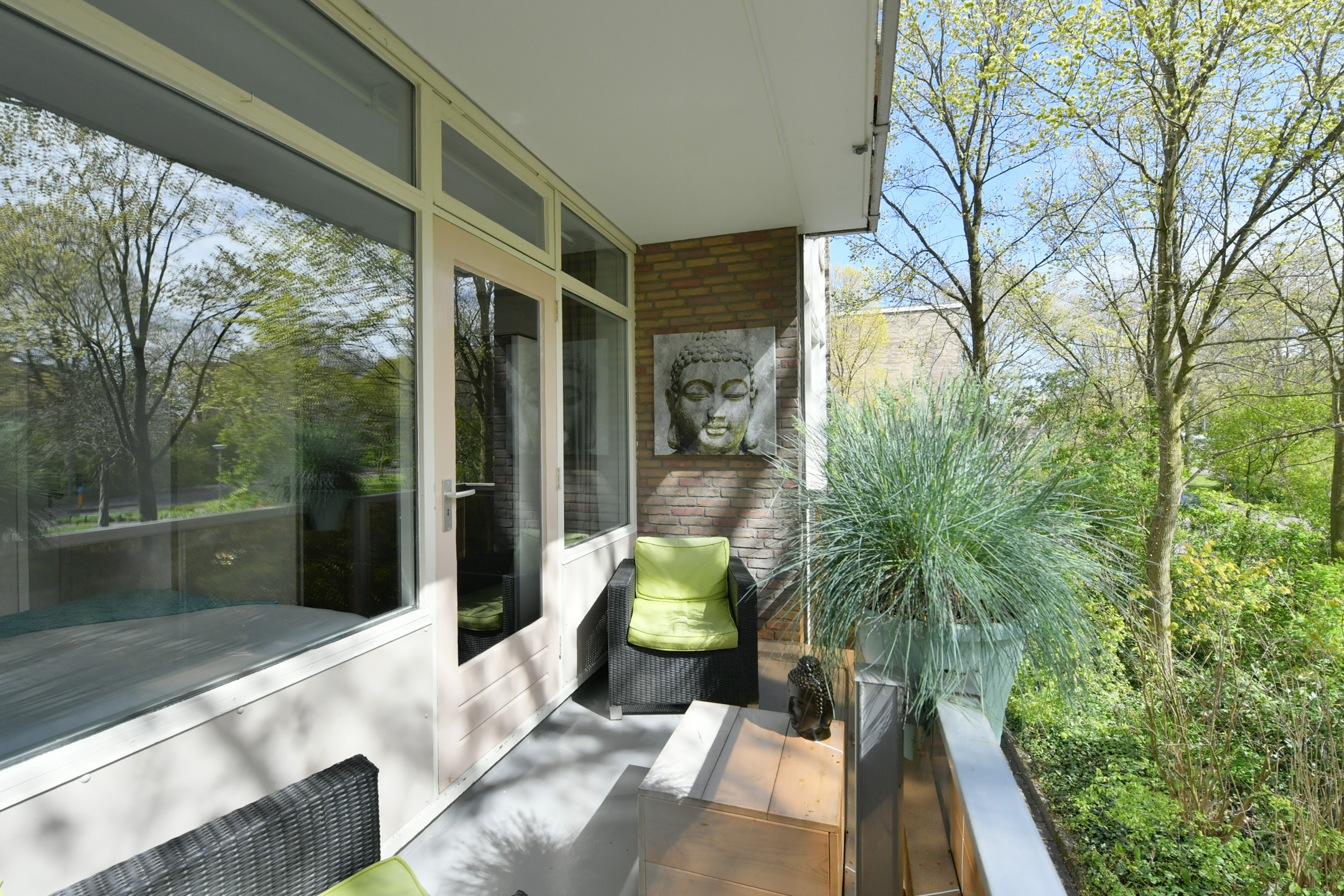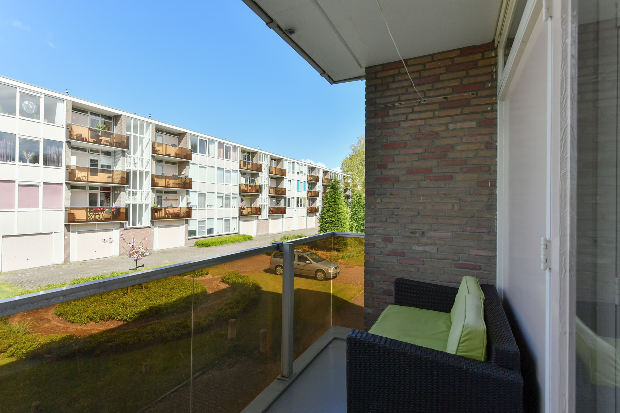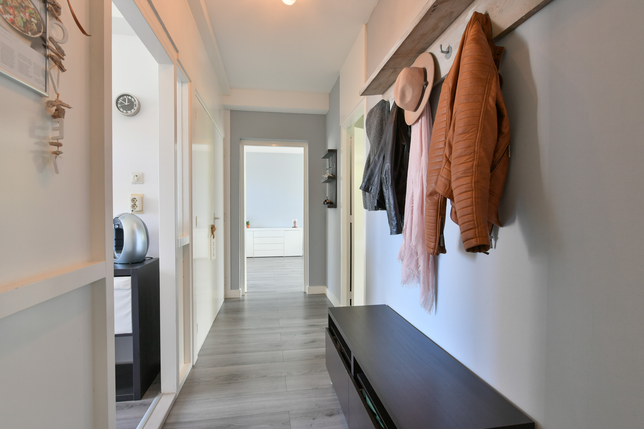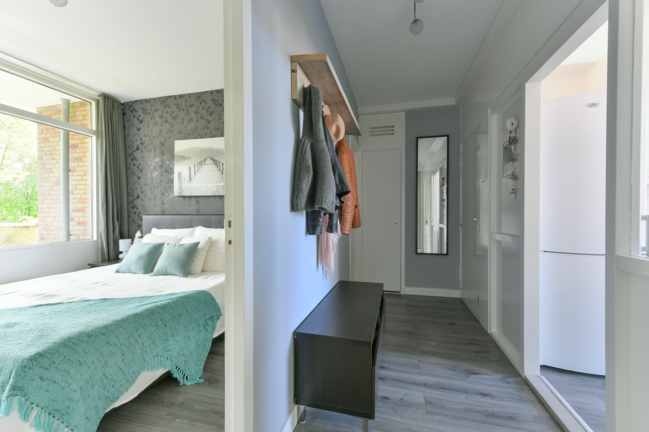 Entree/hal van ca. 6,5 m² met meterkast, toilet en bergkast met C.V.-opstelling. Vanuit de hal zijn twee slaapkamers bereikbaar van ca. 11,5 en 9 m², waarvan de grootste is voorzien van een wastafel en een loopdeur naar het op het zuidoosten gelegen balkon van ca. 5 m². Tevens is vanuit de hal de ruime en lichte doorzonwoonkamer van ca. 36 m² bereikbaar.
