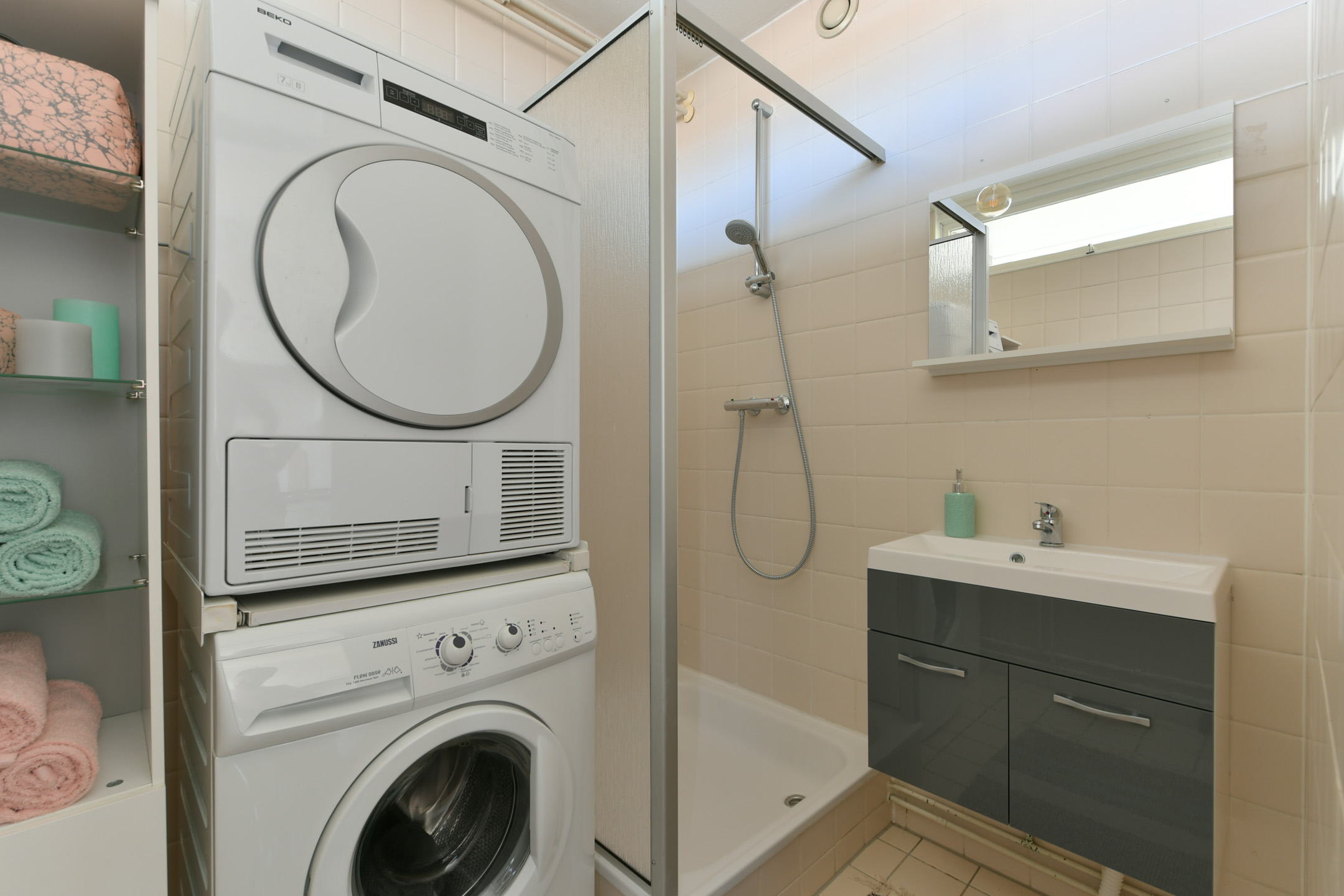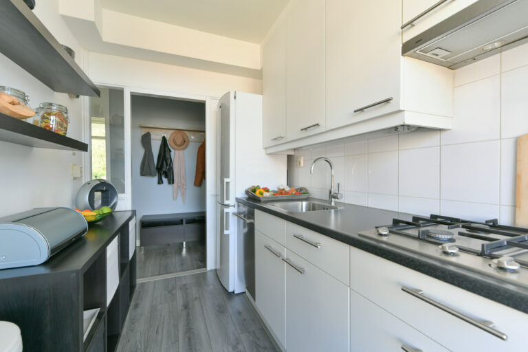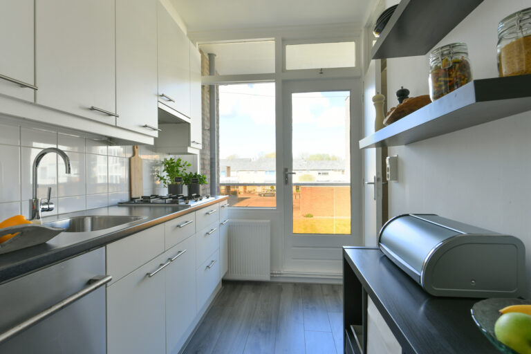 De dichte keuken van ca. 6 m² beschikt over een loopdeur naar het tweede balkon van ca. 5 m² aan de achterzijde van het appartement, gelegen op het westen. Vanuit de keuken is de badkamer van ca. 3 m² bereikbaar, voorzien van een douchecabine, wastafel en wasmachineaansluiting.