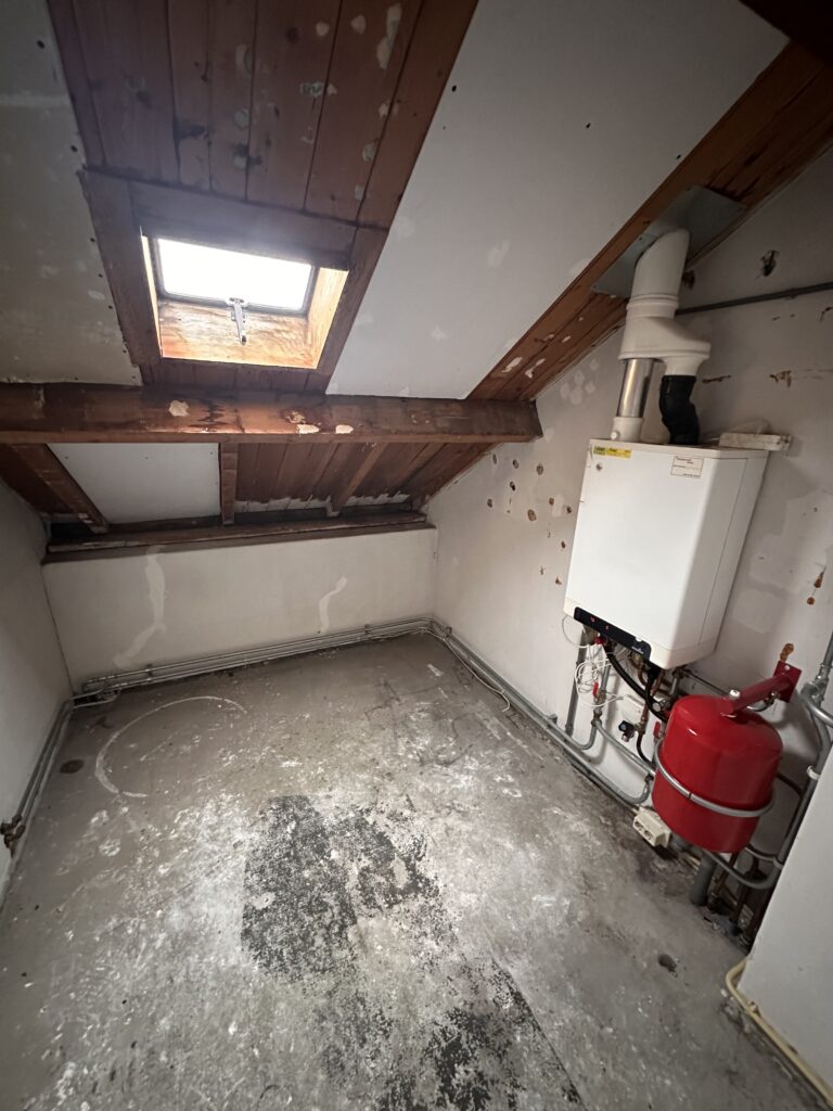 Via vaste trap bereikt u de voorzolder met stookhok voorzien van cv-ketelopstelling, wasmachineaansluiting en drogeraansluiting, de eenvoudig afgewerkte zolderkamer van ca. 13 m² is voorzien een kleine dakkapel.