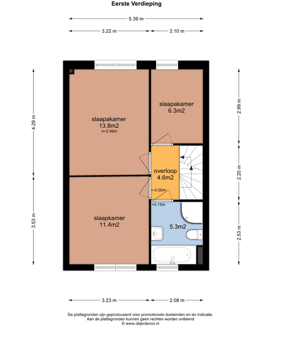 Badkamer voorzien van ligbad, toilet, douchehoek en wastafel met planchet. Verder beschikt deze verdieping over een vaste trap naar zolder en drie slaapkamers van ca. 14 m², 6 m² en 11 m².