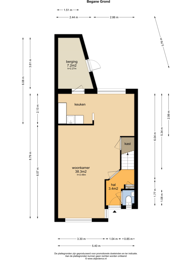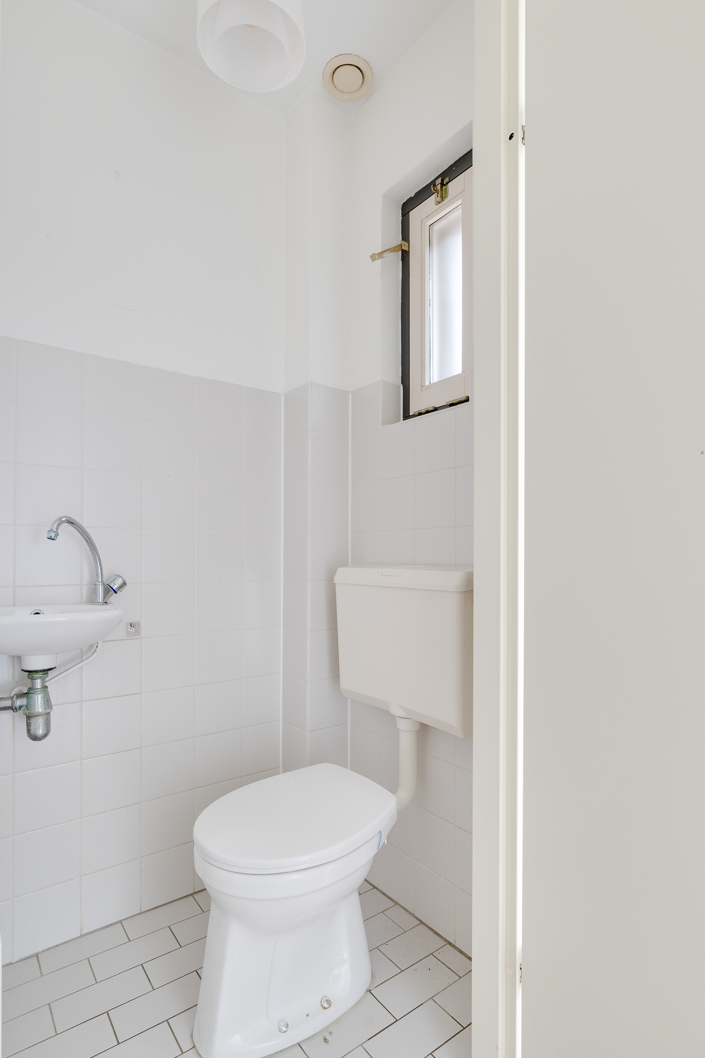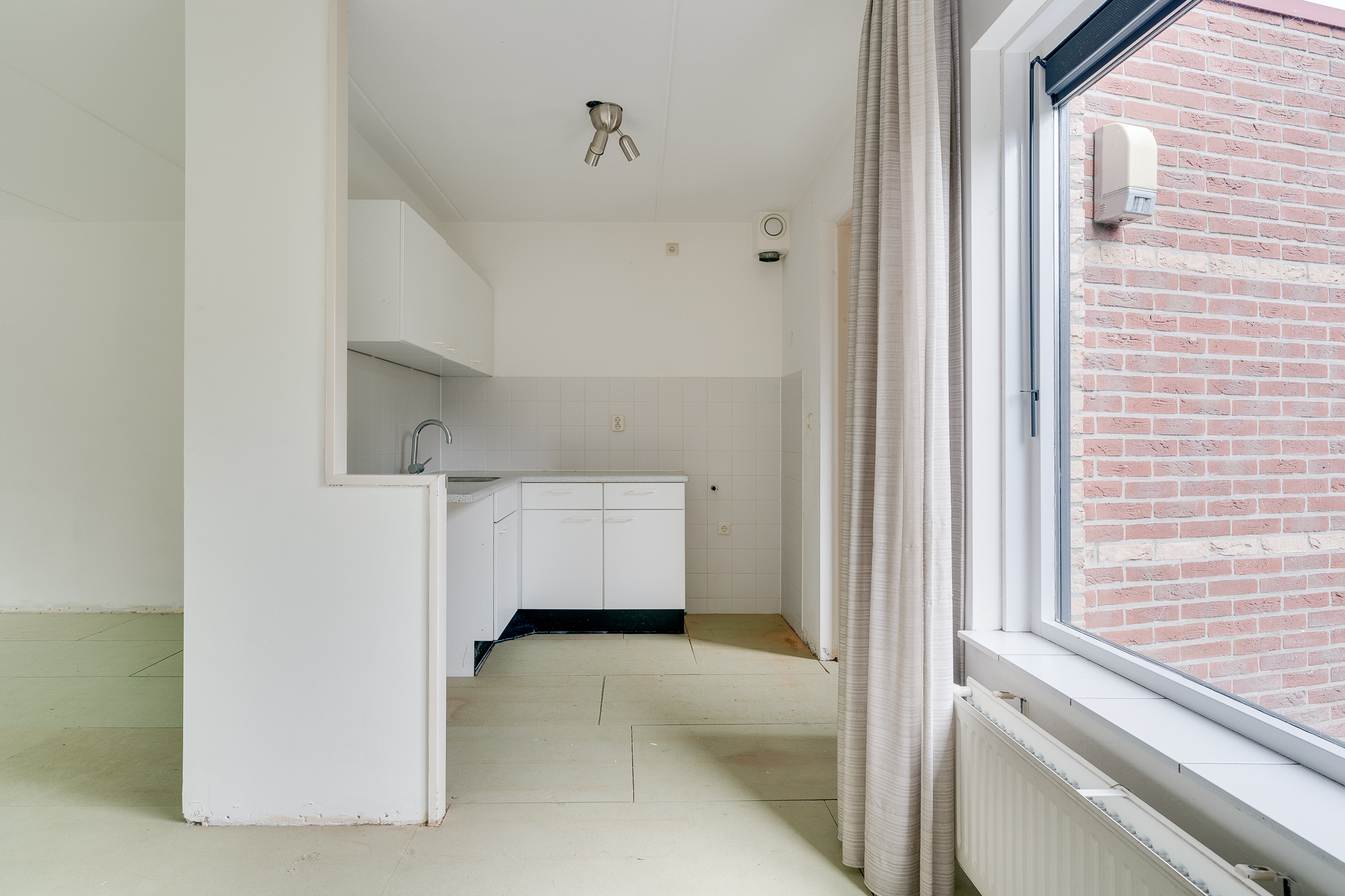 Entree met toilet en trapopgang. Ruime woonkamer van ca. 39 m² met half open keuken voorzien van boven- en onderkastjes. Vanuit de keuken heeft u toegang tot de aangebouwde stenen berging en de tuin.
