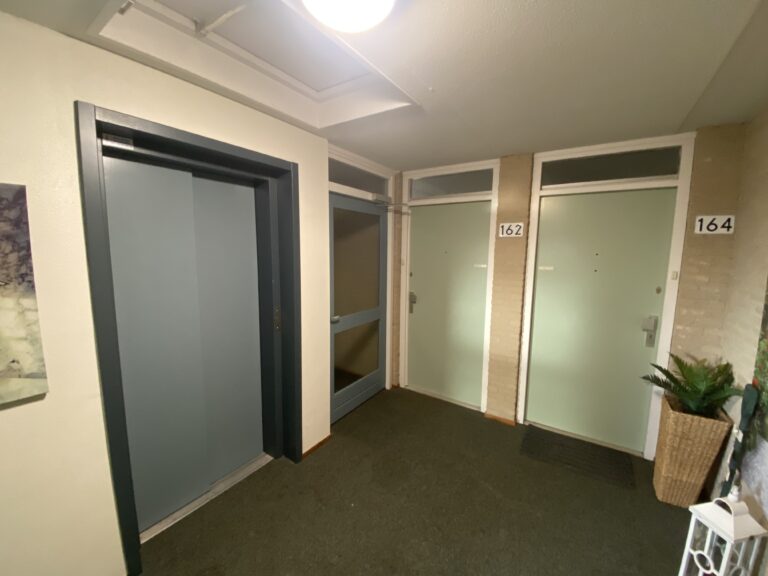 Bij binnenkomst in het appartementencomplex wordt u verwelkomd in de gemeenschappelijke entree met brievenbussen, een modern bellentableau, en toegang tot zowel het trappenhuis als de lift.