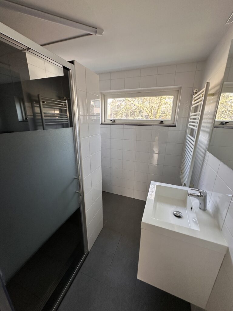 Overloop, 3 slaapkamers. De badkamer van ca. 4 m² is voorzien van een douchehoek, wastafel, 2e toilet en radiator.