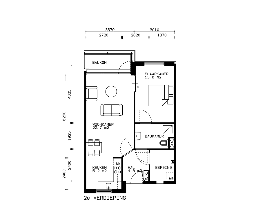 Entree, hal, toegang tot de inpandige berging (4,5 m²) en tot de woonkamer (circa 22 m²) met open keuken (circa 5 m²). De keuken is voorzien van diverse onderkastjes. De woonkamer geeft toegang tot de slaapkamer (13 m²) en tot het balkon. De badkamer is via de hal alsmede via de slaapkamer te bereiken. De badkamer (circa 5,7 m²) is voorzien van een douche, wasbak met planchet en spiegel, radiator en toilet.