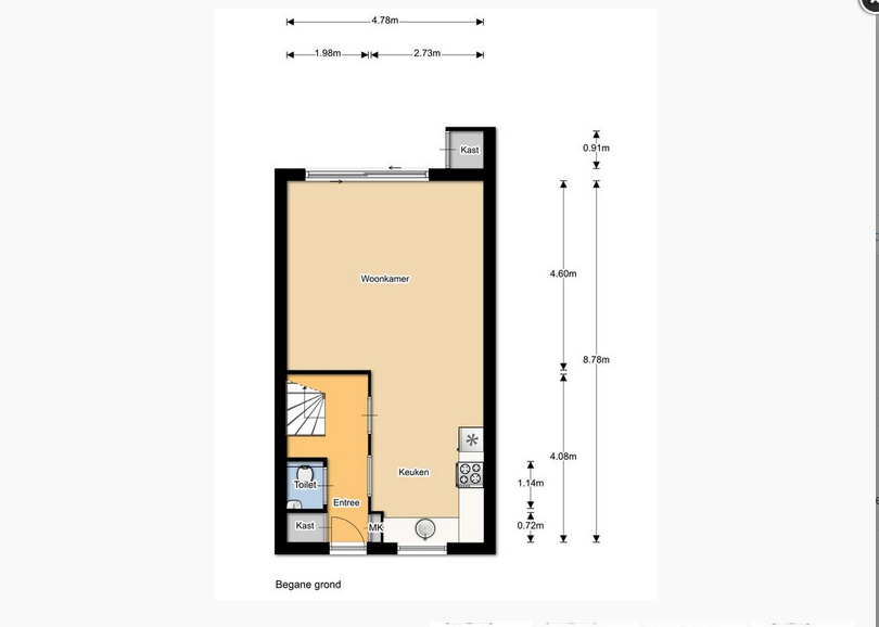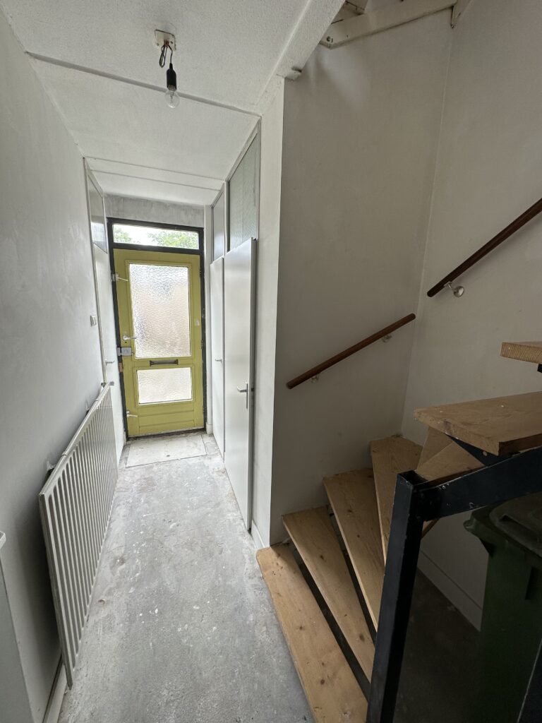 Entree, hal met meterkast, bergkast, toilet met fontein, trapopgang en toegang tot de woonkamer met open keuken. De keuken is voorzien van een combimagnetron, afzuigkap en spoelbak. Vanuit de woonkamer heeft u toegang tot de achtertuin. Deze is ruim 10 meter diep. Aan de voorzijde van de woning is nog een ruime berging.