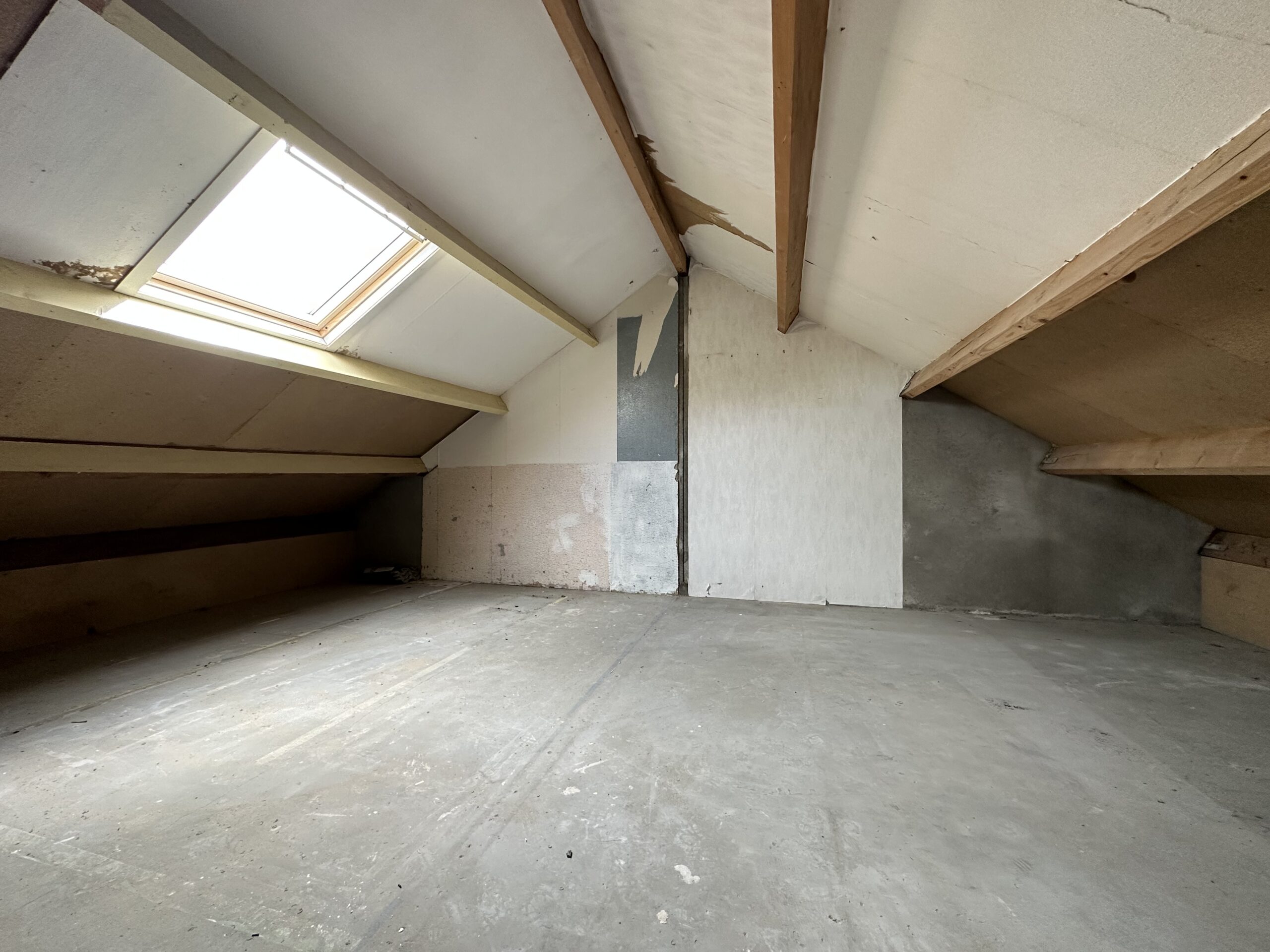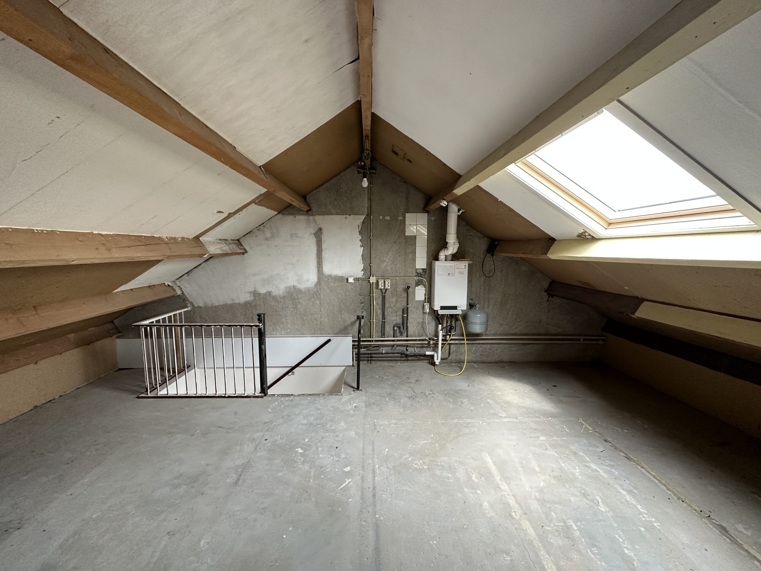 Bereikbaar middels een vaste trap. Overloop met de aansluitingen voor een wasmachine. Daarnaast is er bergruimte onder de schuine kap.
