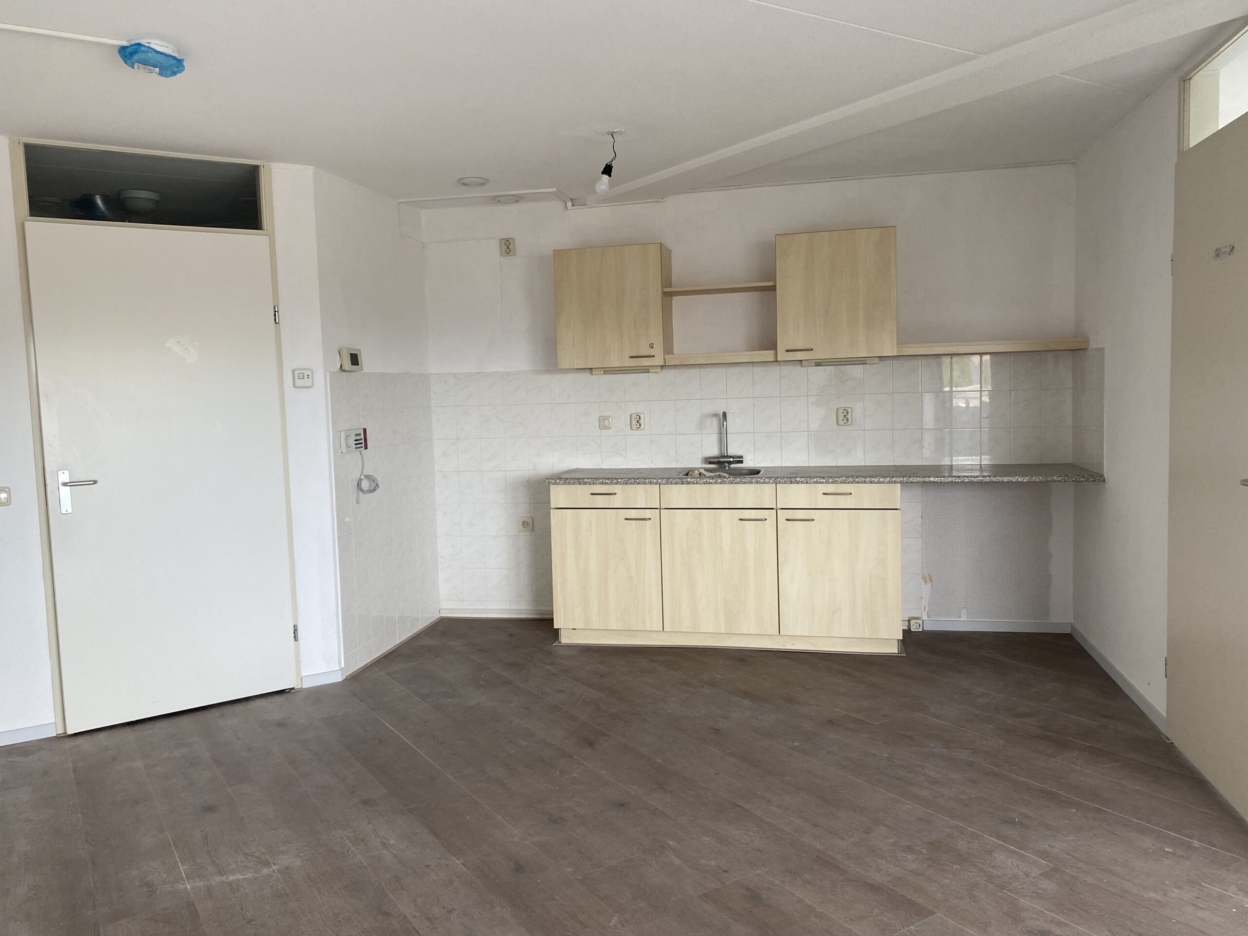 Entree, hal, waarnaast rechts zich een mooie kamer bevindt. Daarna loopt u door naar de ruime lichte woonkamer met open keuken. Het keukenblok is voorzien van onder- en bovenkastjes.