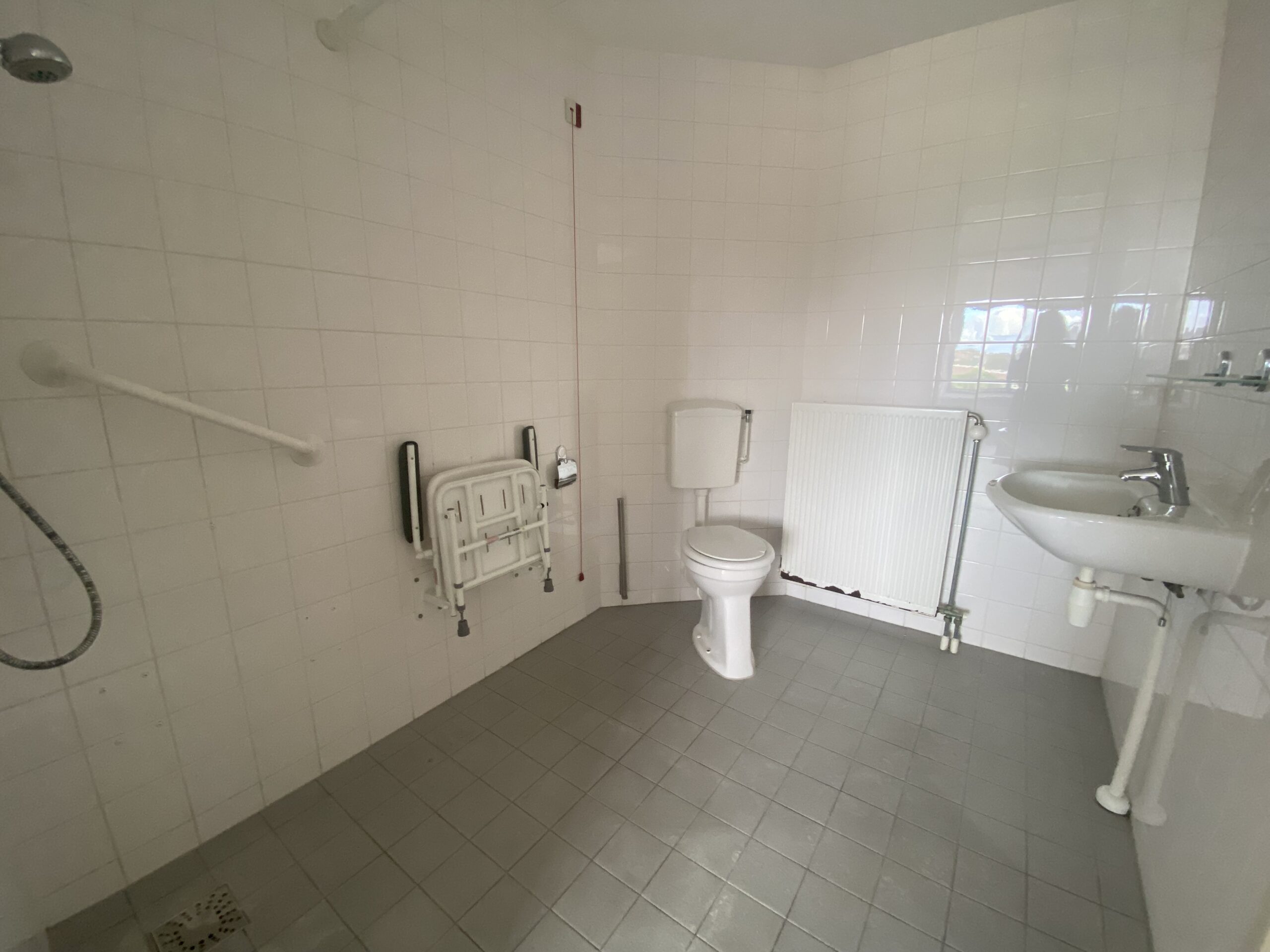 Slaapkamer met toegang tot ruime badkamer voorzien van douche met douchestoel, toilet met steunen en een wastafel met spiegel. De badkamer is zowel via de hal als via de 1e slaapkamer te betreden. Naast de woonkamer is er nog een 2e slaapkamer met mooi natuurlijk licht. Het balkon, wat via de woonkamer is te betreden heeft leuk uitzicht op een plantsoen. Door het gehele appartement is een nieuwe PVC vloer gelegd voor een moderne uitstraling.