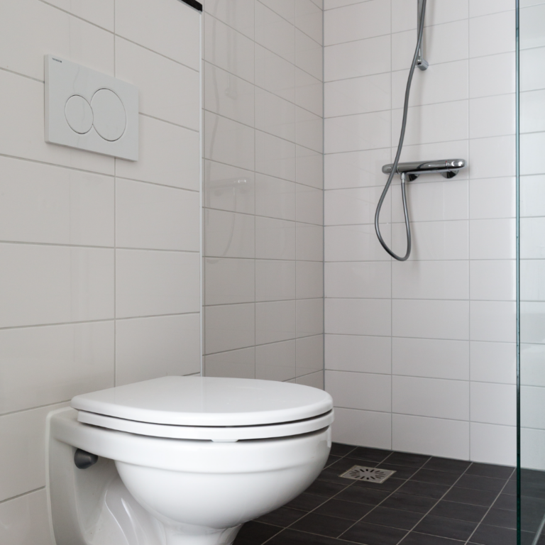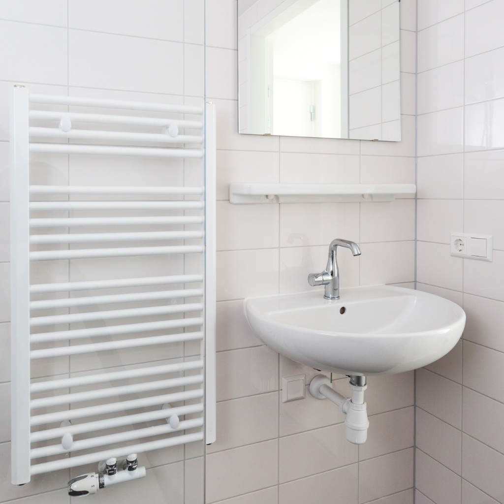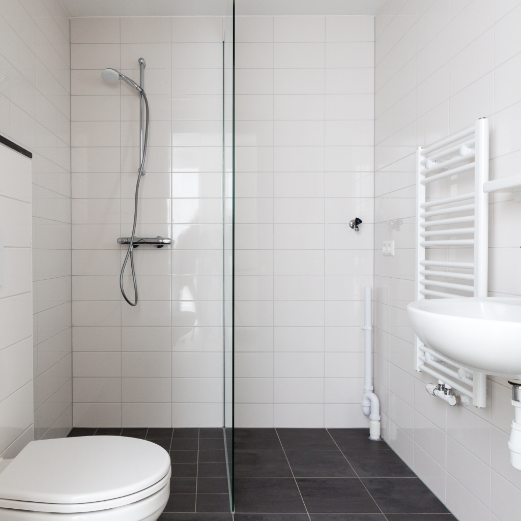 Entree met hal, die toegang biedt tot de badkamer. Deze bevindt zich in keurige staat en is uitgerust met een douchehoek, toilet, wastafel met spiegel en planchet, designradiator en aansluitingen voor wasmachine en droger.