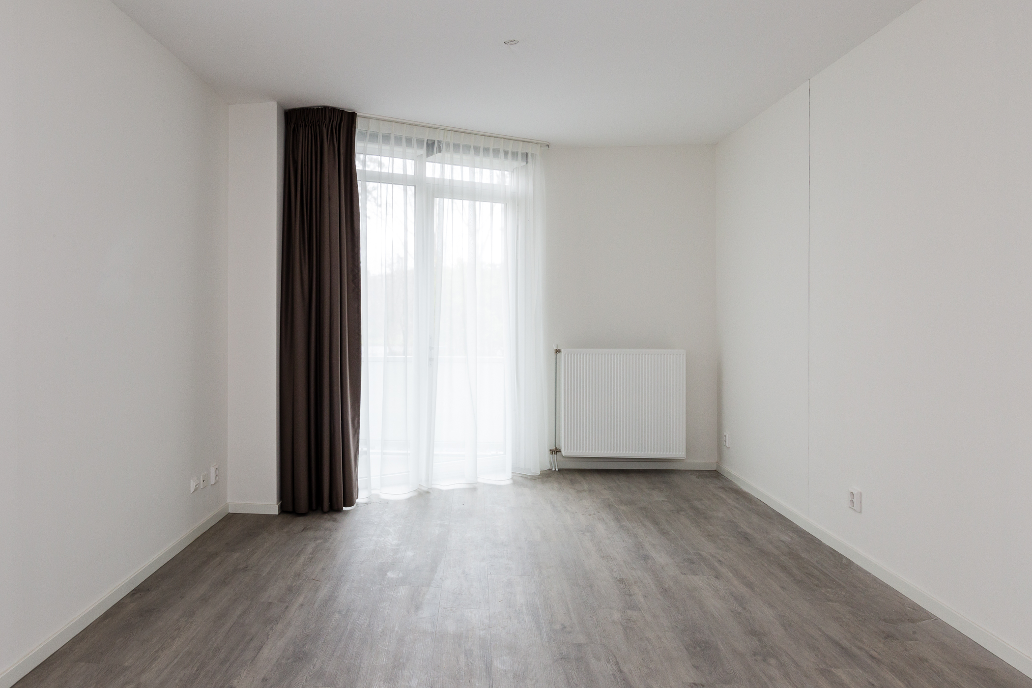 De lichte woonkamer (ca. 25 m²) grenst aan de slaapkamer (ca. 12 m²), welke beschikt over een fraai raampartij. In de woonkamer bevindt zich tevens de open keuken, compleet ingericht met een vierpits inductiekookplaat, afzuigkap, combimagnetron, vaatwasser en koelkast met vriesvak. Vanuit de woonkamer bereikt u het balkon van ca. 3 m².