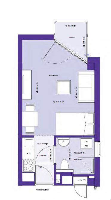 Wanneer u verder loopt, komt u in de woonkamer, waar tevens ruimte is om een comfortabele slaapplek te realiseren. Het balkon is te betreden vanuit de woonkamer.