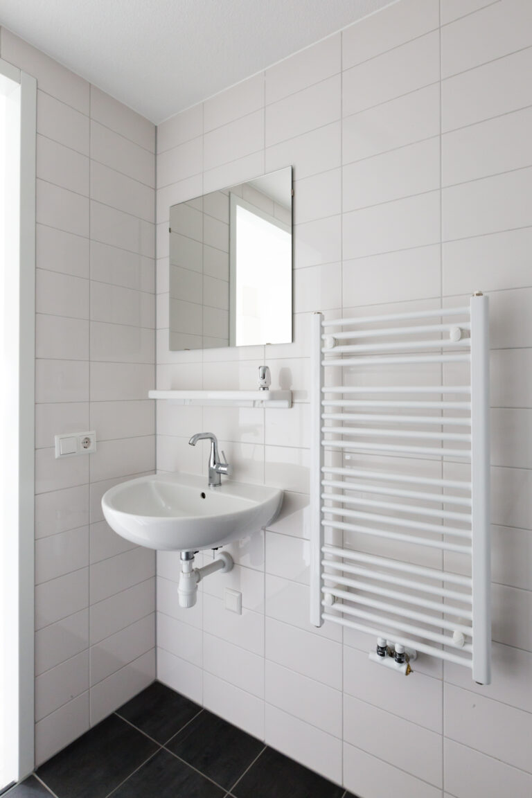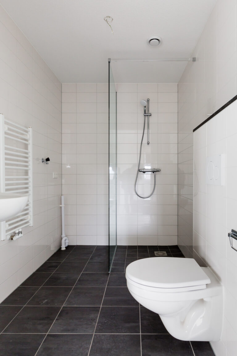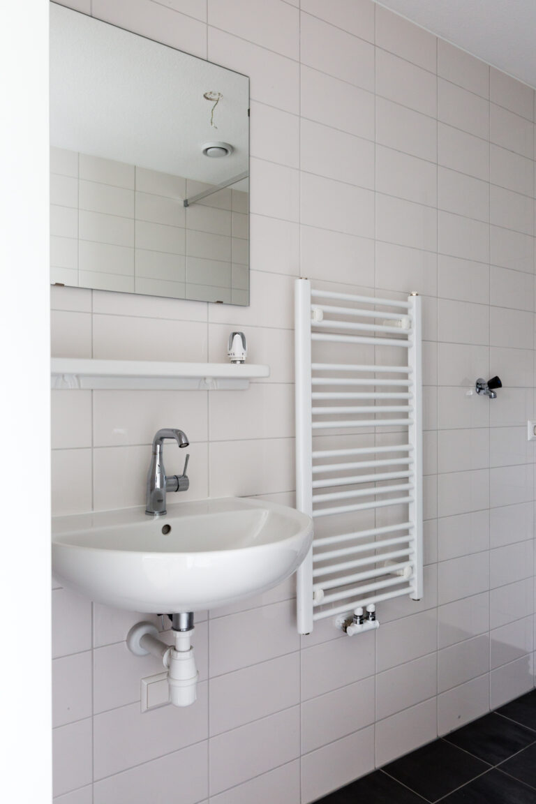 Bij binnenkomst treft u direct aan de linkerzijde de moderne keuken, voorzien van diverse inbouwapparatuur. Aan de rechterzijde bevindt zich de badkamer, uitgerust met een douchehoek, toilet, wastafel met spiegel en planchet, en aansluitingen voor een wasmachine en droger.