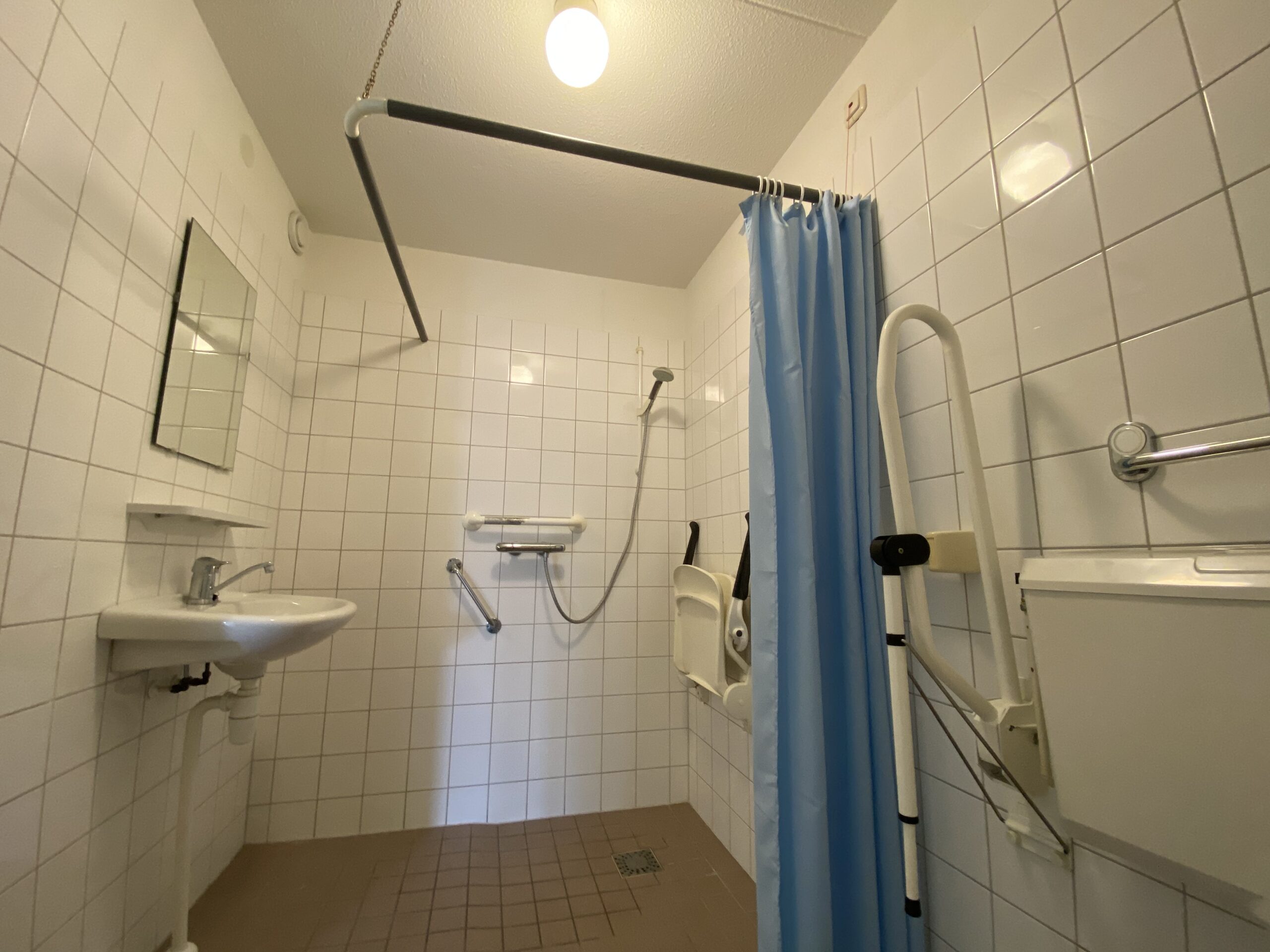 Entree, hal, stookruimte met aansluiting voor de wasmachine, ruime badkamer voorzien van douche met douchestoel, toilet met steunen, wastafel met spiegel en planchet.