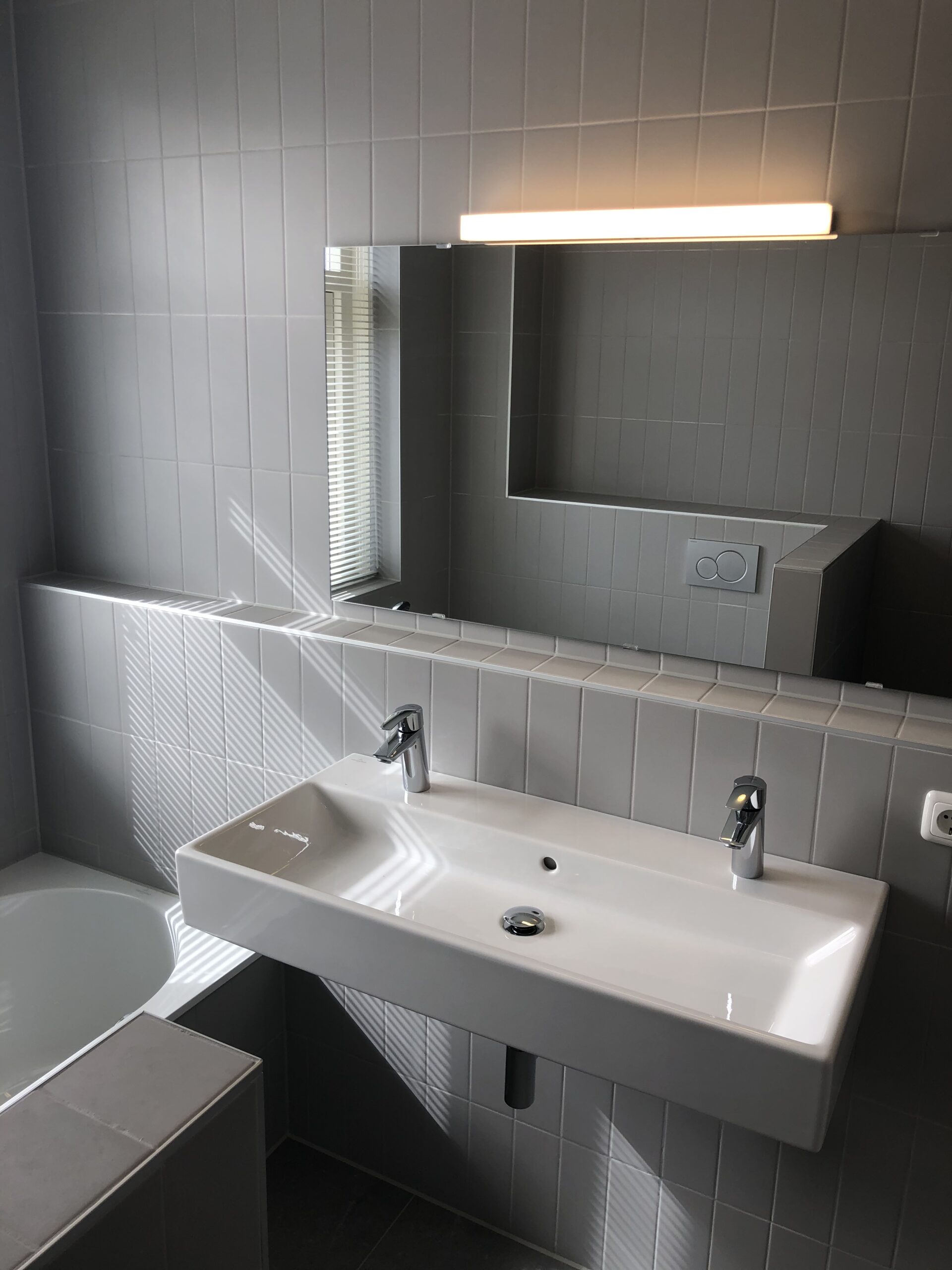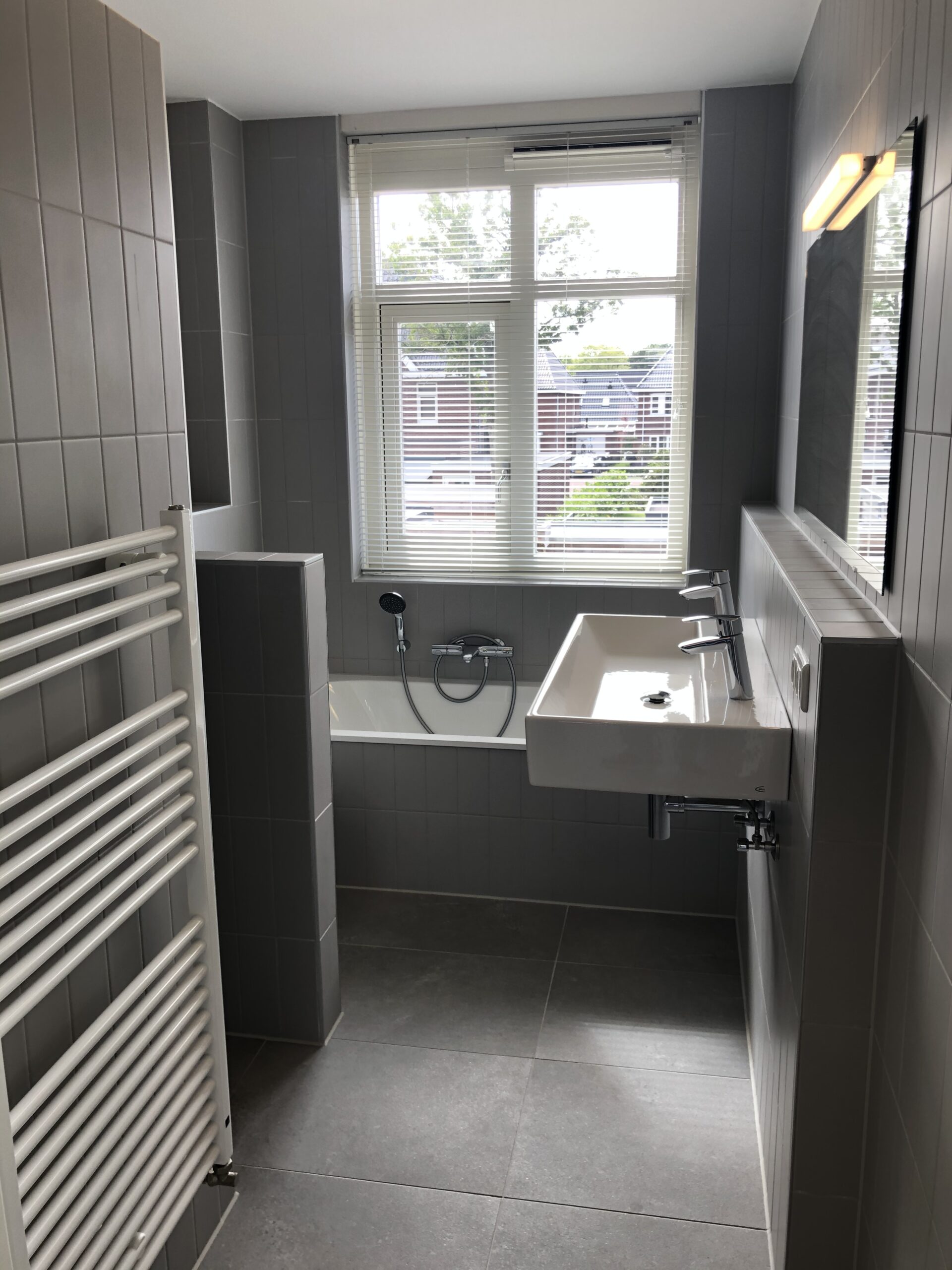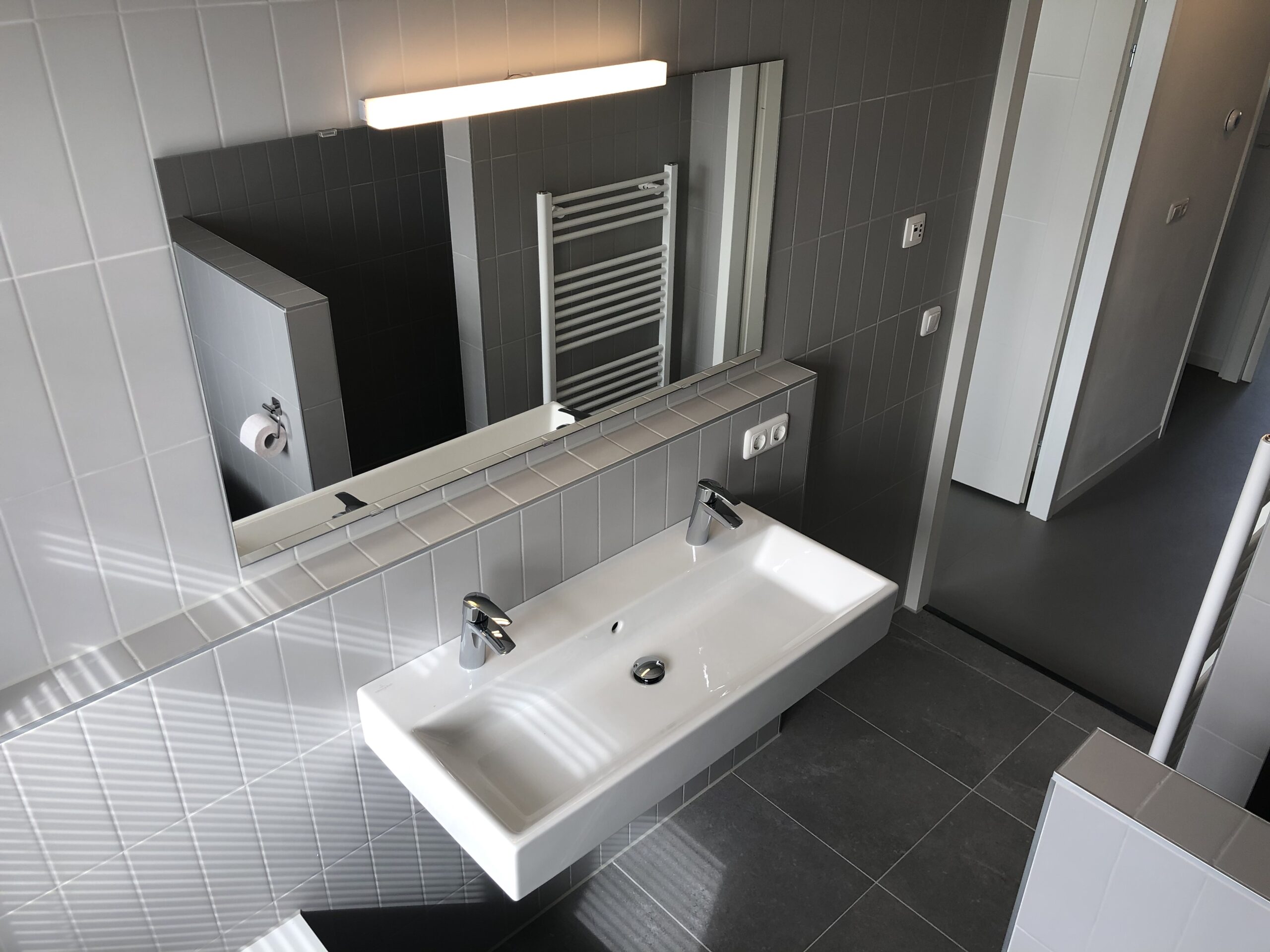 Overloop, 3 ruime slaapkamers (ca. 5,6 m², 12,4 en 15,2 m²). De moderne badkamer (ca. 6,4 m²) voorzien van ligbad, grote wastafel, inloopdouche, radiator en toilet. De 1e verdieping is voorzien van linoleum.
