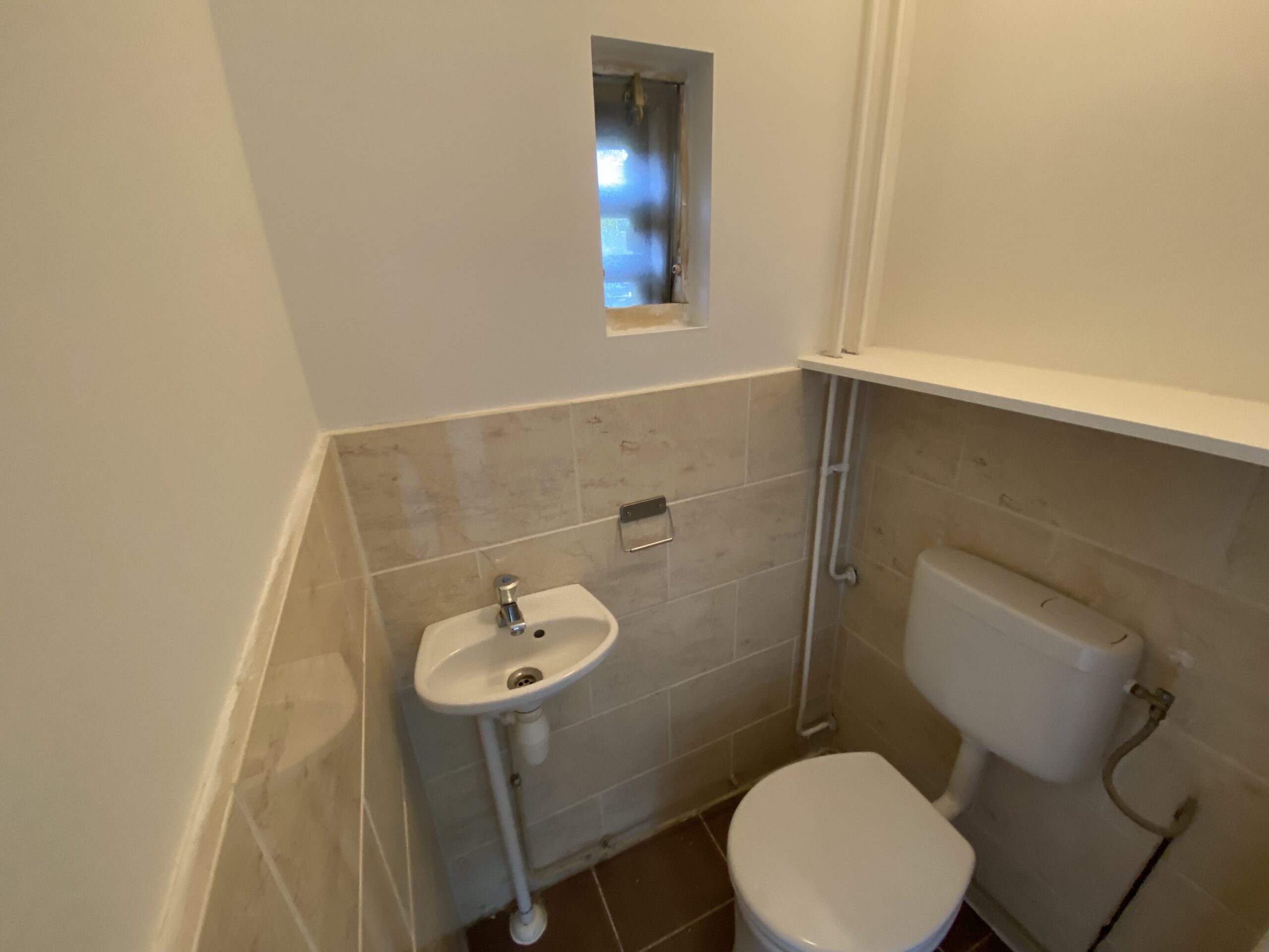 Overloop, 3 ruime slaapkamers, badkamer met wastafel, spiegel, planchet, douche, tweede toilet en wasmachine-aansluiting.