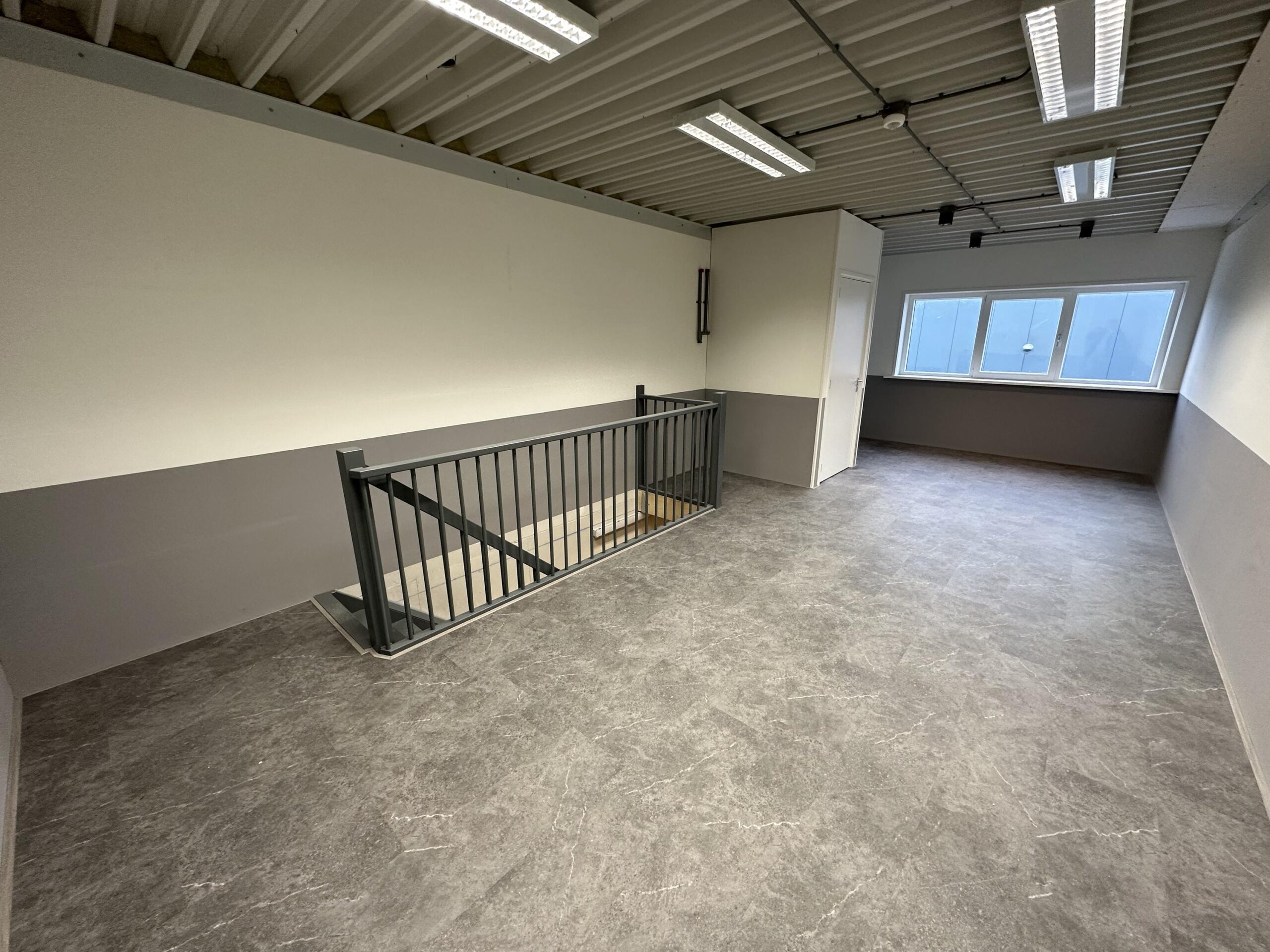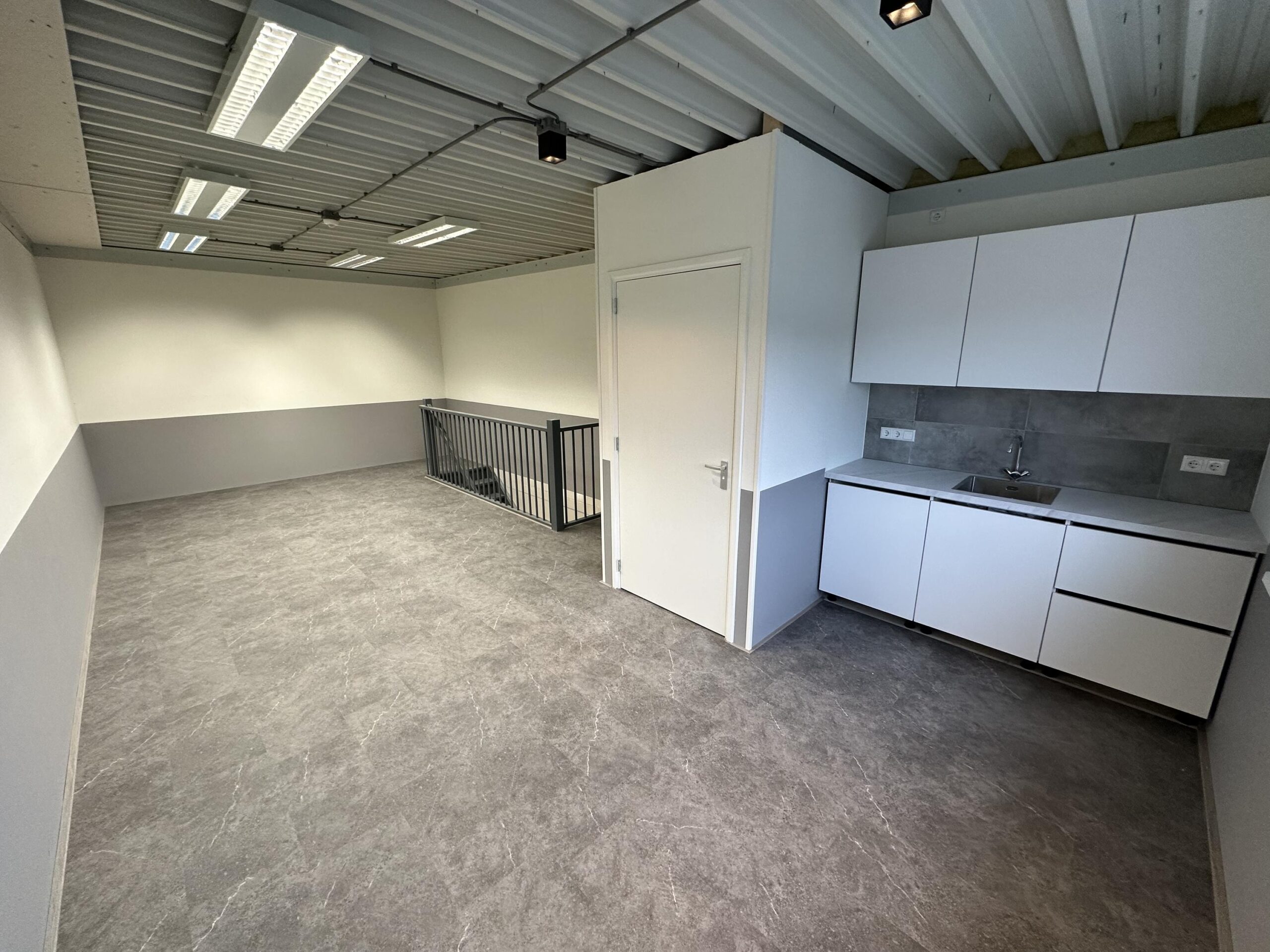 Bedrijfsunit van in totaal ca. 70 m²: begane grond ca. 35 m² met overheaddeur en middels een vaste trap bereikt u de verdieping van ca. 35 m² v.v. laminaatvloer en pantry voorzien van boven- en onderkastjes, boiler voor warmwater en separaat toilet.