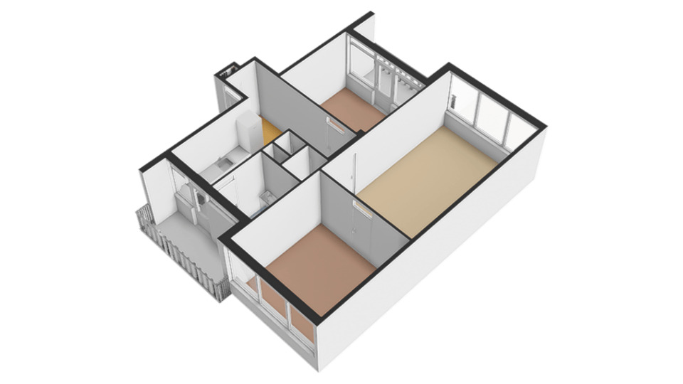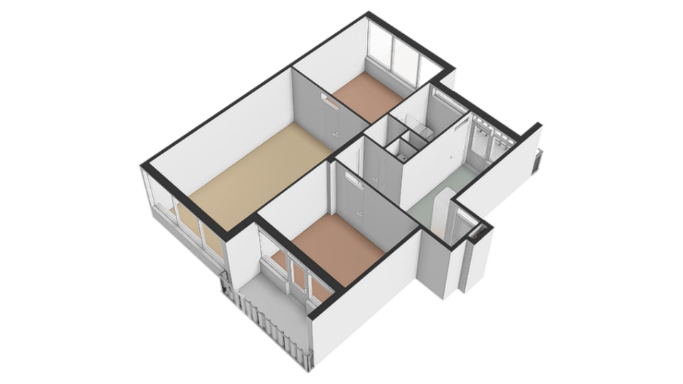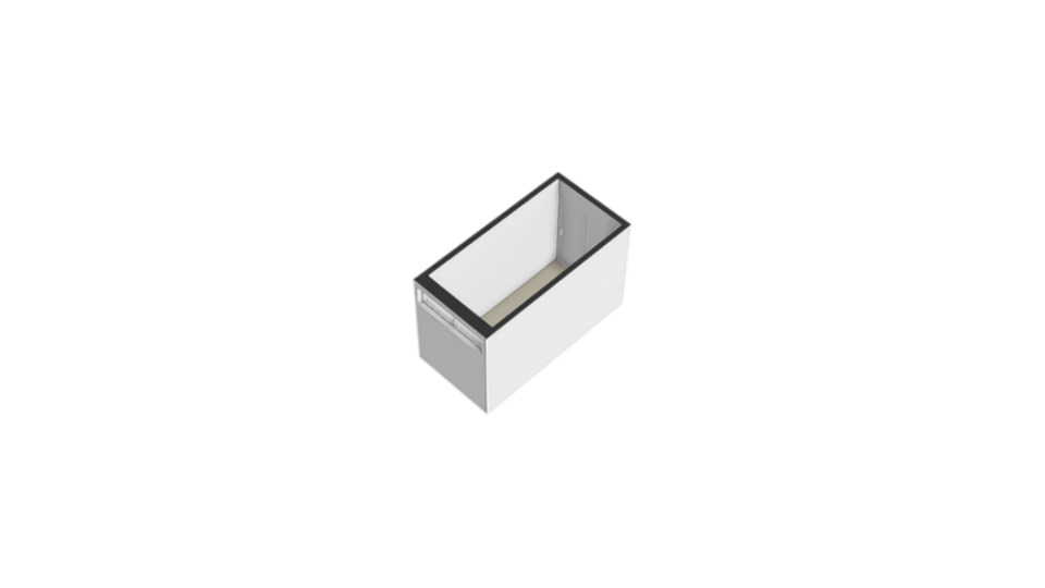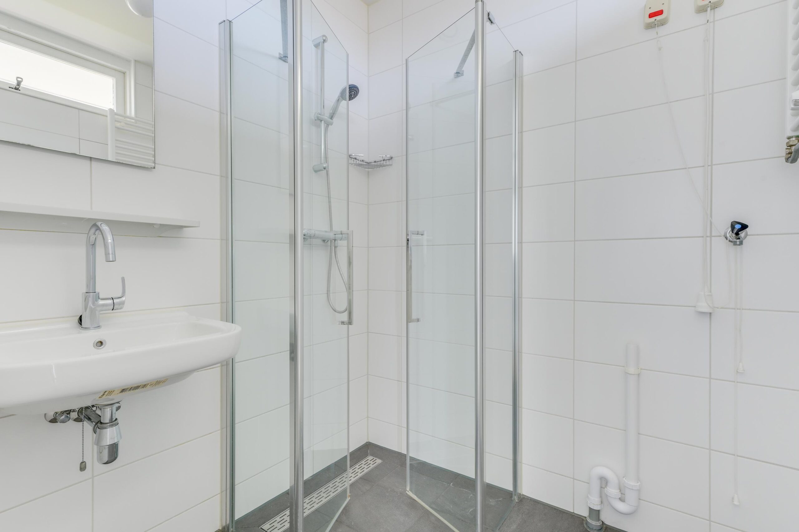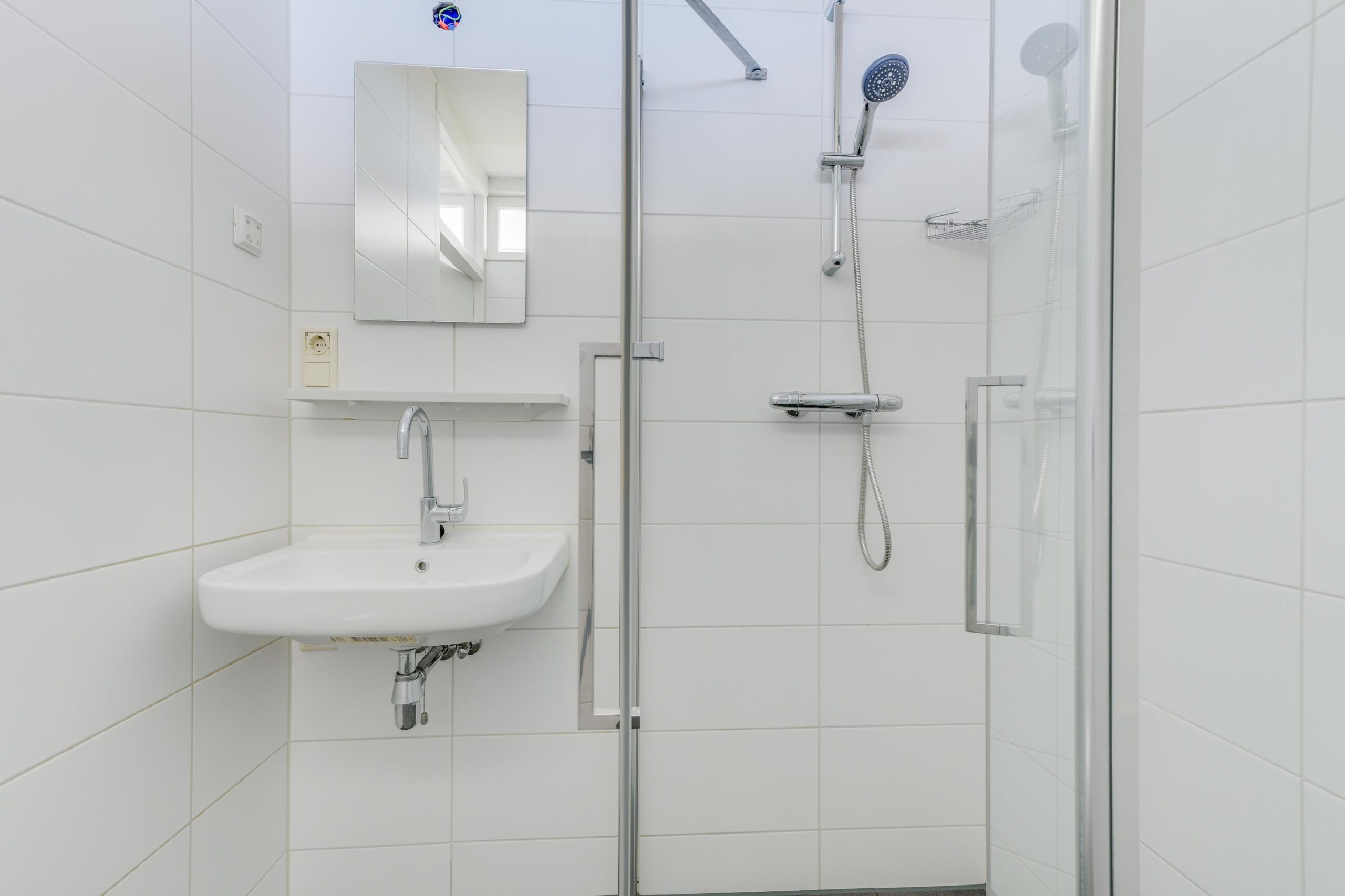 Aansluitend aan de keuken bevindt zich de badkamer (ca. 3,5 m²), uitgerust met een wastafel, inloopdouche en wasmachineaansluiting. De ruime en lichte woonkamer (ca. 22,5 m²) vormt het hart van de woning en geeft toegang tot de grotere slaapkamer (ca. 13,5 m²).