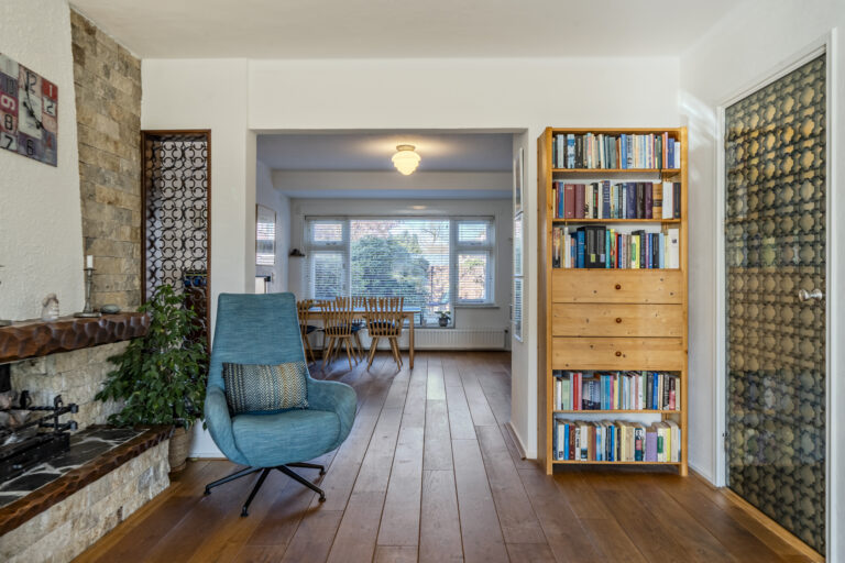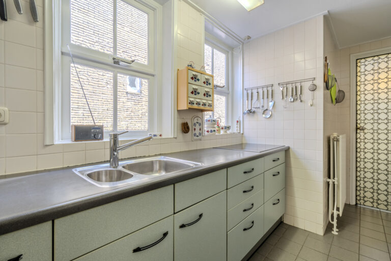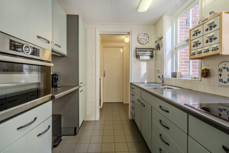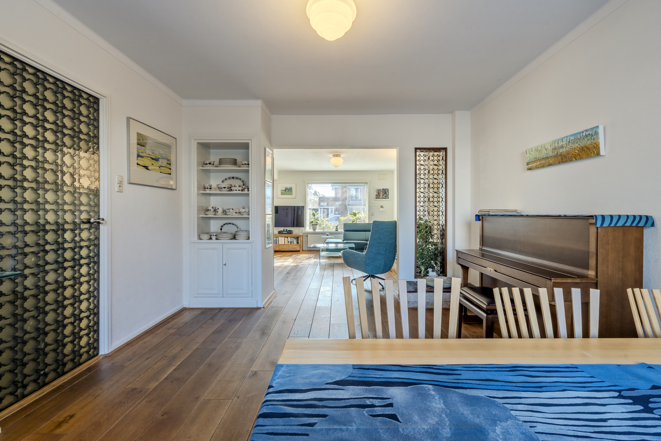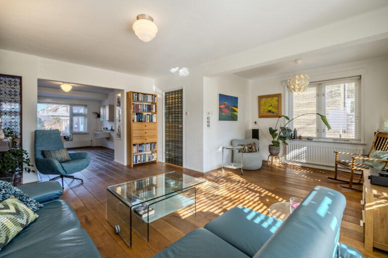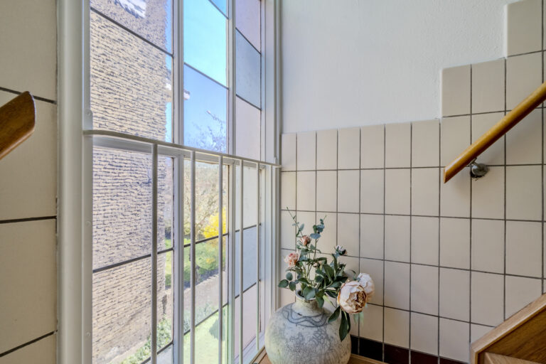 Vanuit de hal worden direct de eerste karakteristieke details zichtbaar, zoals het fraaie tegelwerk in Amsterdamse School stijl, die de woning meteen een authentiek en warme uitstraling geeft.