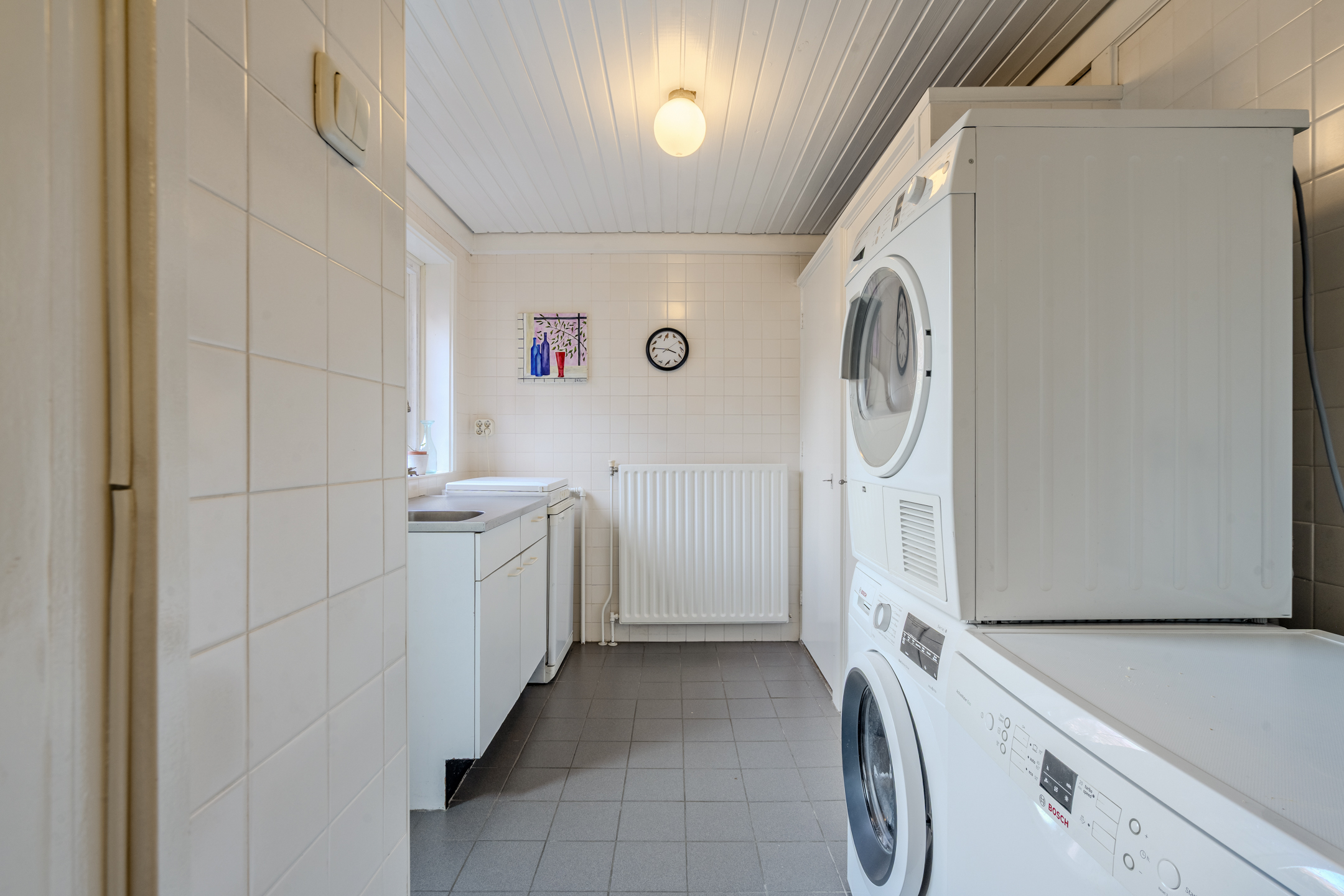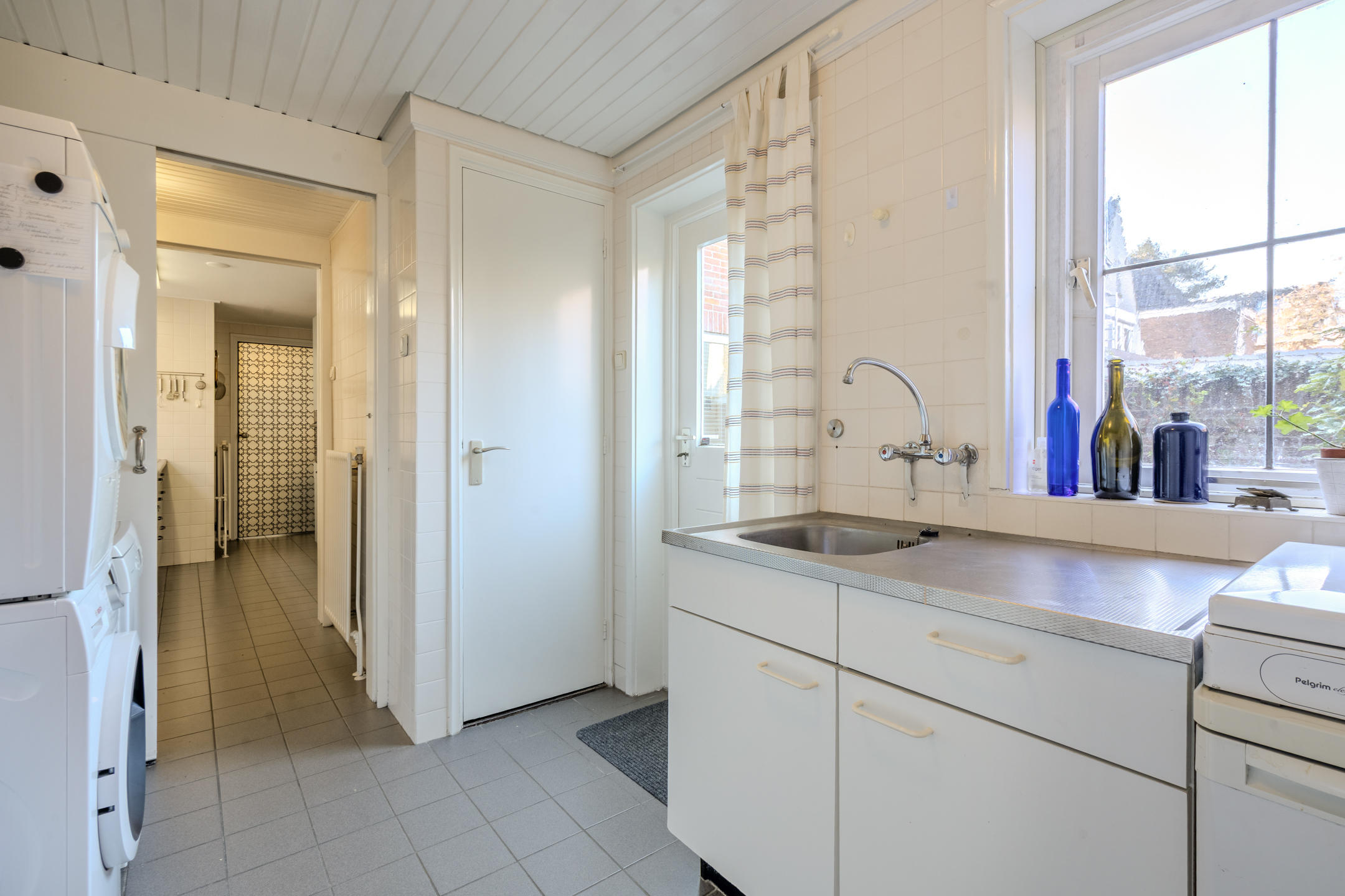 Middels een open toog in de keuken komt u in een aparte hal met toegang tot de bijkeuken en toegang tot de garage. De betegelde bijkeuken ca 8 m² heeft een keukenblok en wasmachine- droger aansluiting. Hier treft u ook de achterdeur naar de tuin.