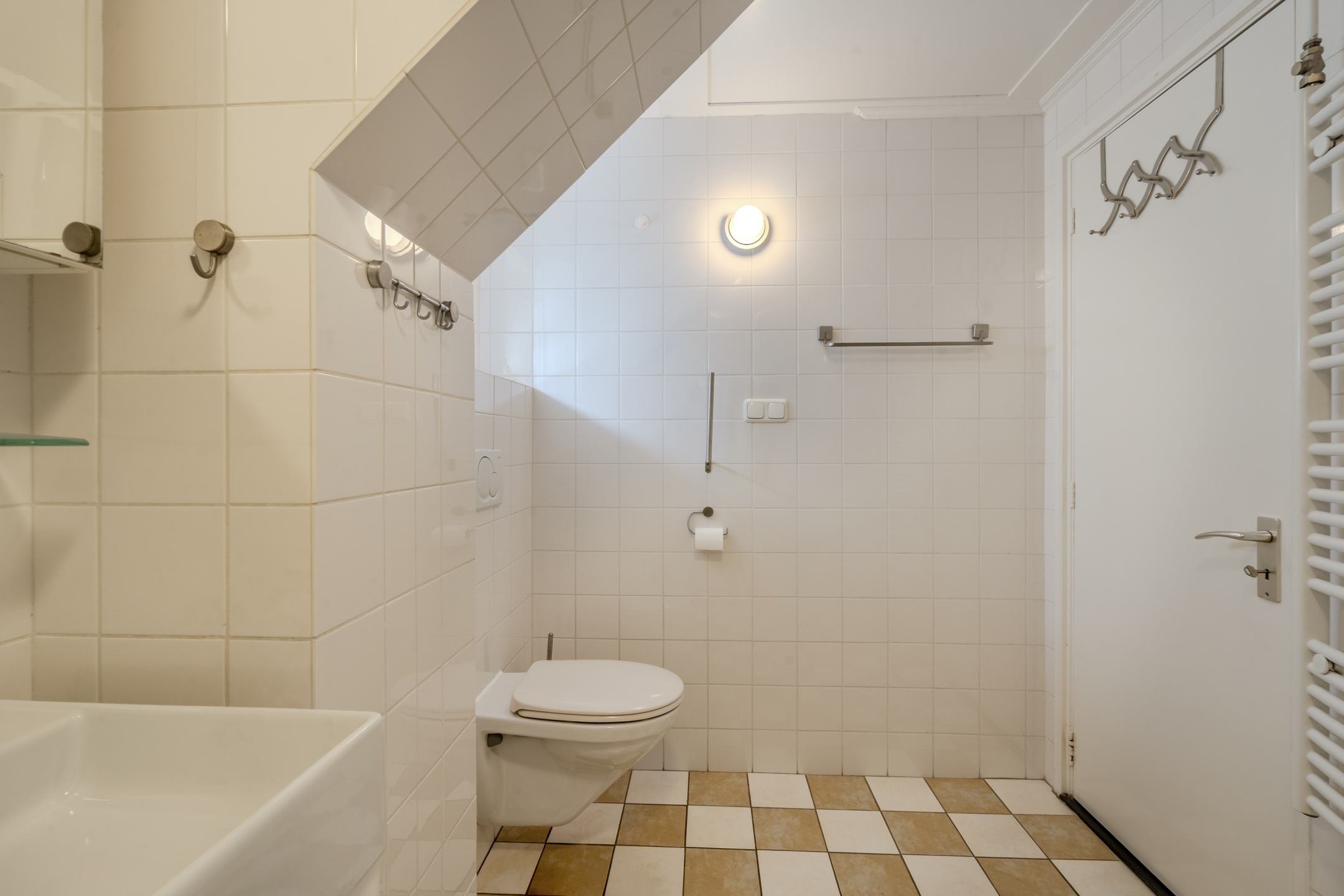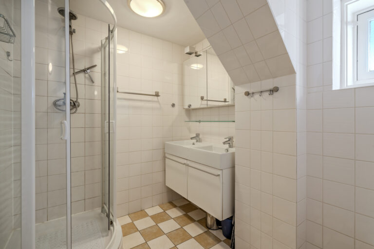 De nette badkamer is voorzien van een tweede toilet, dubbele wastafel met meubel en een douchecabine.