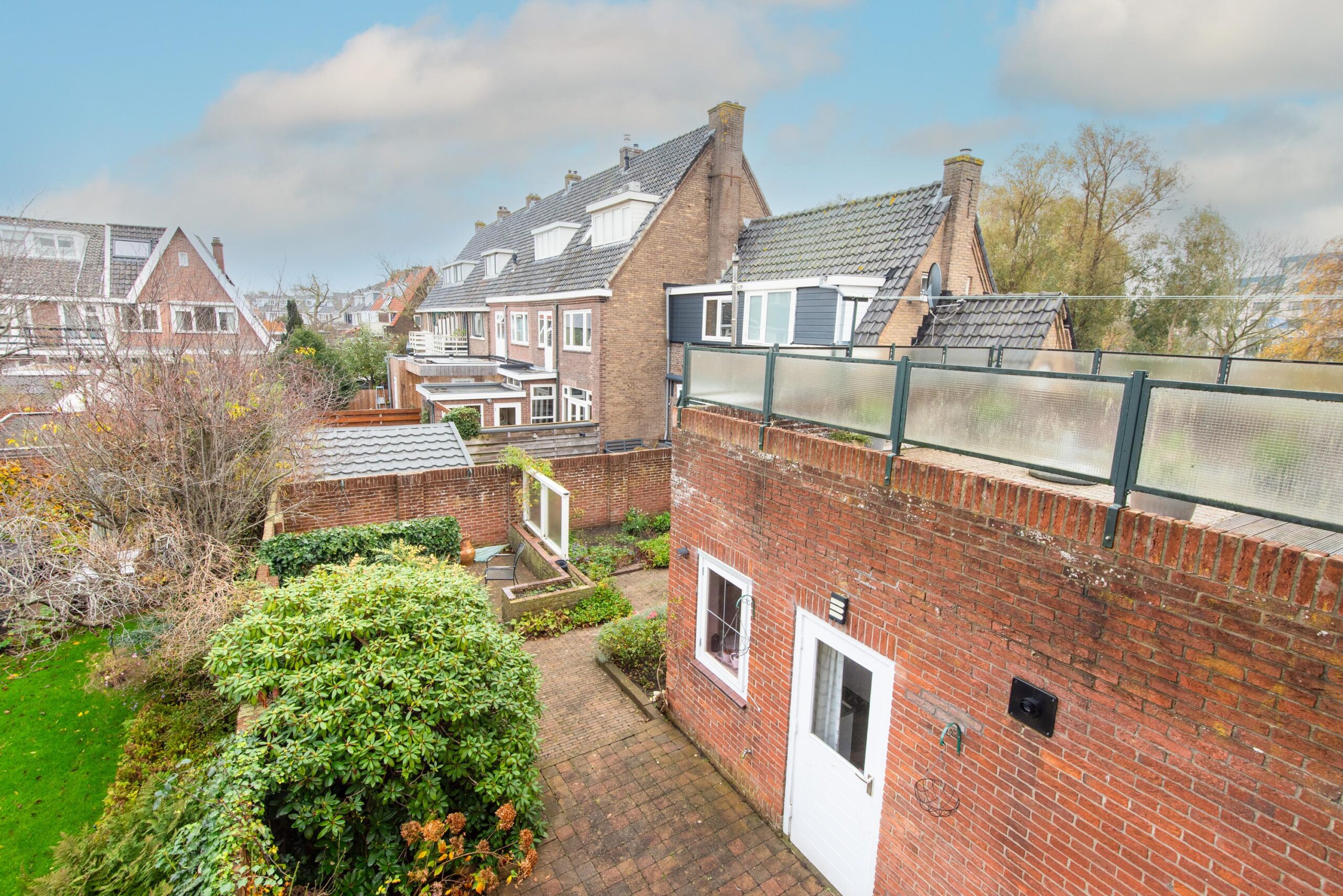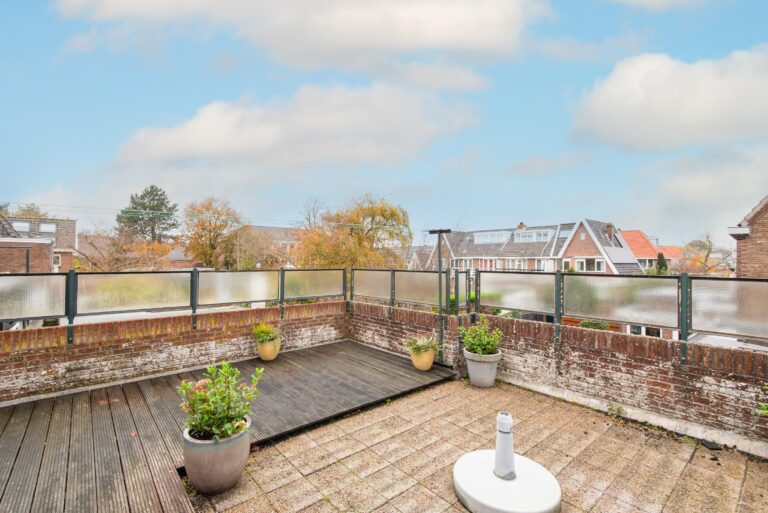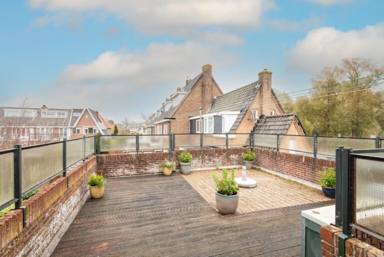 Dit ruime dakterras met vlonder is gelegen op het noordoosten en heeft uitzicht over de tuin en richting het water van de Houtvaart.