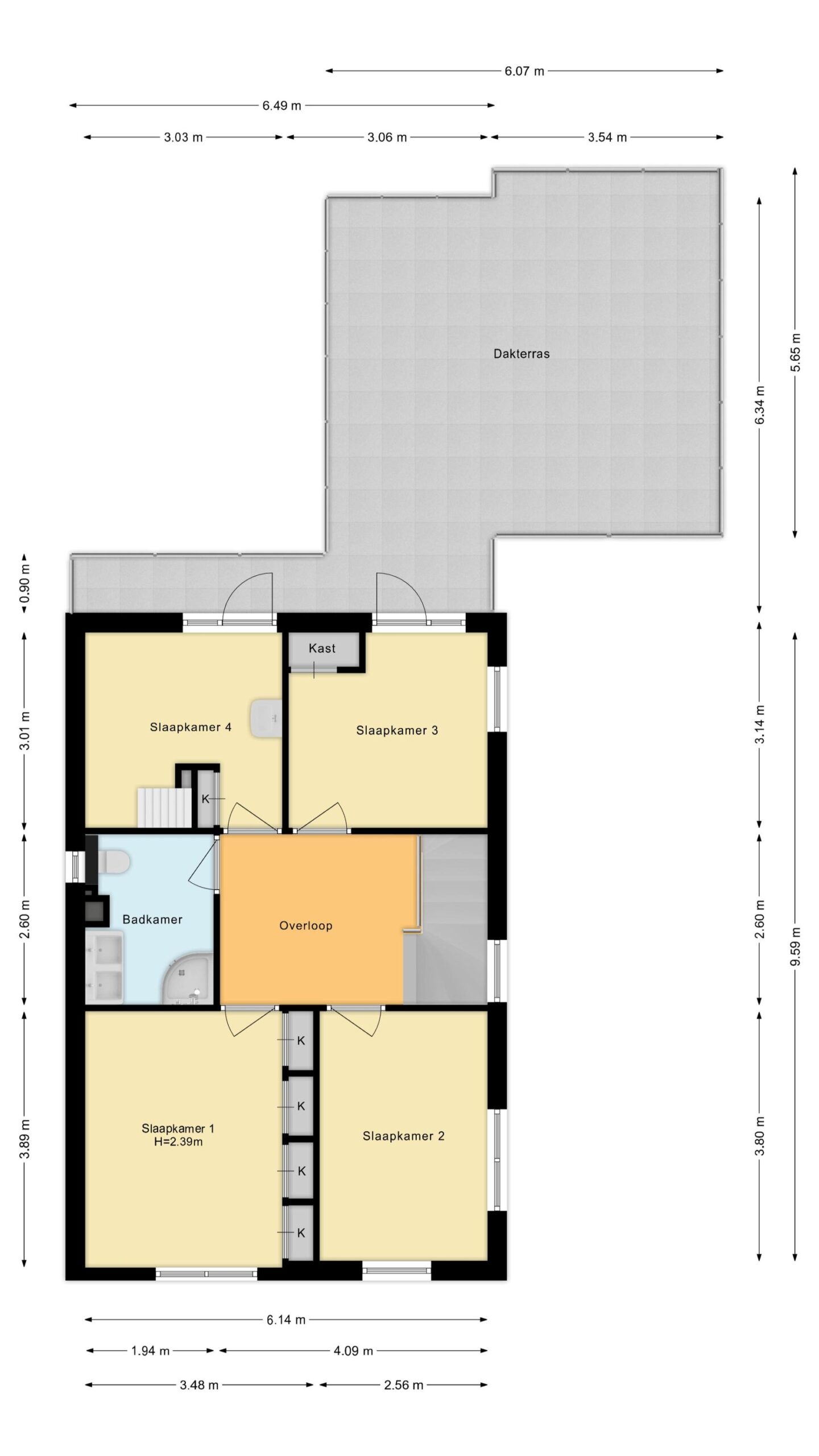 Vanaf de overloop van ca. 8 m² is er toegang tot de vier slaapkamers van ca. 14, 10, 9 en 9 m². De grootste slaapkamer is voorzien van handige inbouwkasten.