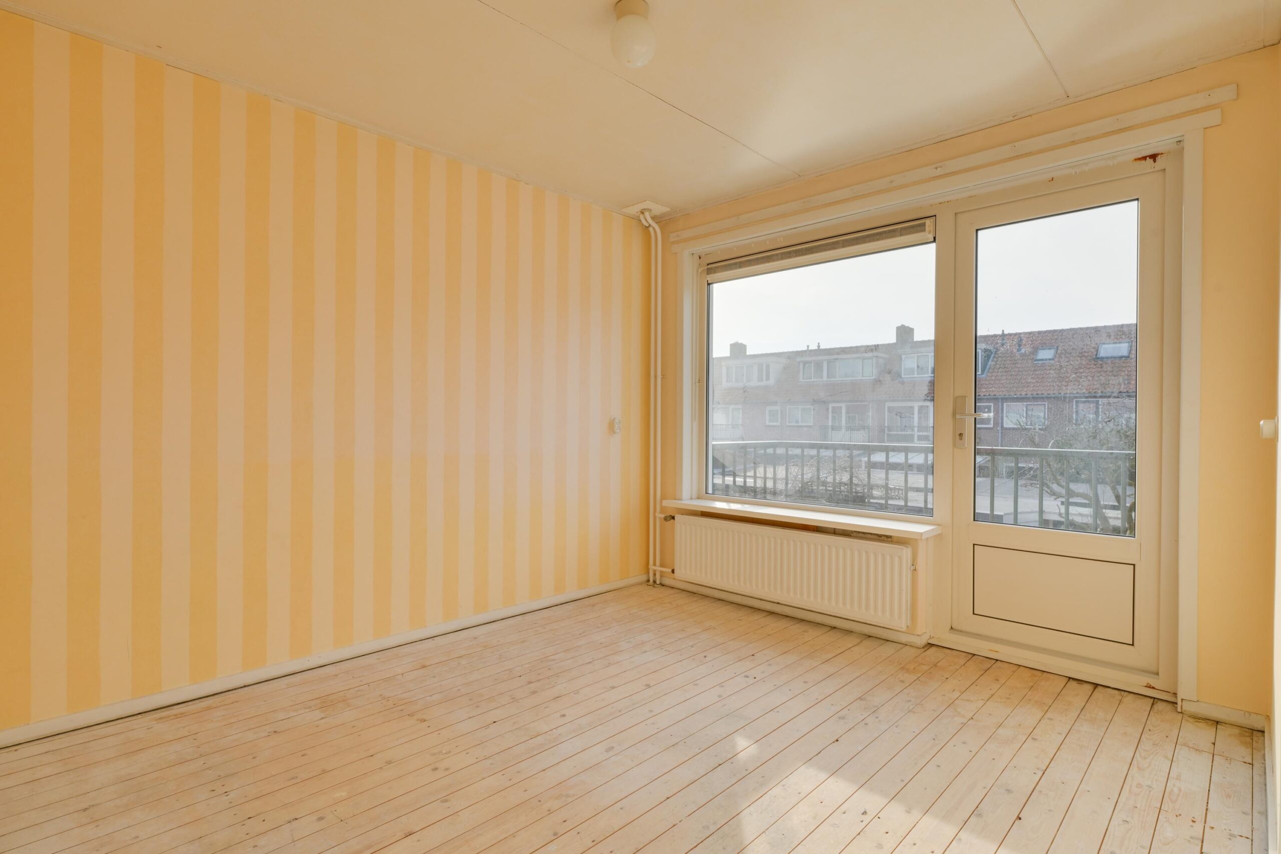 Op de eerste verdieping vind je drie slaapkamers (ca. 7, 10 en 11 m²), waarvan twee met een vaste kast. De grootste slaapkamer aan de achterzijde geeft toegang tot een klein balkon. De badkamer is eenvoudig ingericht met douche en wastafel.