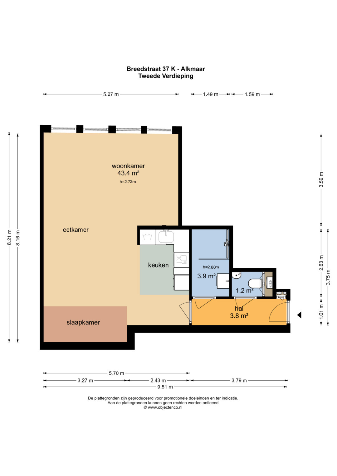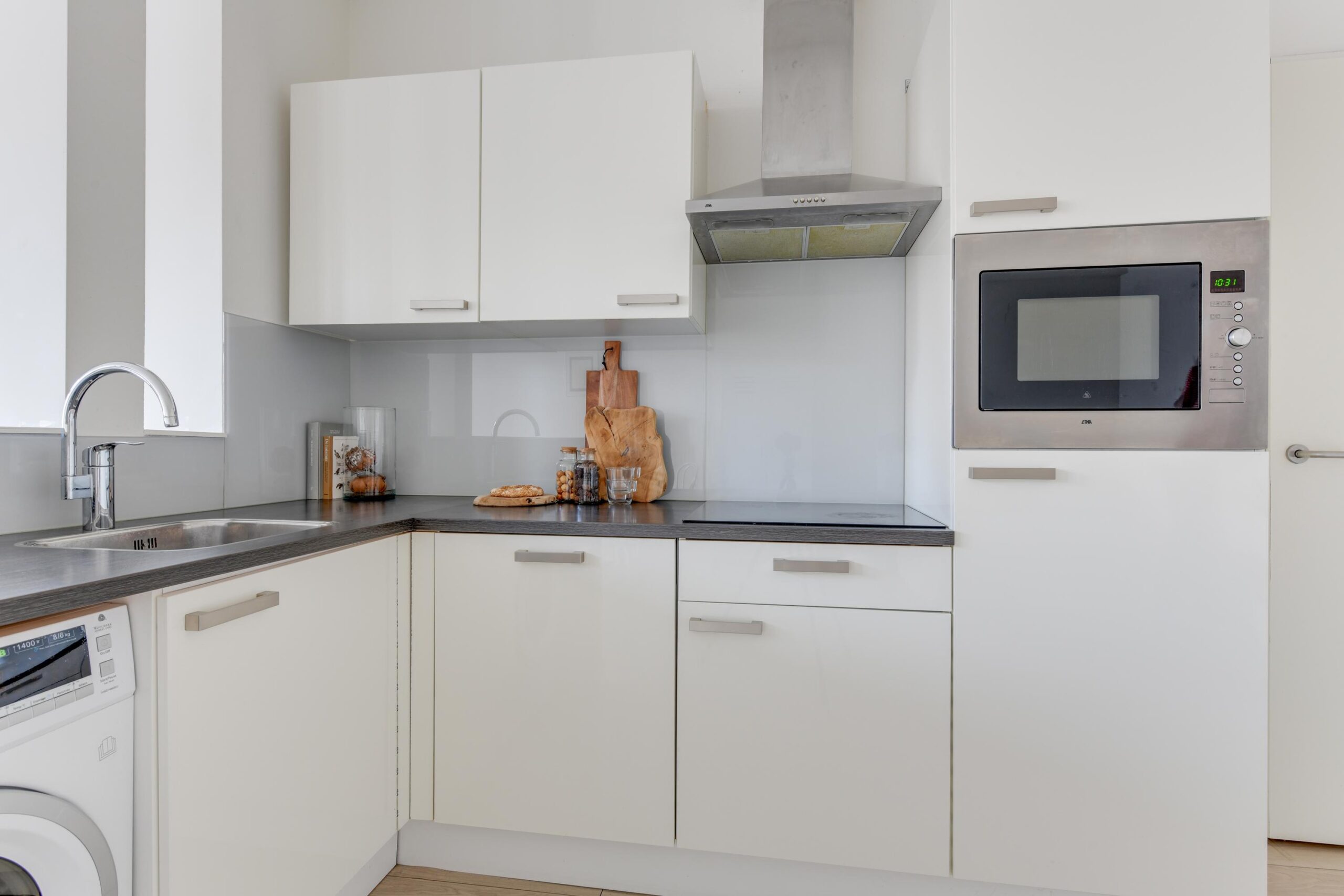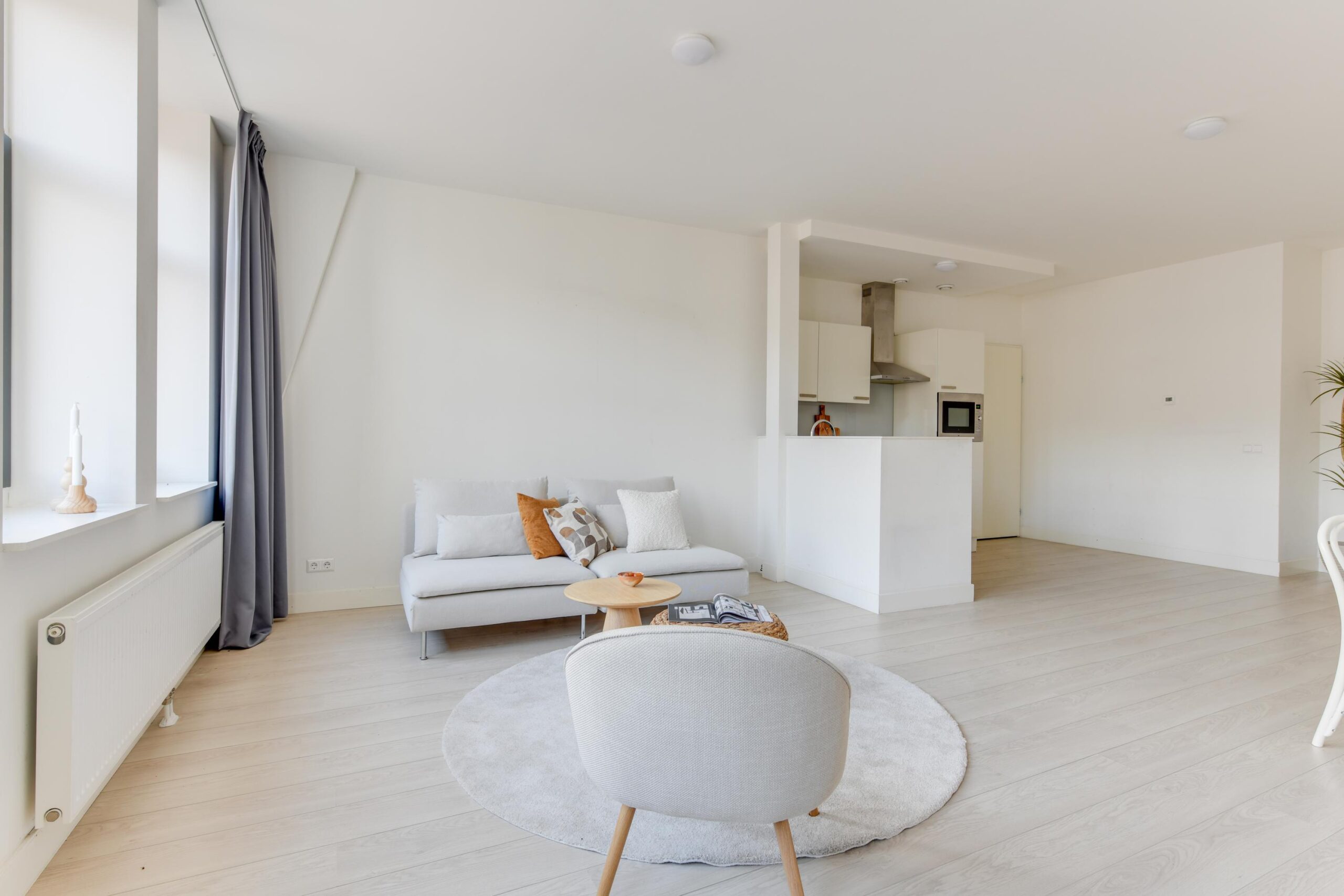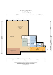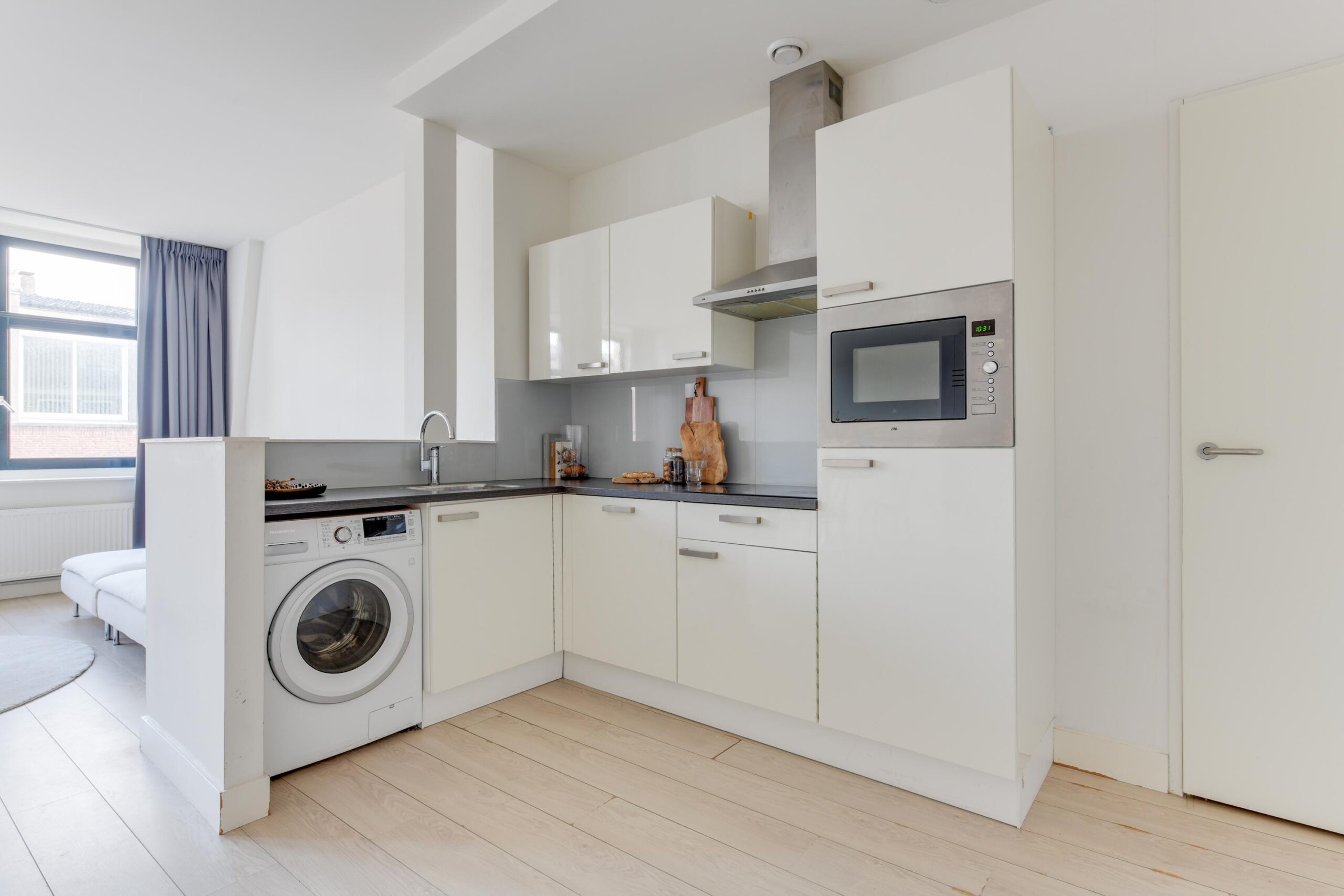Entree/hal (ca. 4 m²) met toegang tot het keurig nette toilet met fonteintje en de fraai tot boven aan toe betegelde badkamer met inloopdouche, wastafel met wastafelmeubel en design radiator. Vervolgens komt u in de strak wit gestuukte lichte woonkamer (ca. 43m²) met veel lichtinval, Hier is met een roomdivider eenvoudig een slaapplek te creëren. De halfopen moderne keuken heeft een wasmachine aansluiting en diverse inbouwapparatuur zoals een koelkast, vaatwasser, elektrische kookplaat en afzuigkap. Het gehele appartement is voorzien van een laminaatvloer.