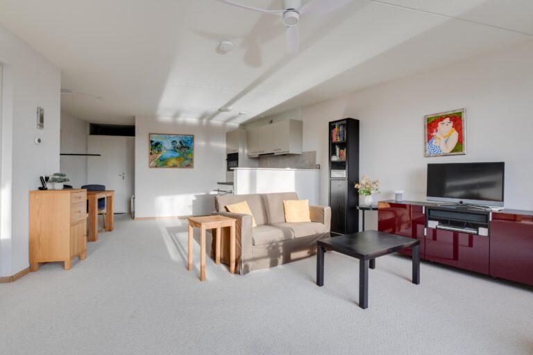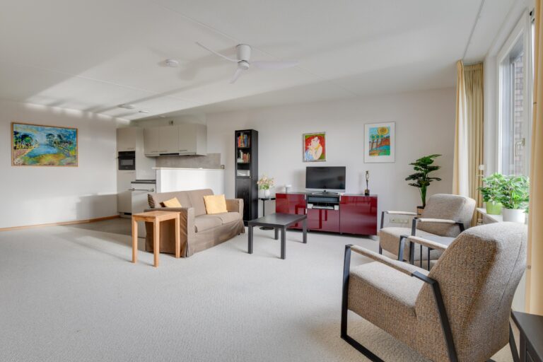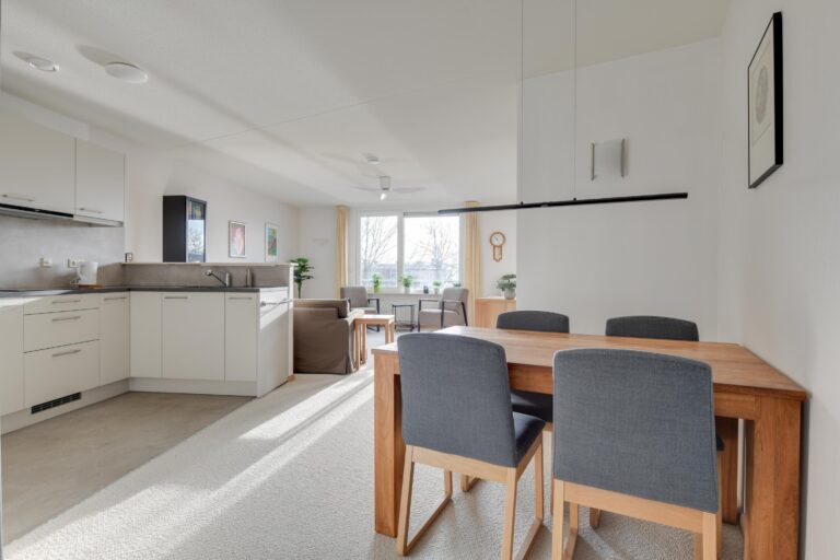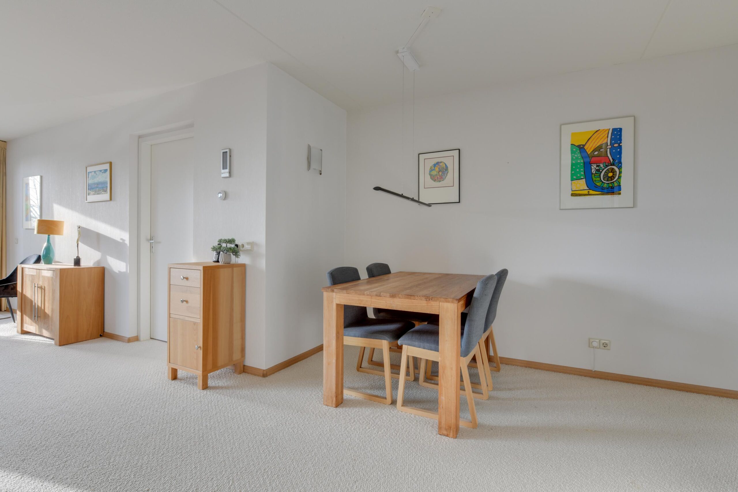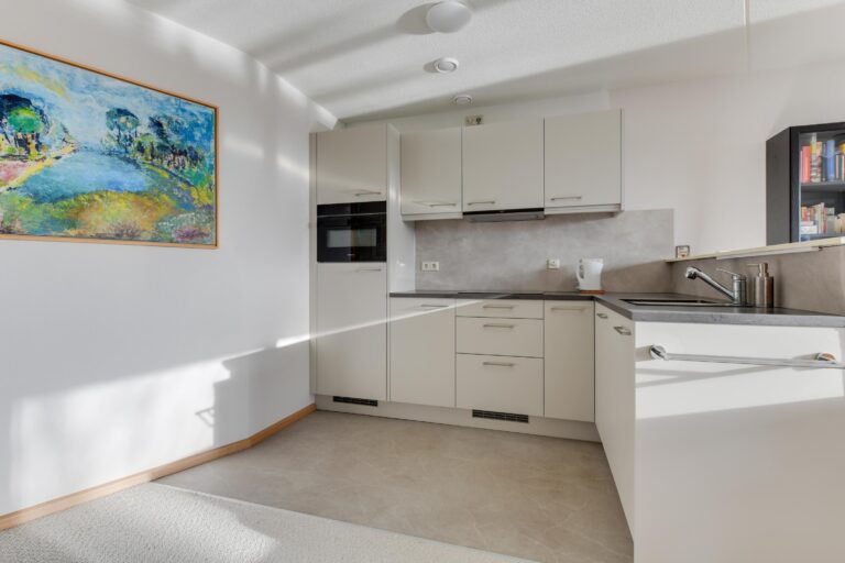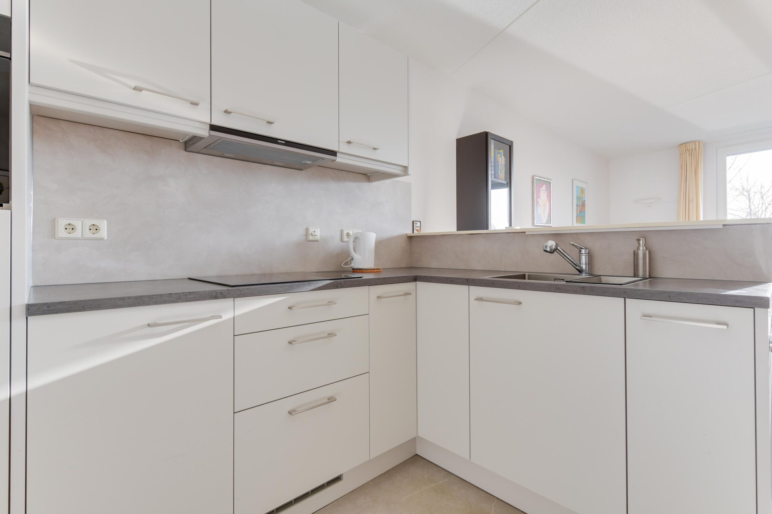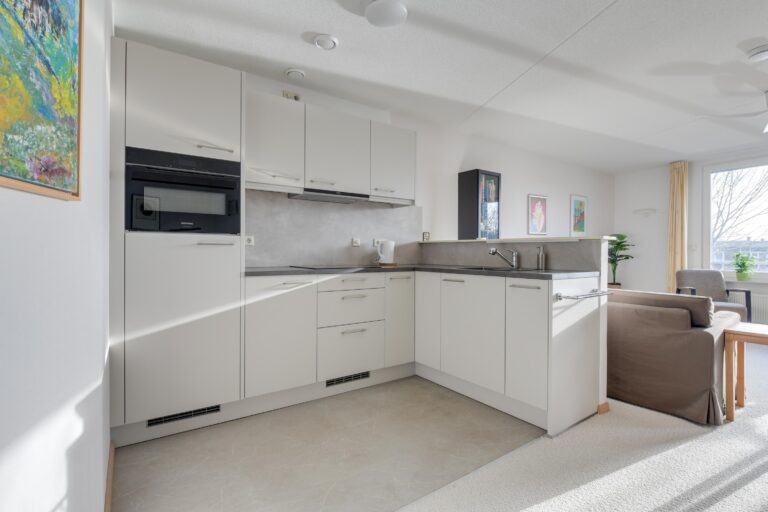 De lichte woonkamer totaal ca. 35 m² met grote raampartijen heeft een speelse indeling en een prachtig uitzicht over het water en het groen. De ruimte voelt open en ruimtelijk aan, en staat in directe verbinding met het zonnige balkon (ca. 9,8 m²) op het zuidoosten, een heerlijke plek om van uw ochtendkoffie of een goed glas wijn te genieten. De open hoekkeuken is recent vernieuwd en voorzien van moderne inbouwapparatuur, waaronder een inductiekookplaat, combi-magnetron, en koelkast. Dankzij de slimme opstelling beschikt u over veel kastruimte en een prettige werkhoogte, ideaal voor de kookliefhebber.