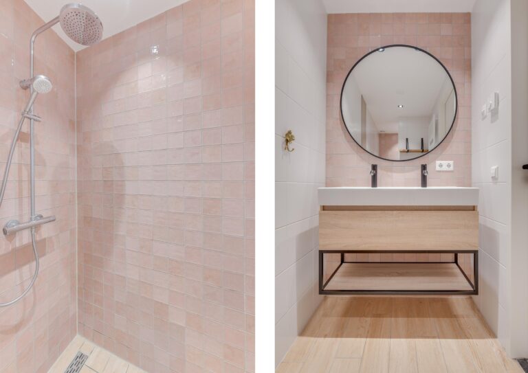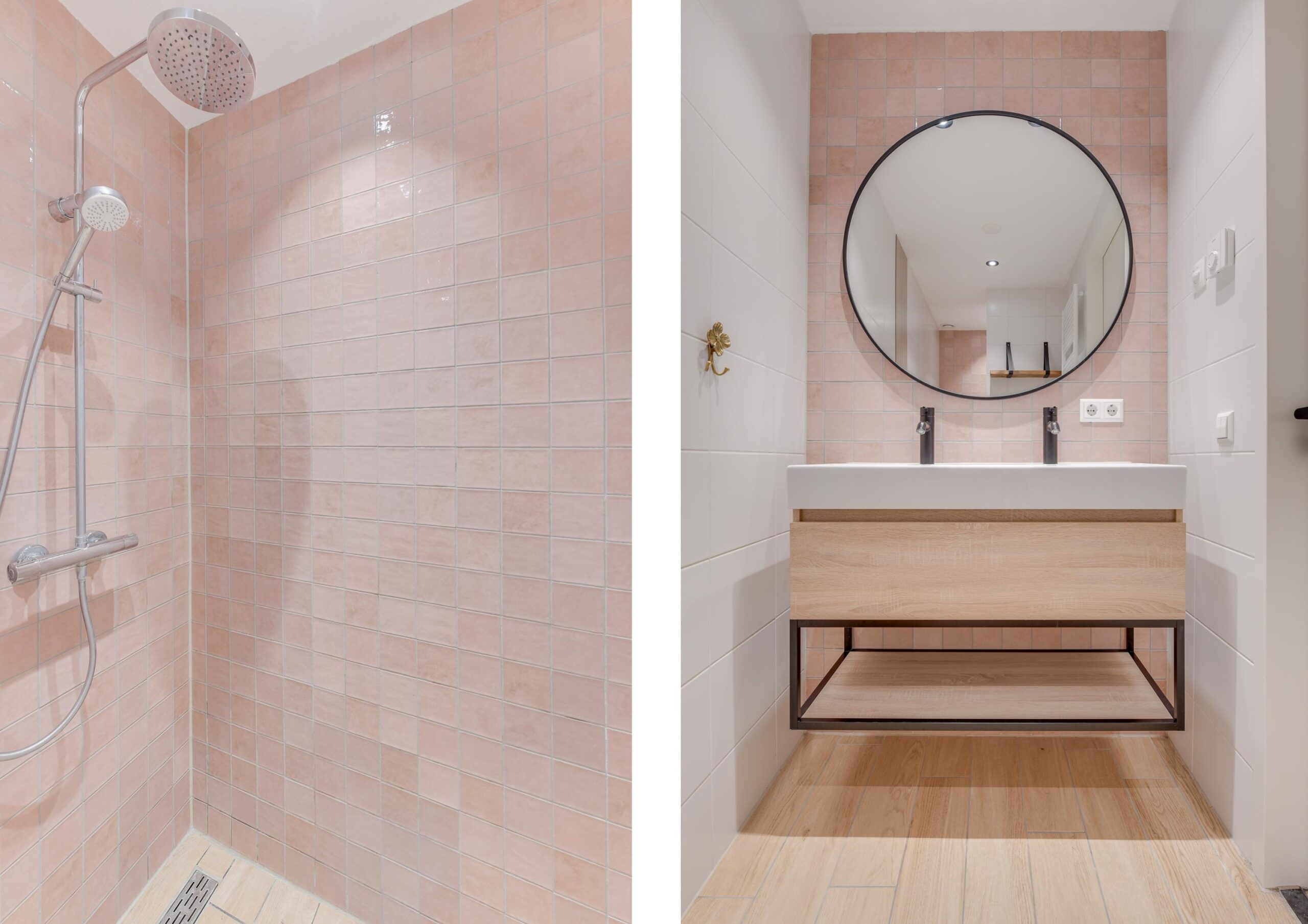 De badkamer (ca. 4,5 m²) is luxe afgewerkt in een lichte kleurstelling met stijlvolle roze accenten. Voorzien van een wastafelmeubel, designradiator, inloopdouche en tweede toilet.