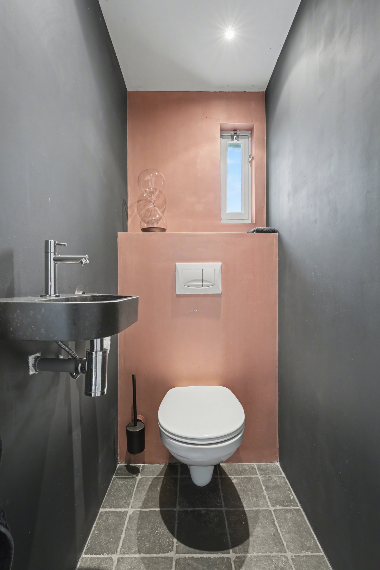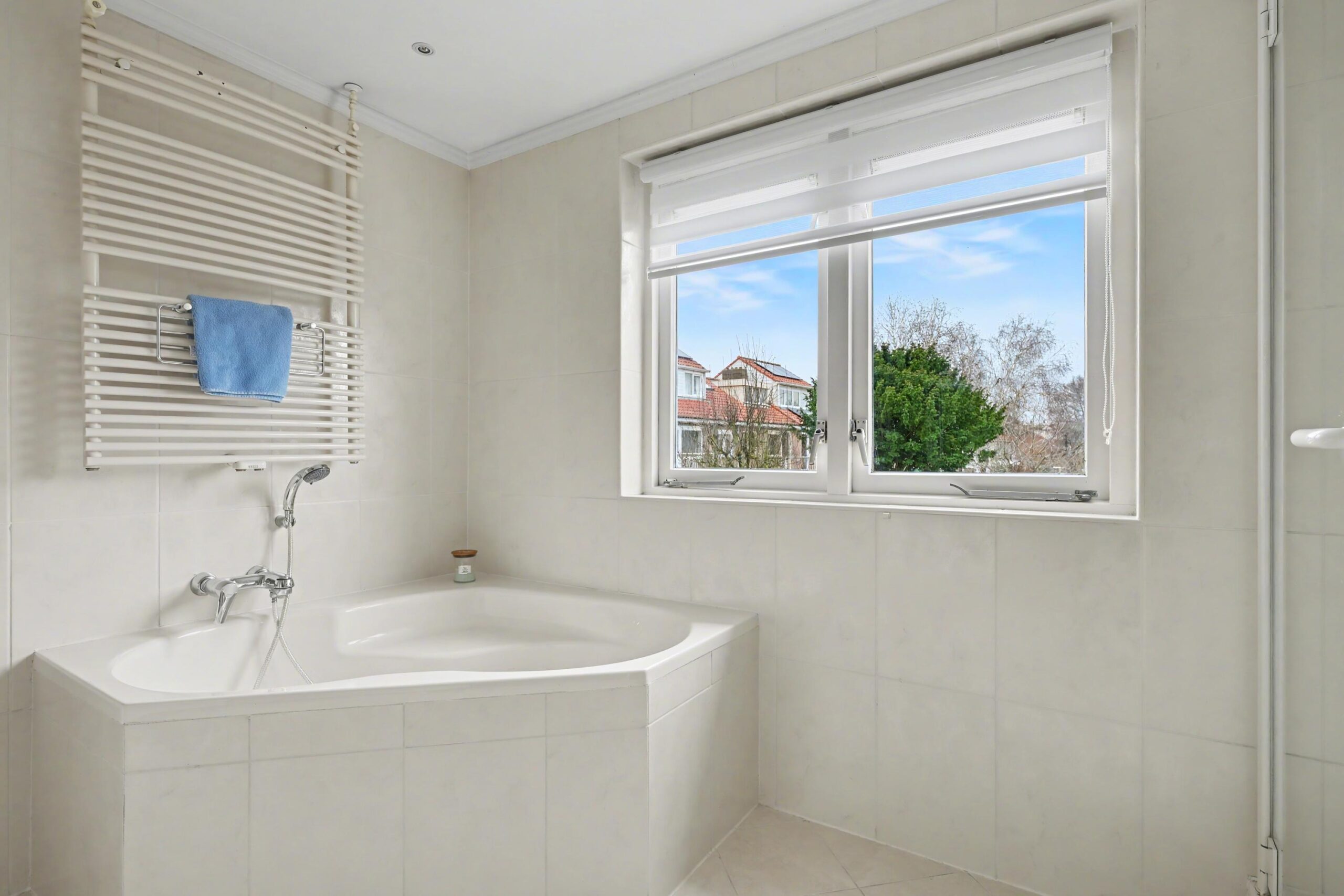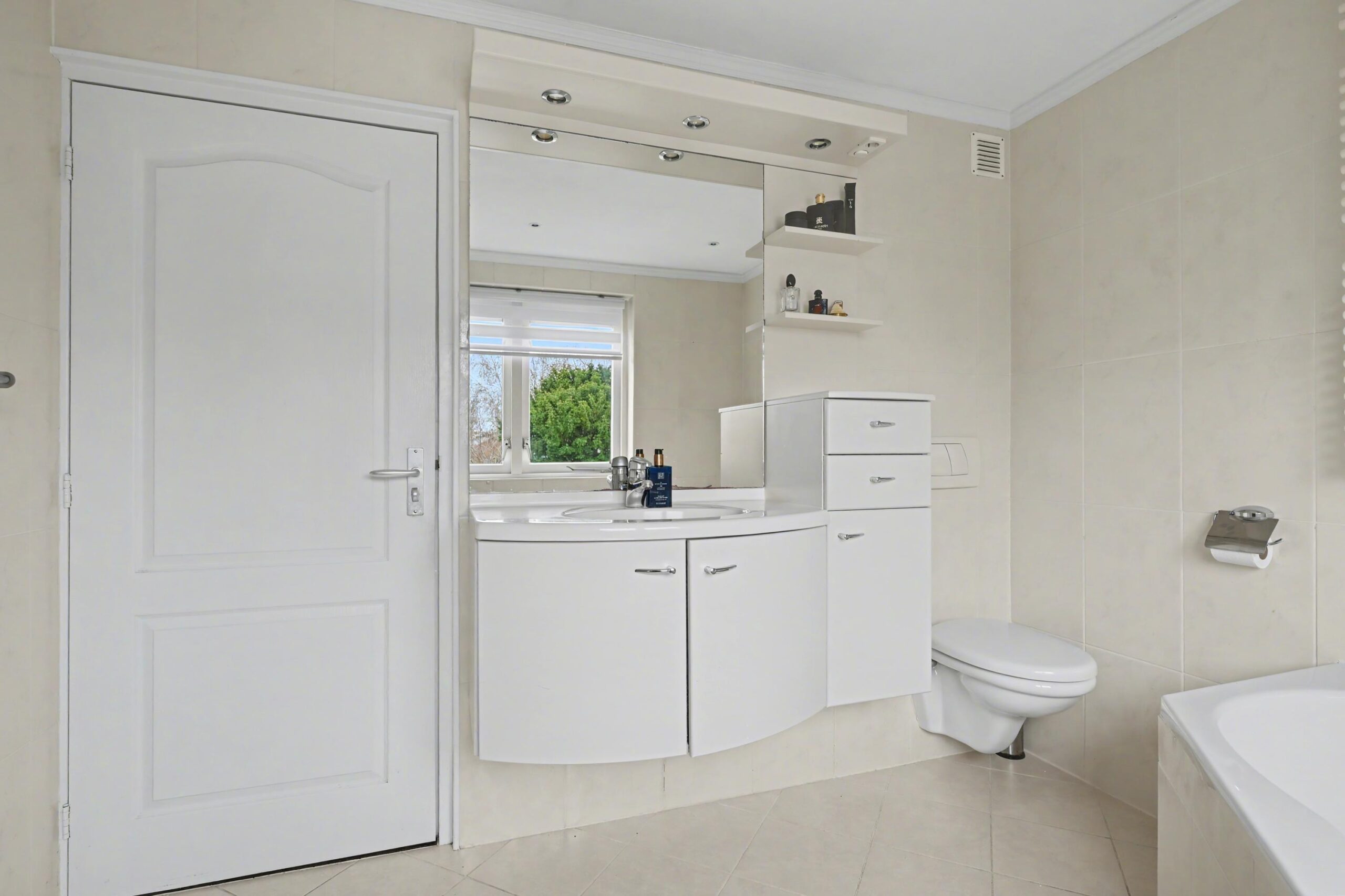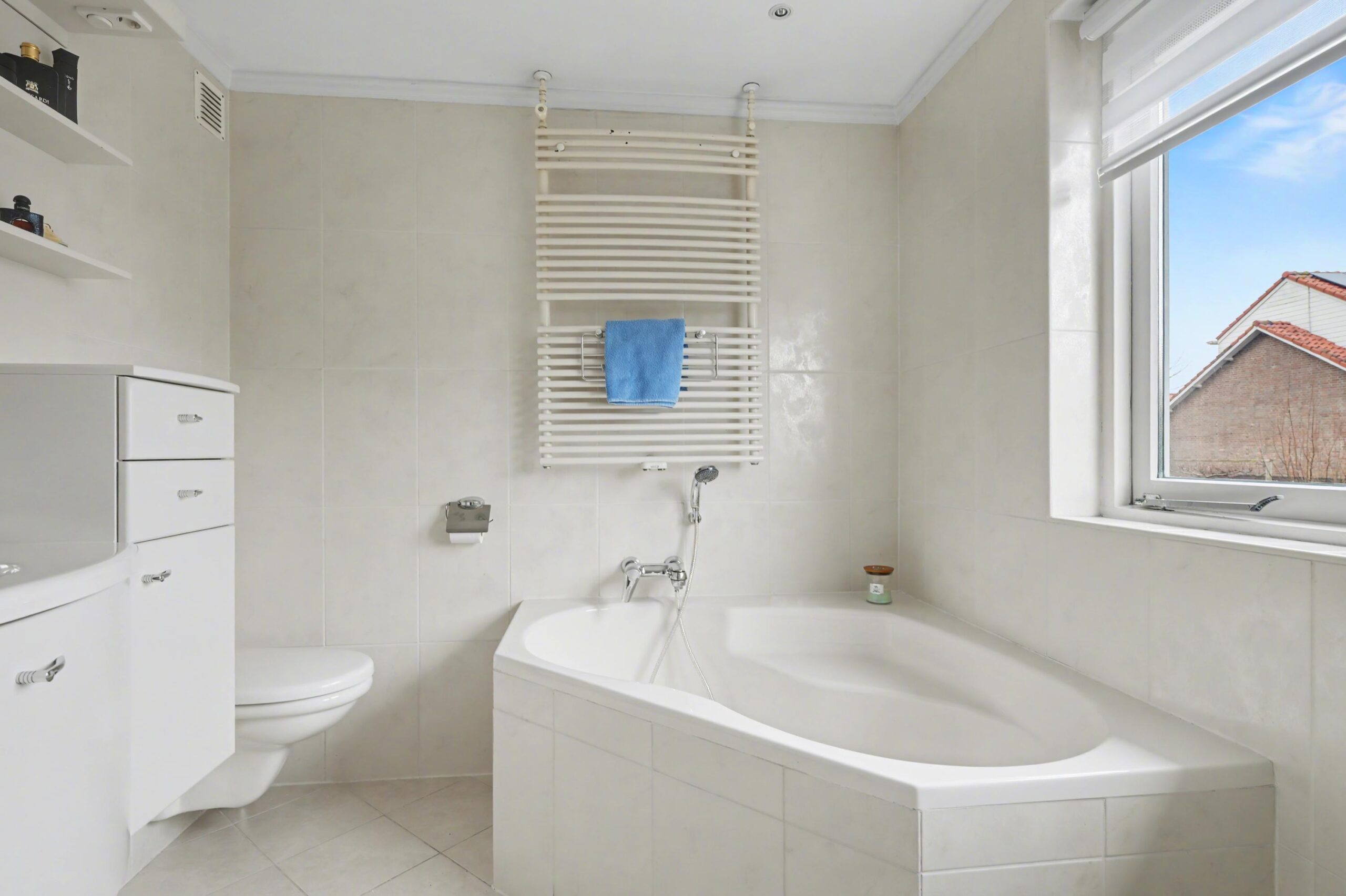 De ruime badkamer is voorzien van een ligbad, aparte douchehoek, wastafelmeubel met spiegel, tweede toilet, designradiator, vloerverwarming en inbouwspots.