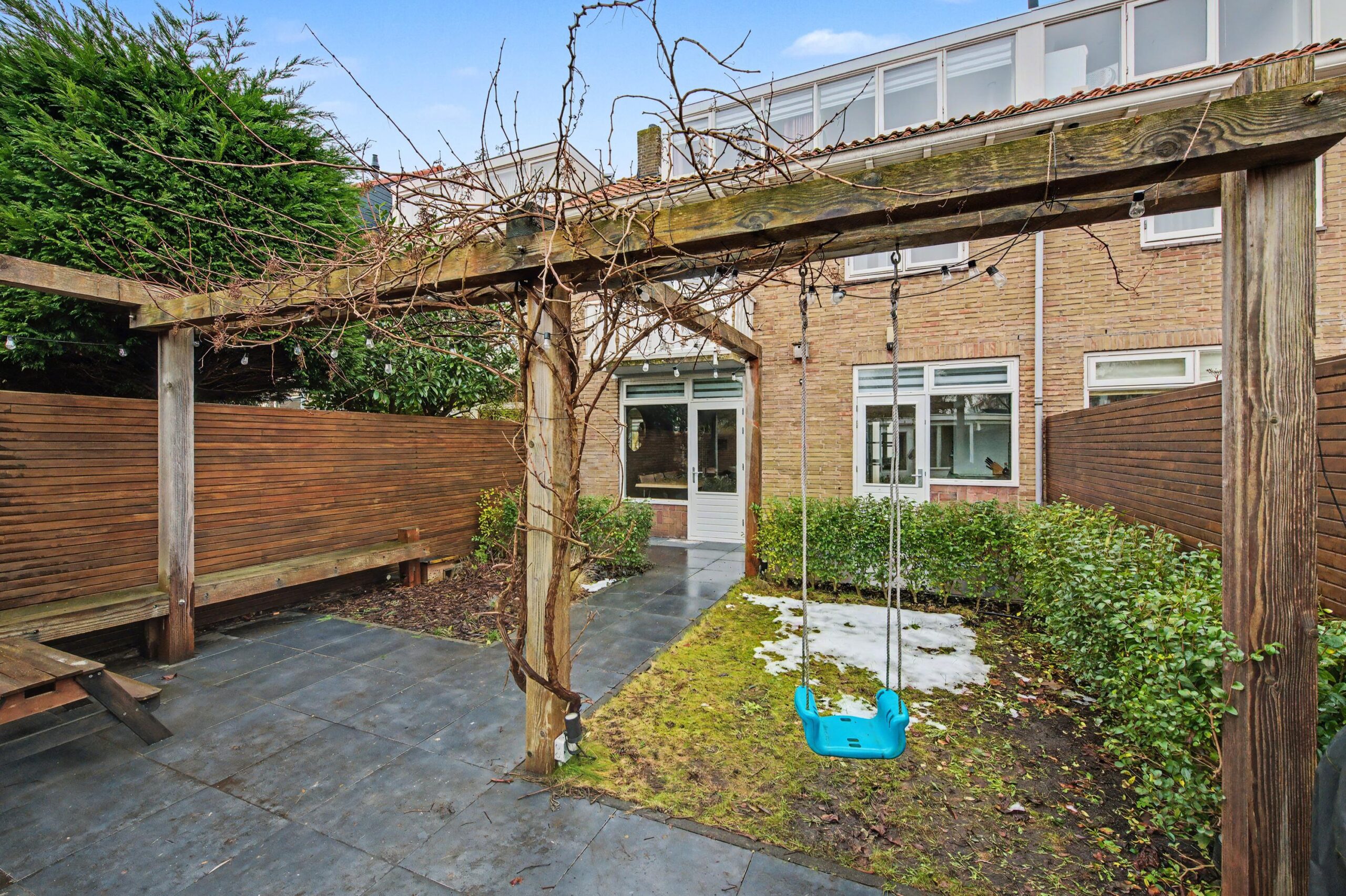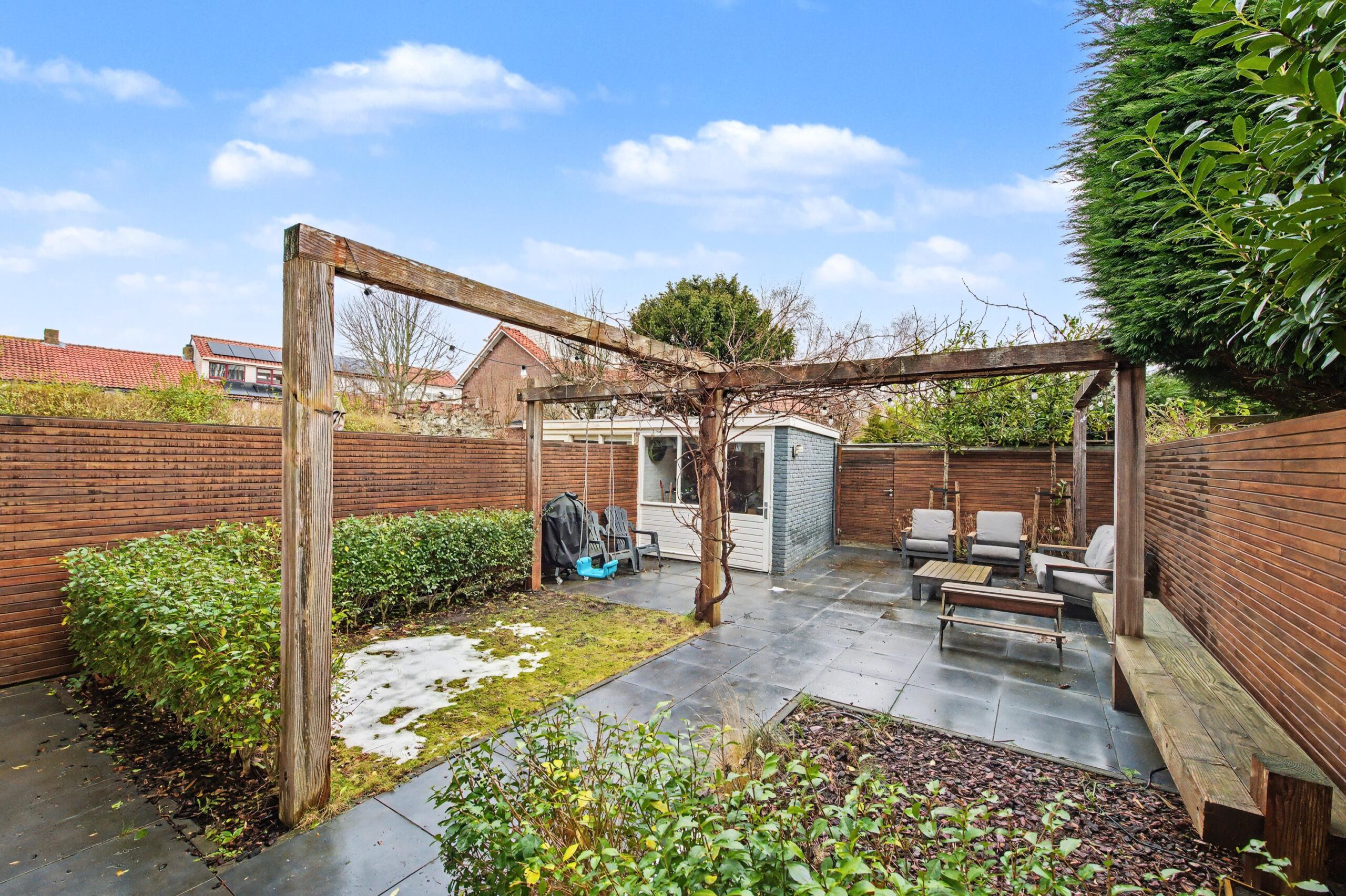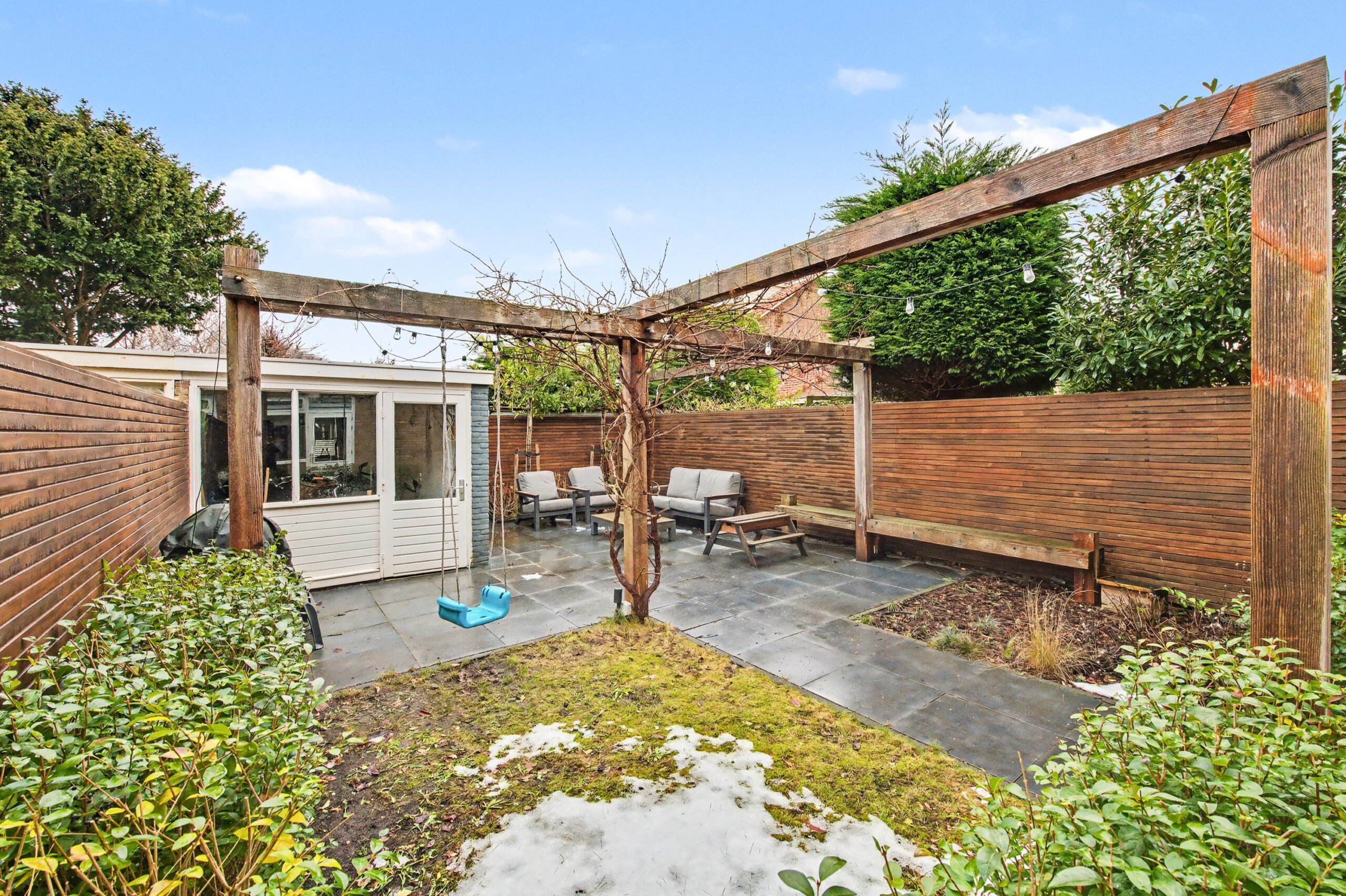 De circa 12 meter diepe achtertuin is sfeervol aangelegd en omheind met een padoek houten schutting. De tuin is deels betegeld en deels aangelegd met een gazon en beplanting. Over de robuuste pergola groeit een fraaie druif, wat zorgt voor een groene uitstraling met beperkt onderhoud. De tuin is bereikbaar via een achterom en beschikt over een berging voor fietsen en tuingereedschap.