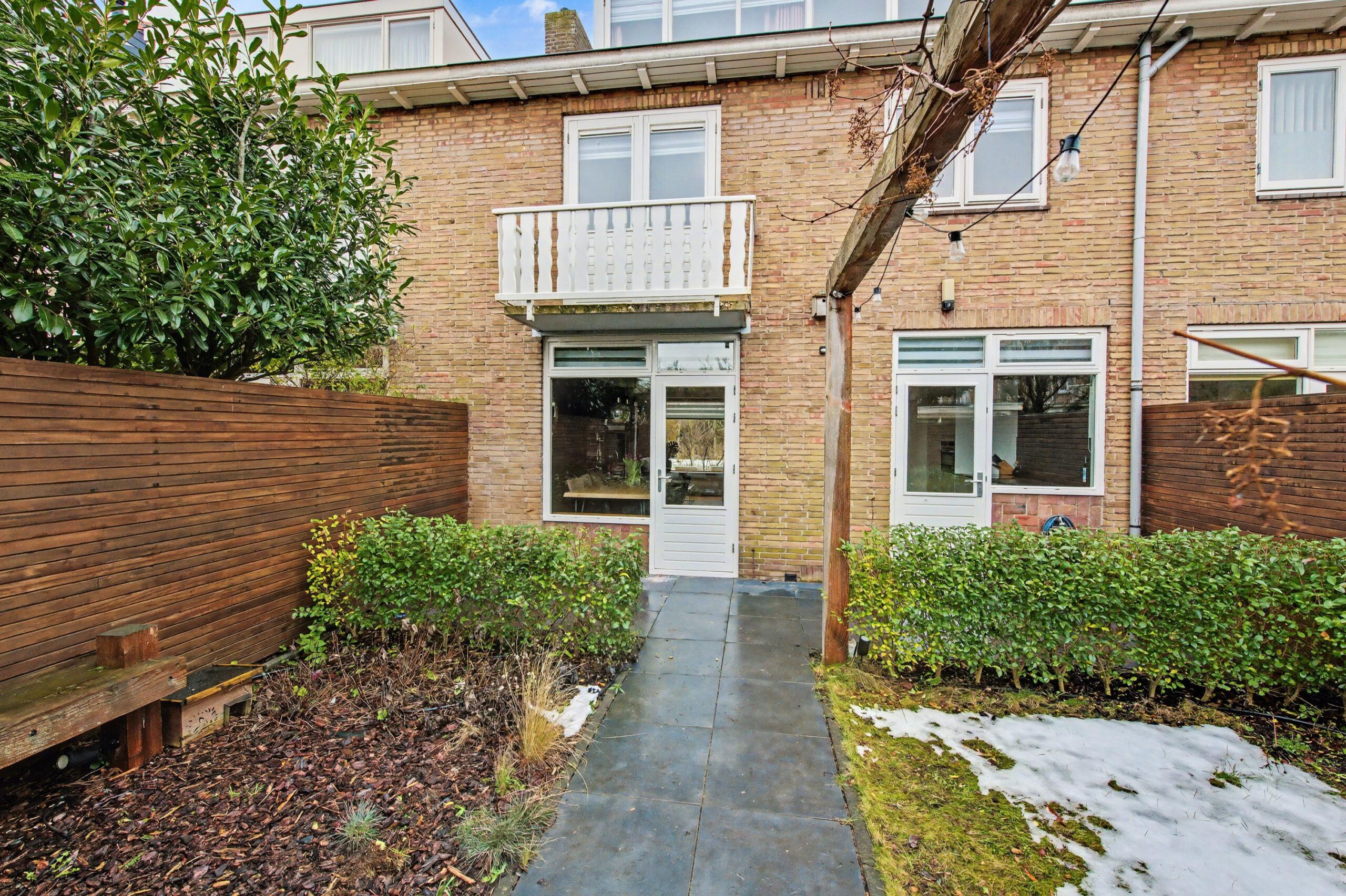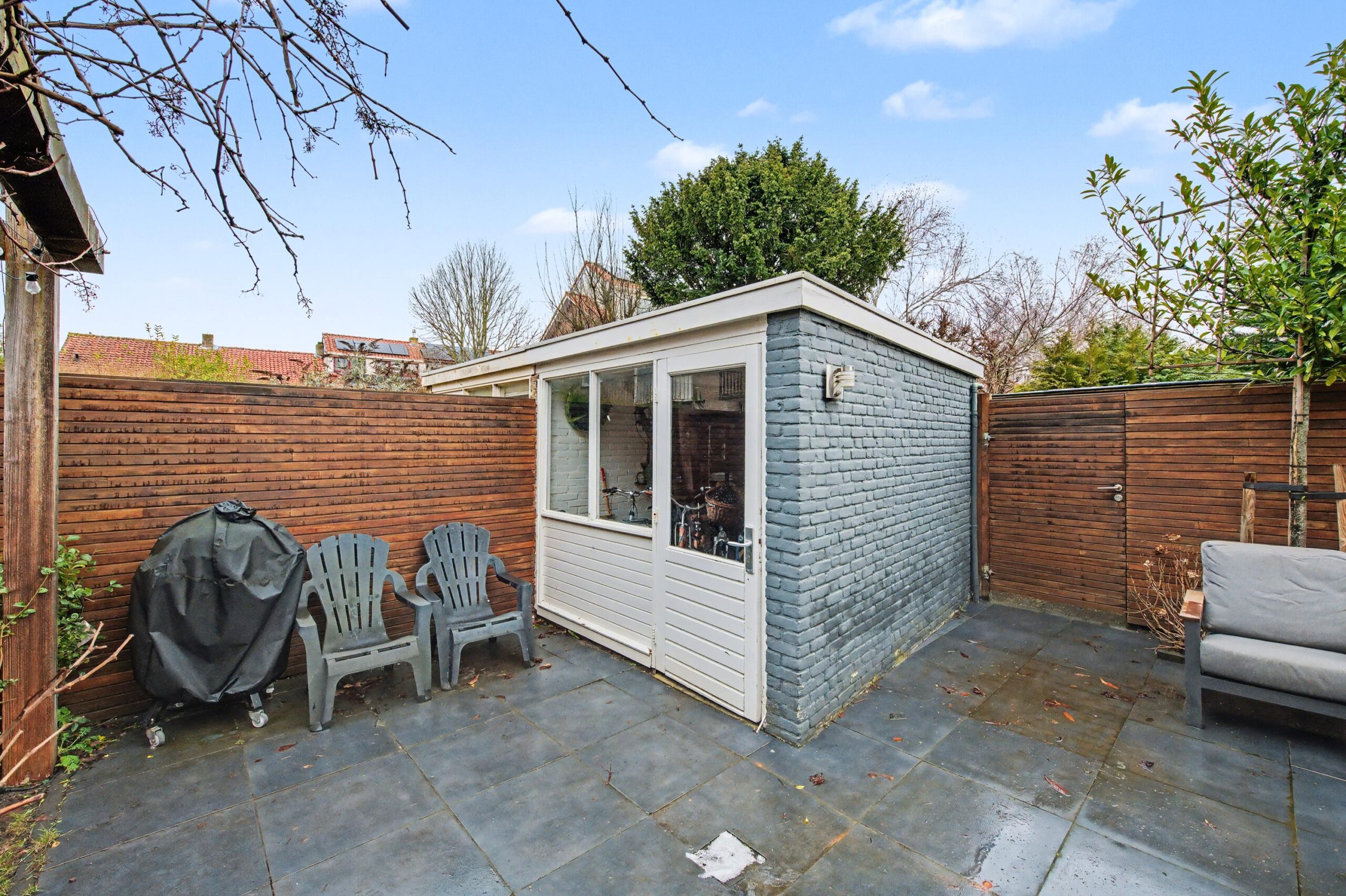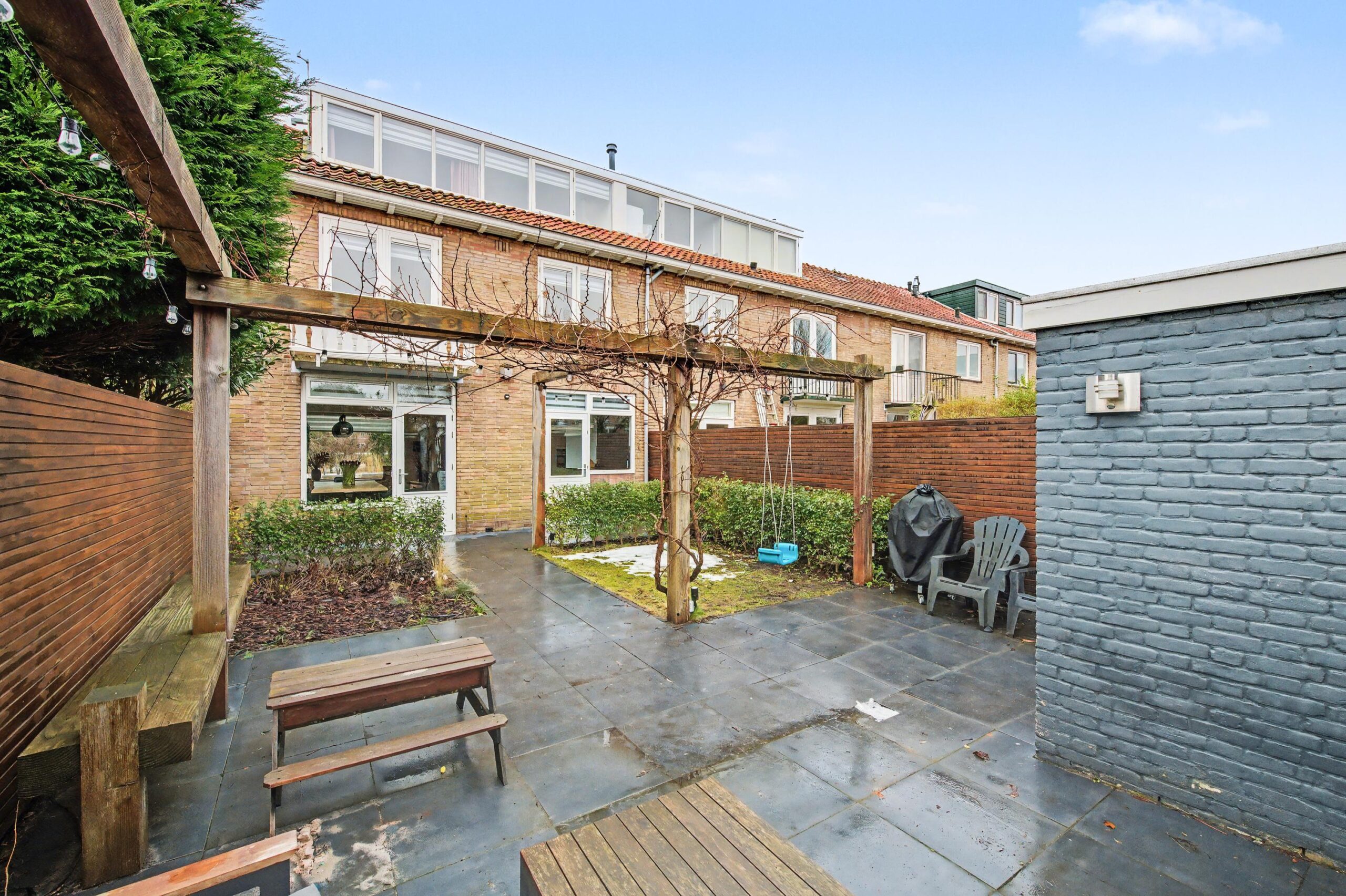 De circa 12 meter diepe achtertuin is sfeervol aangelegd en omheind met een padoek houten schutting. De tuin is deels betegeld en deels aangelegd met een gazon en beplanting. Over de robuuste pergola groeit een fraaie druif, wat zorgt voor een groene uitstraling met beperkt onderhoud. De tuin is bereikbaar via een achterom en beschikt over een berging voor fietsen en tuingereedschap.