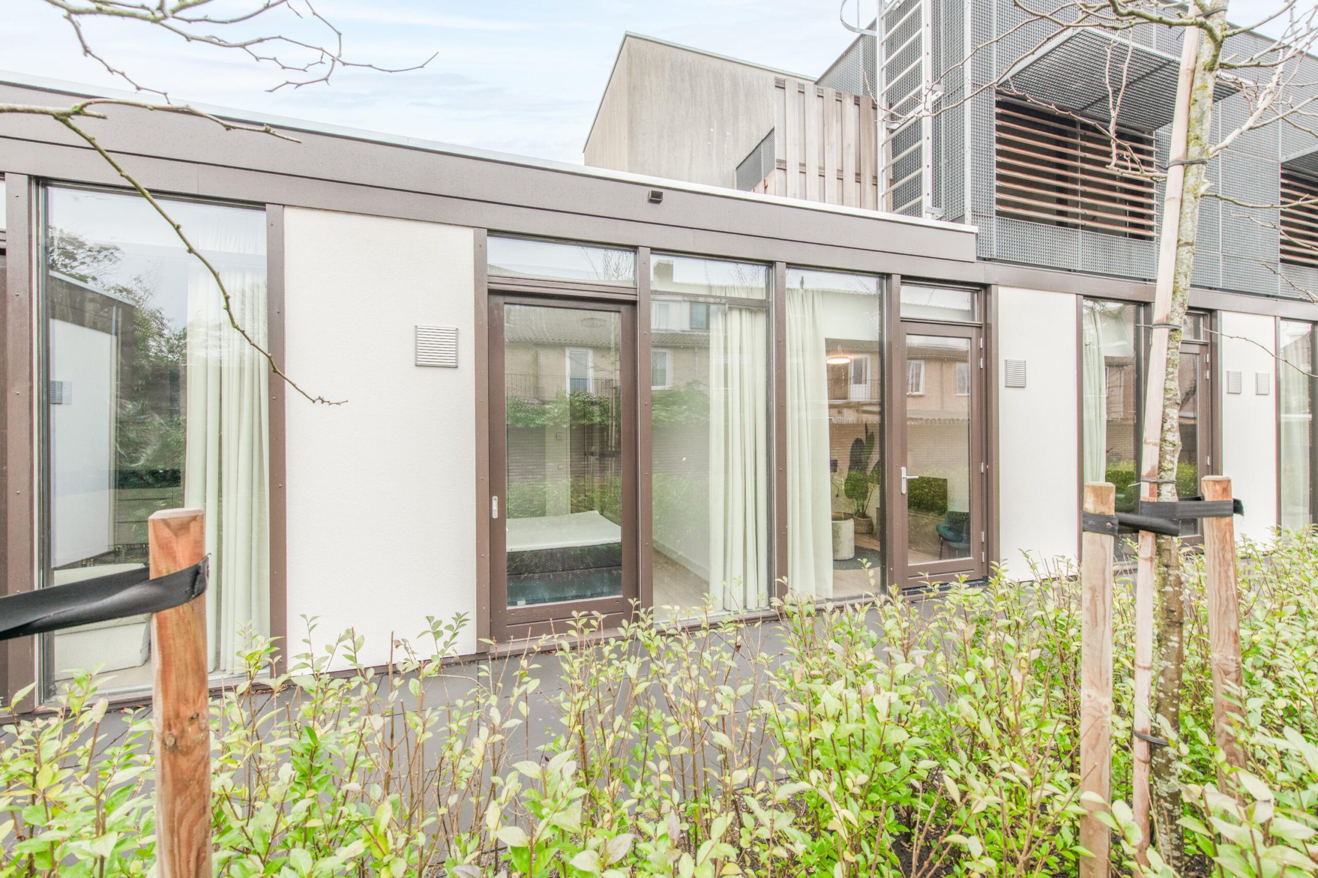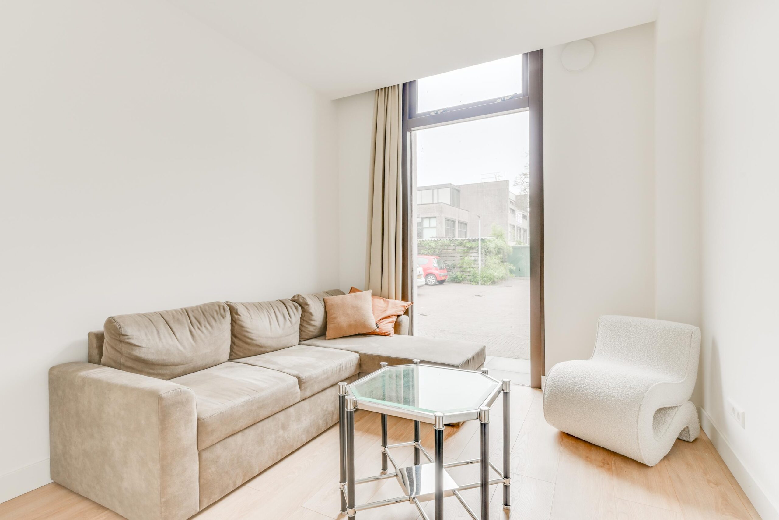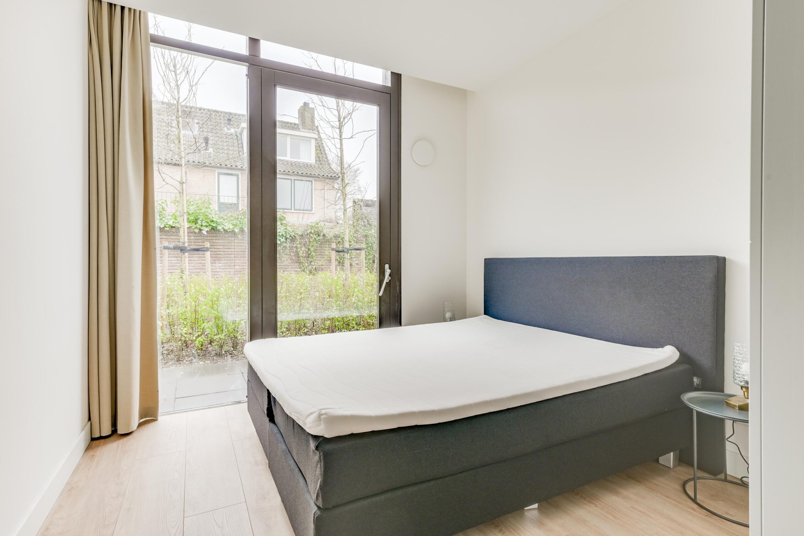 Vanuit de woonkamer bereikt u via een tweede hal van ca. 4,5m² de twee slaapkamers van ca. 10m² en 11m². De slaapkamer aan de voorzijde beschikt over een raam tot aan de vloer, wat zorgt voor veel lichtinval. De achterste slaapkamer heeft een deur naar de binnentuin en biedt in de zomer een heerlijk buitengevoel. Ook hier zorgen de hoge kozijnen voor extra licht en een open uitstraling.
