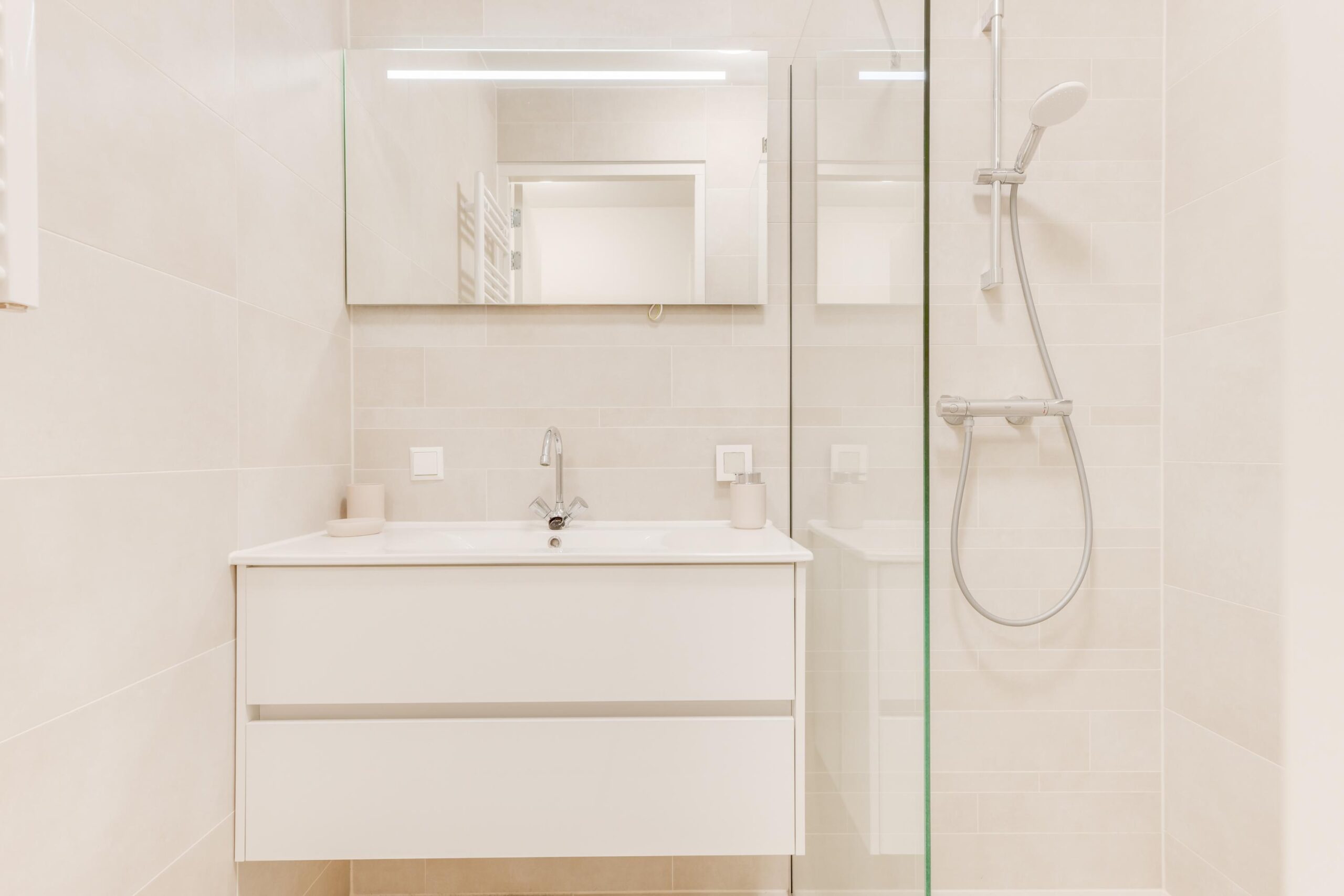 In deze hal bevindt zich tevens de badkamer van ca 3m². Deze is netjes afgewerkt en voorzien van een inloopdouche en een luxe badkamermeubel met verlichte spiegel.