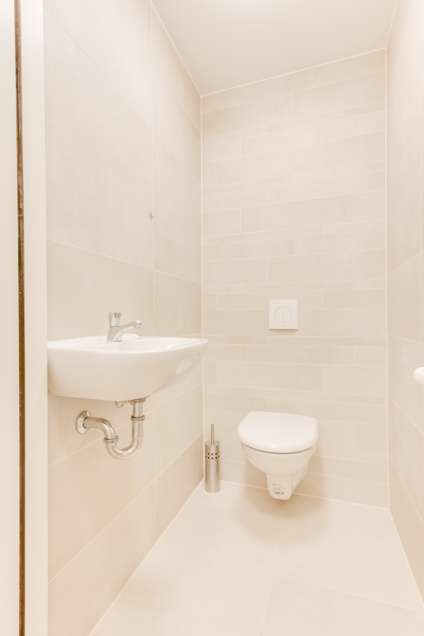 Het toilet is separaat gesitueerd in de hal bij binnenkomst en is uitgevoerd met een hangcloset en een fonteintje.