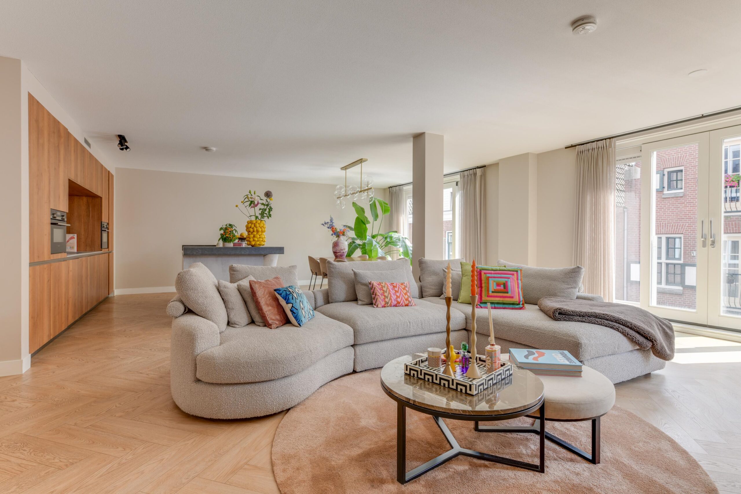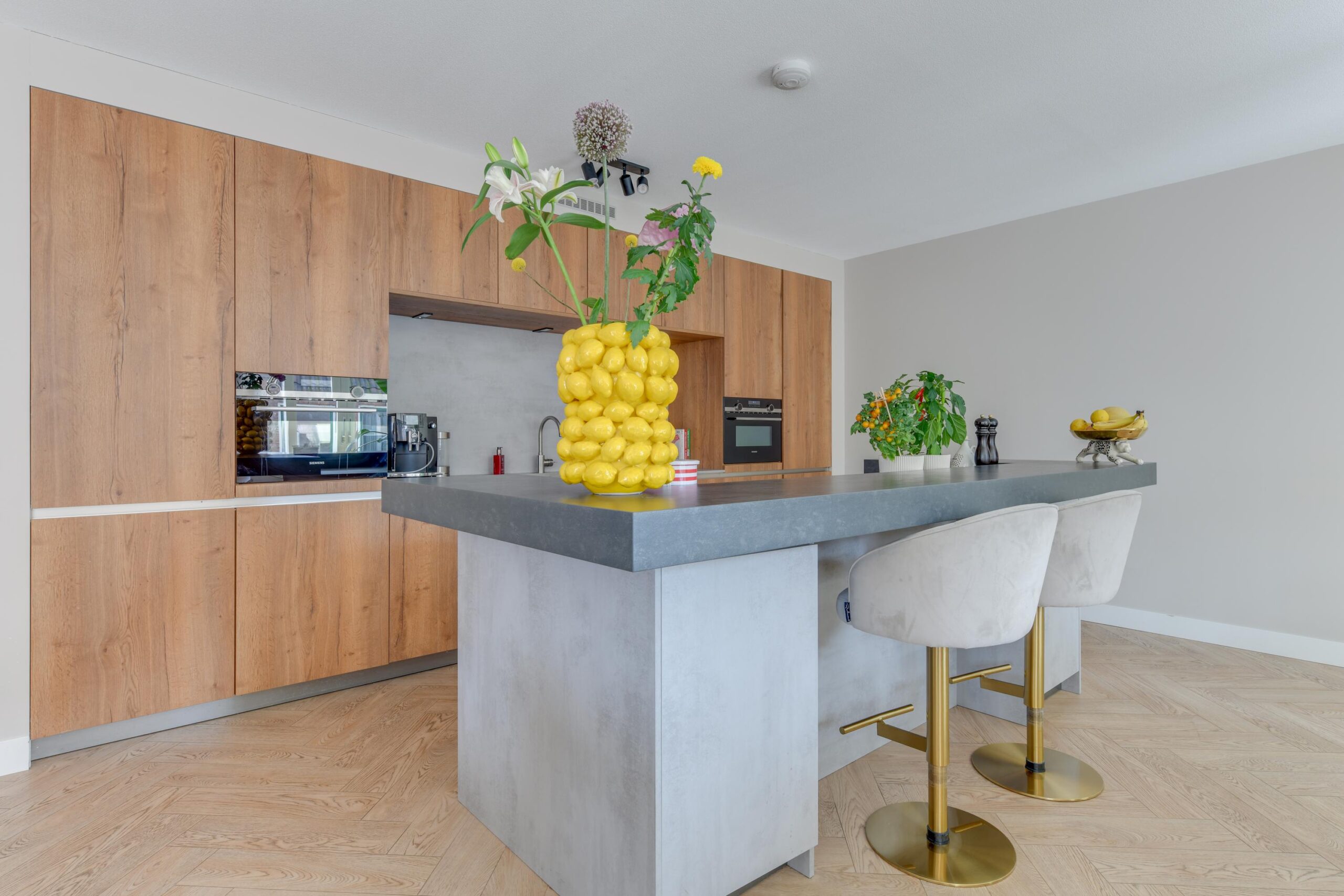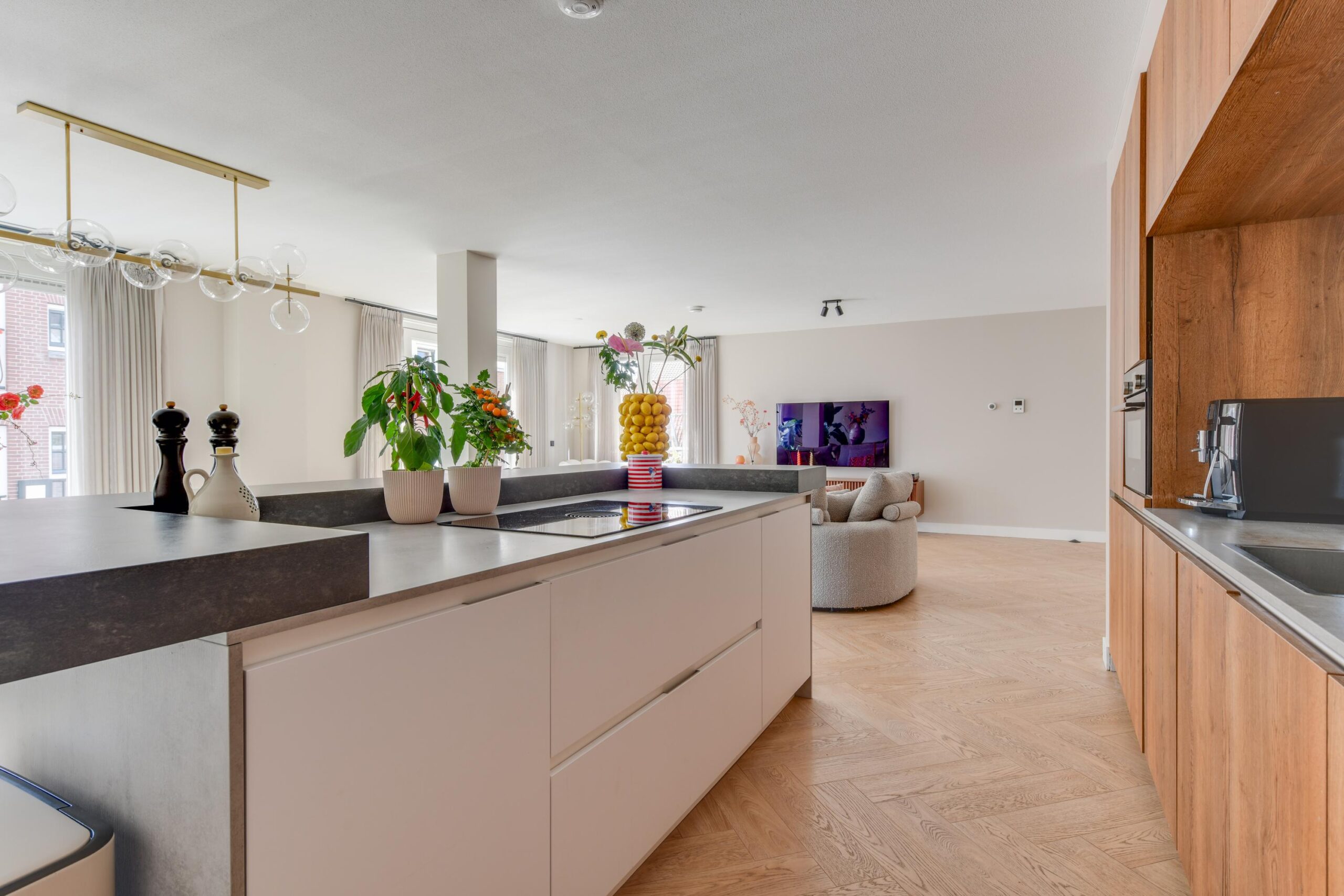 De woonkamer is meer dan royaal (ca. 71,5 m²) en baadt in het licht dankzij grote raampartijen met schuifpui en toegang naar het terras. Net als de rest van het appartement is deze voorzien van een visgraat vloer met vloerverwarming. De luxe open keuken met kookeiland en diverse inbouwapparatuur is een echte eyecatcher. Aan de barzijde van het eiland geniet je van een ontspannen ontbijtje of een goed glas wijn. Koken en gezelligheid gaan hier hand in hand.