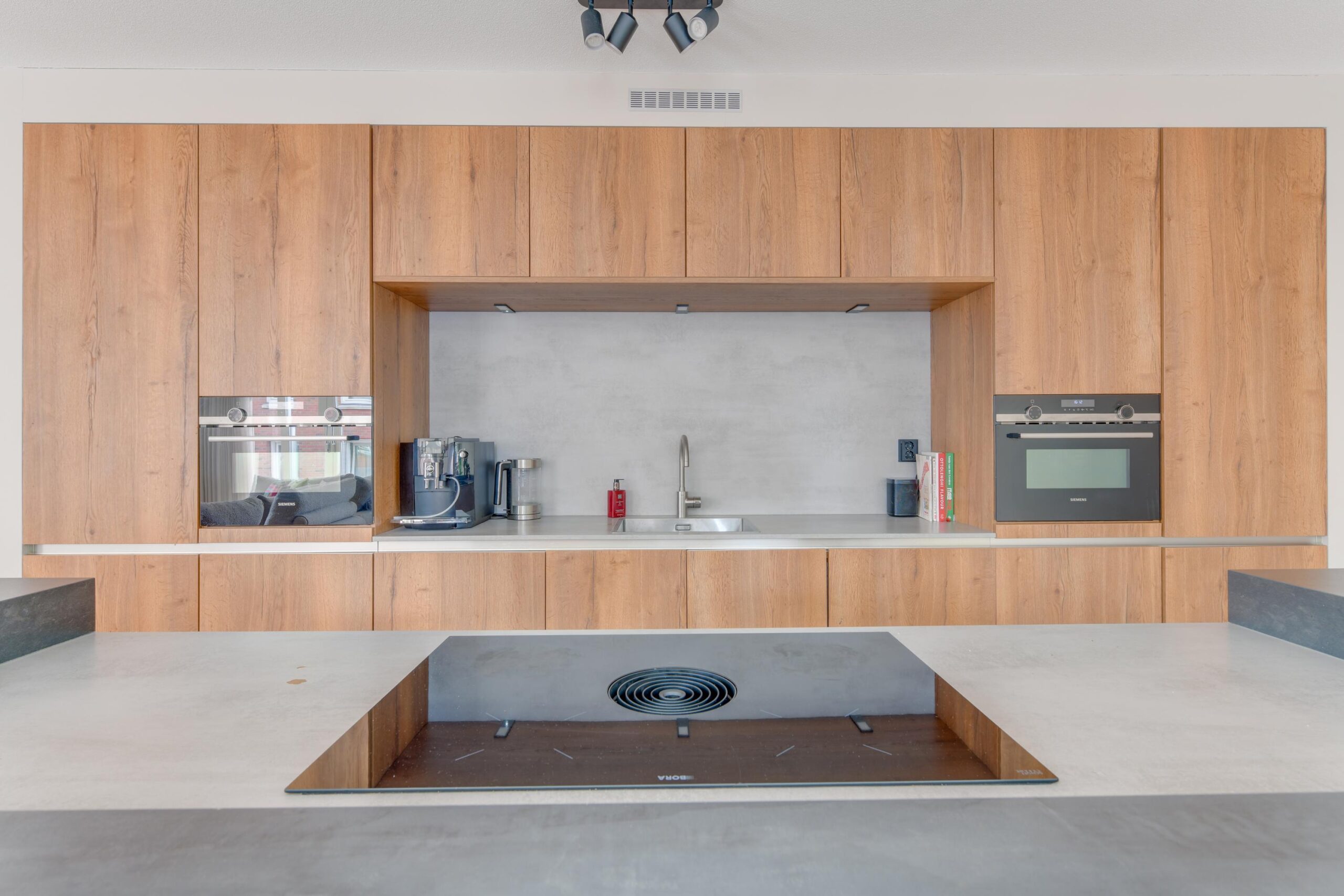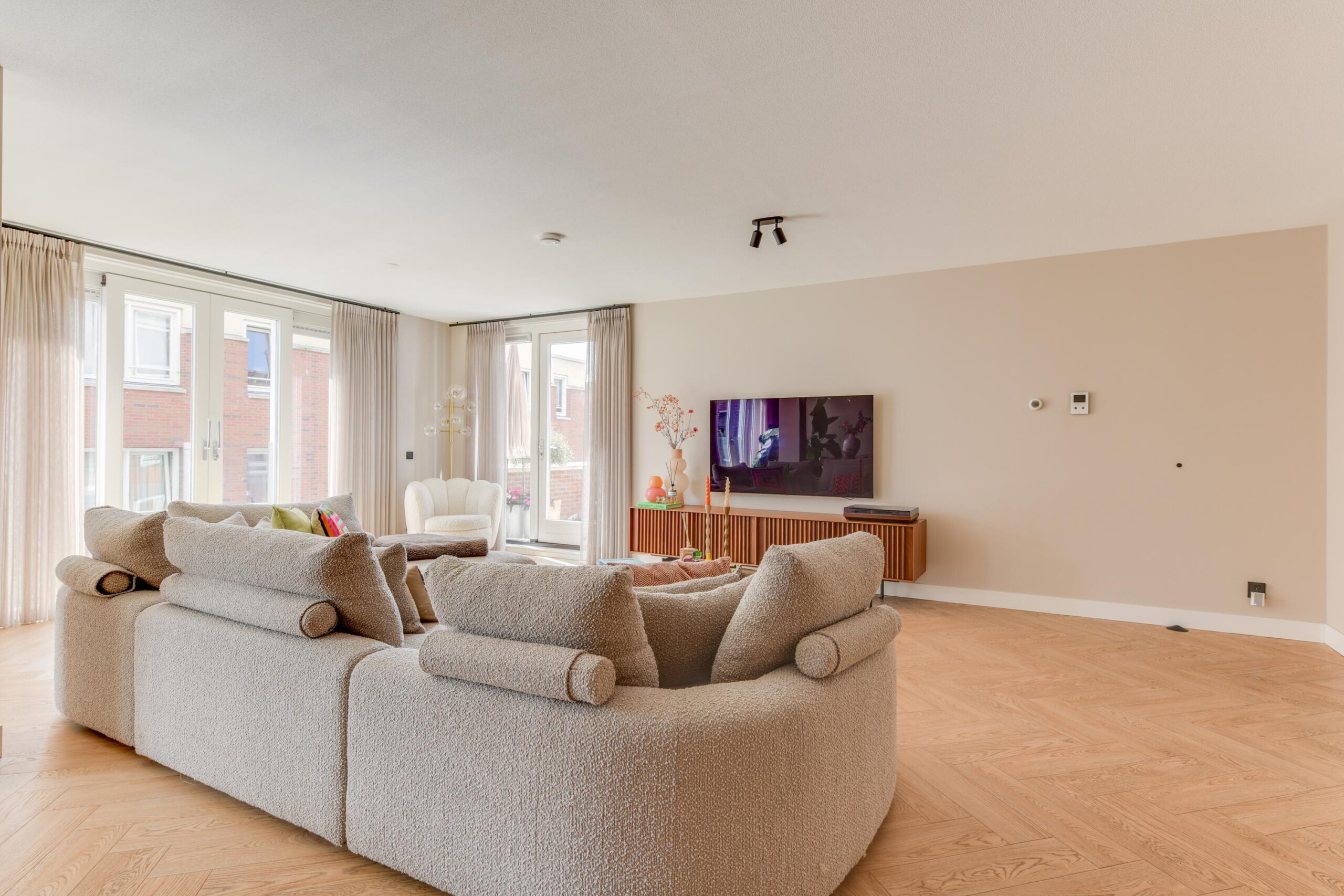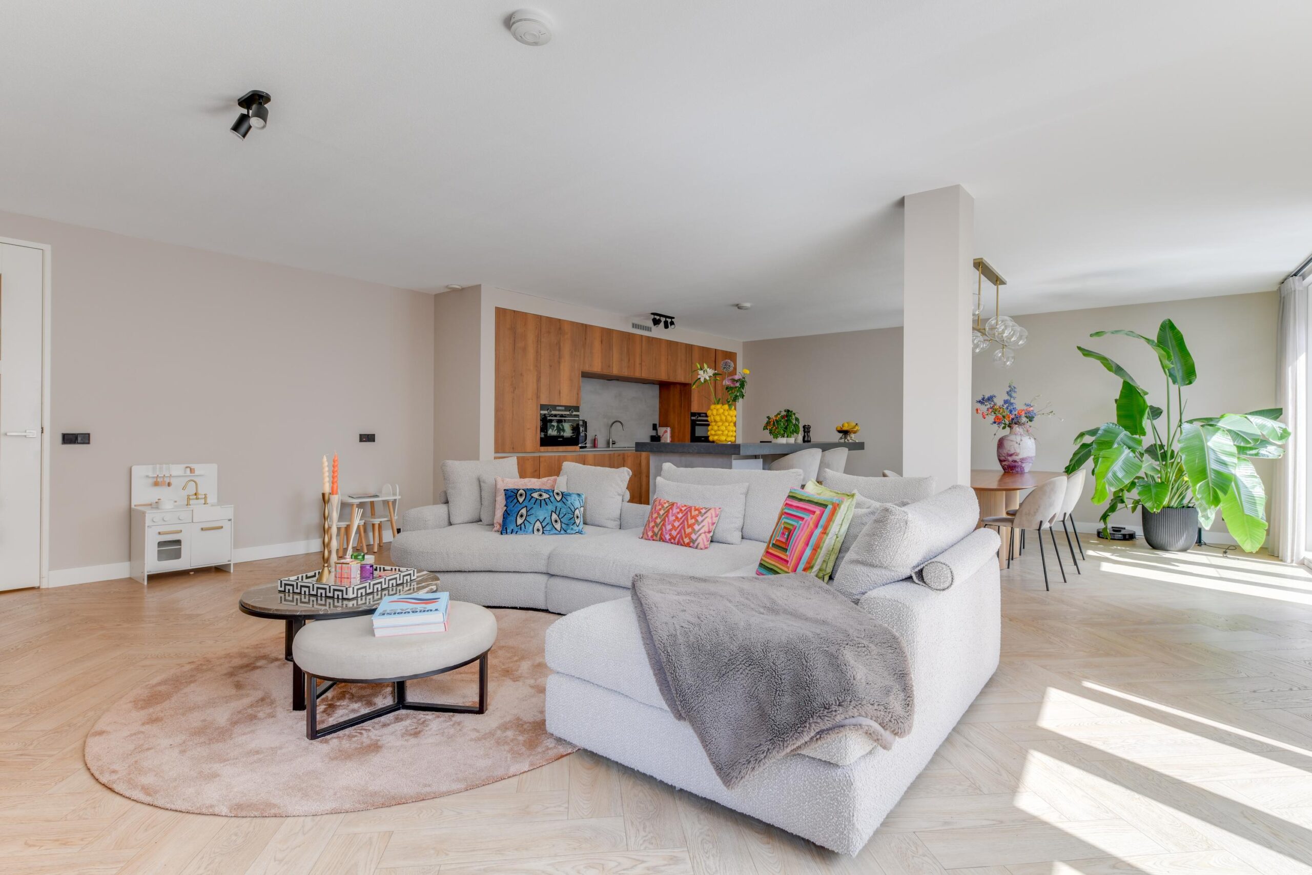 De woonkamer is meer dan royaal (ca. 71,5 m²) en baadt in het licht dankzij grote raampartijen met schuifpui en toegang naar het terras. Net als de rest van het appartement is deze voorzien van een visgraat vloer met vloerverwarming. De luxe open keuken met kookeiland en diverse inbouwapparatuur is een echte eyecatcher. Aan de barzijde van het eiland geniet je van een ontspannen ontbijtje of een goed glas wijn. Koken en gezelligheid gaan hier hand in hand.