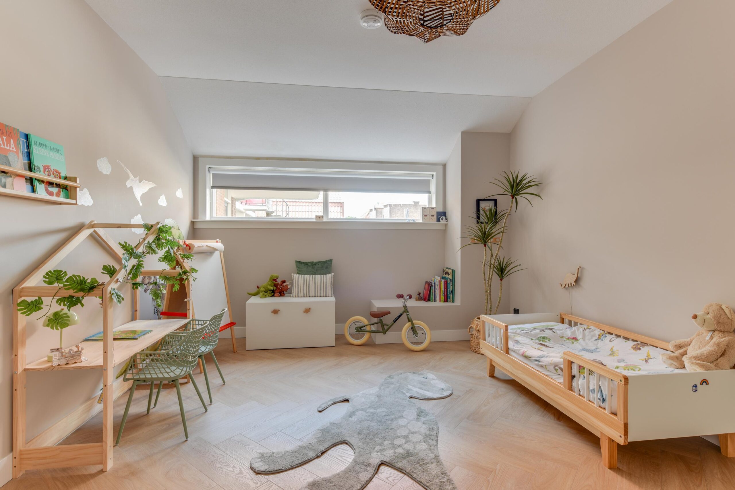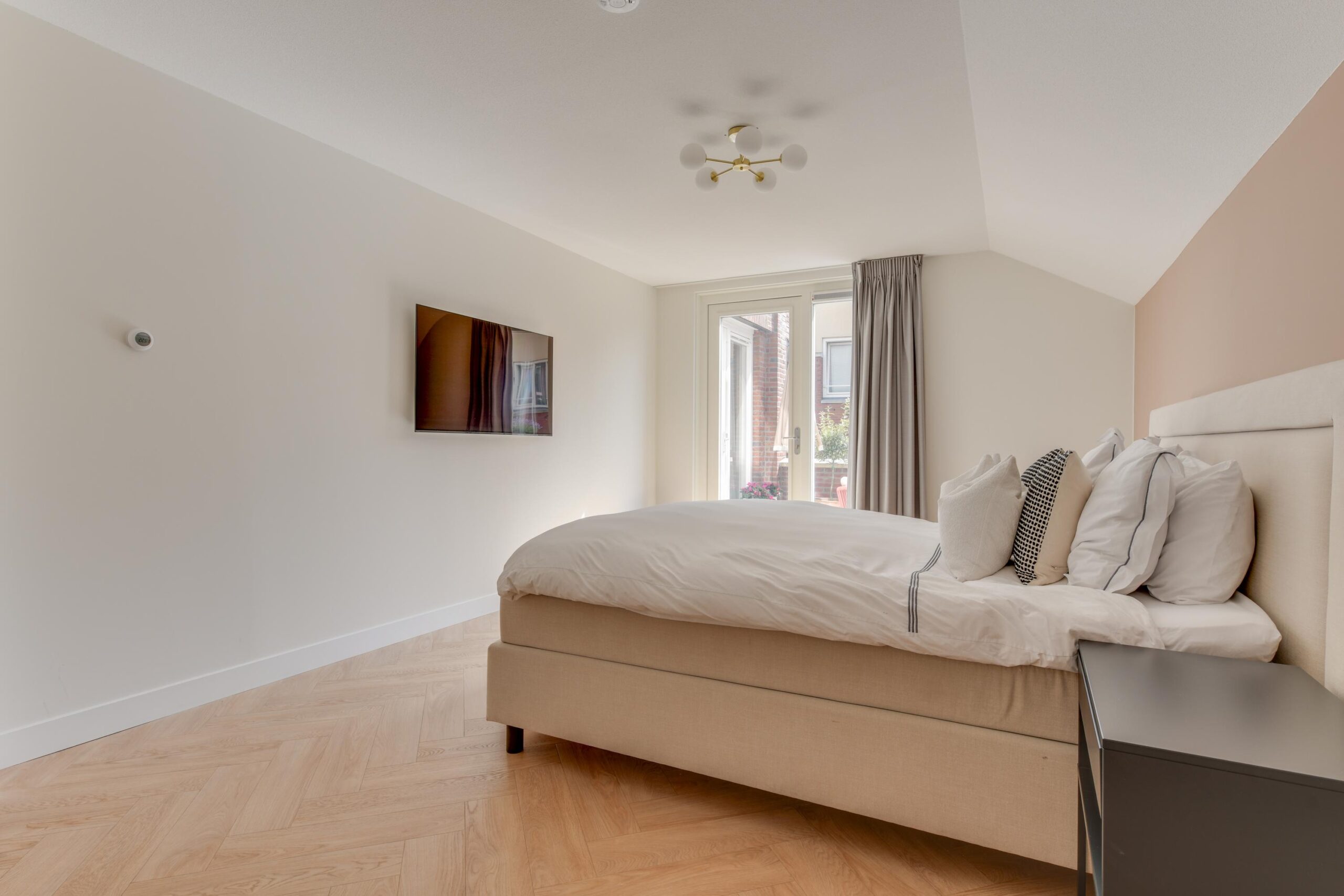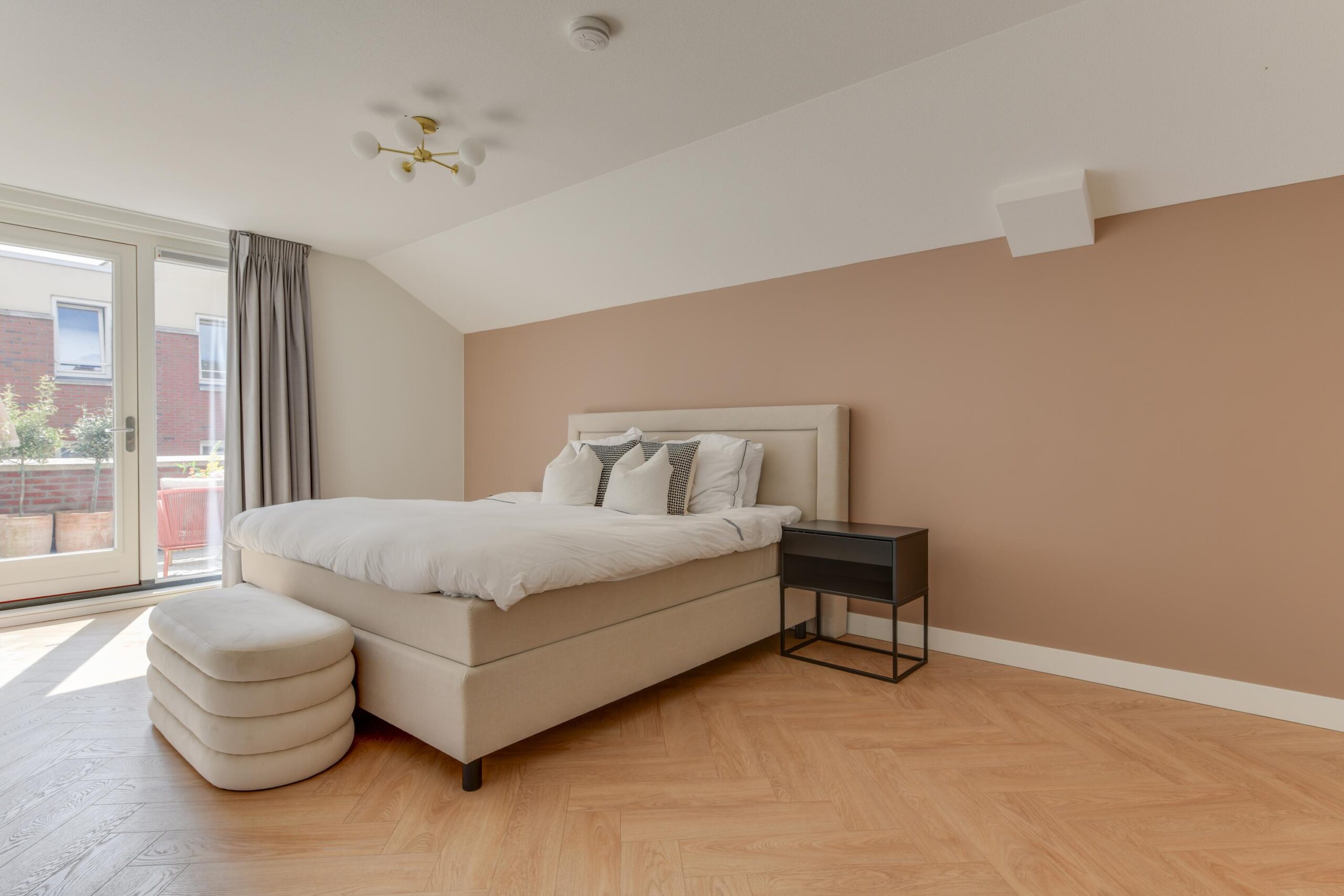 De derde, riante slaapkamer (ca. 23 m²) beschikt over een eigen kleedruimte/inloopkast (ca. 7,5 m²) en directe toegang tot het zonnige terras.