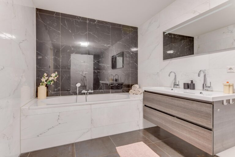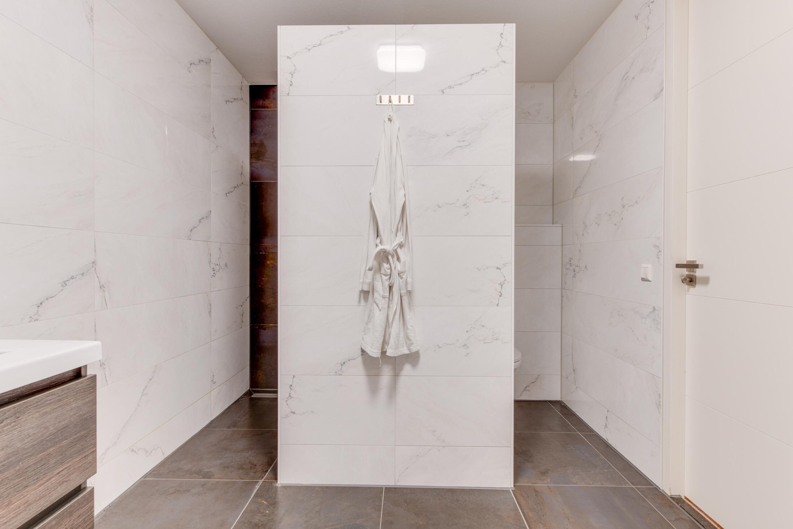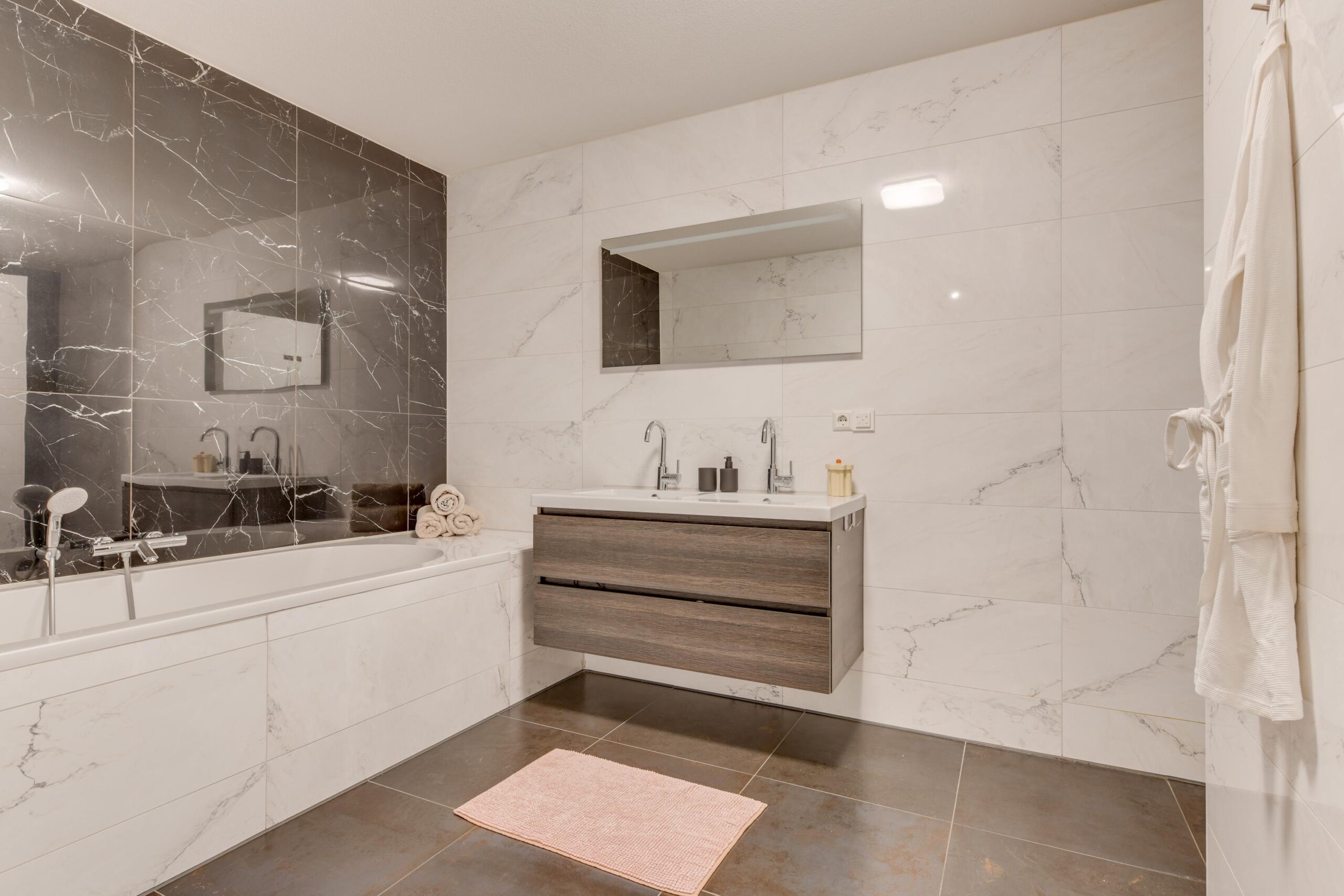 De luxe badkamer (ca. 11,5 m²) is voorzien van een ligbad, dubbele wastafel met meubel, royale spiegel met verlichting, inloopdouche met regendouche én een tweede toilet.