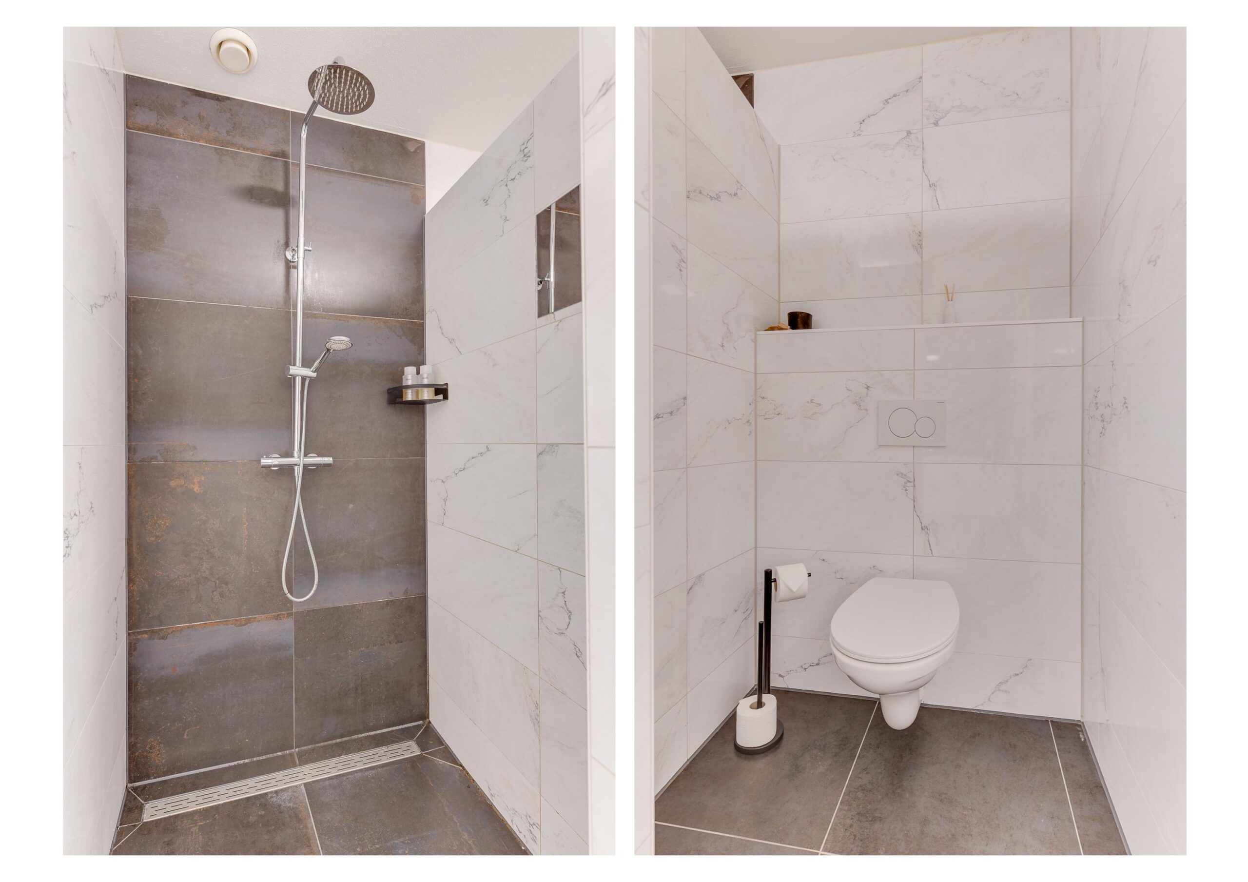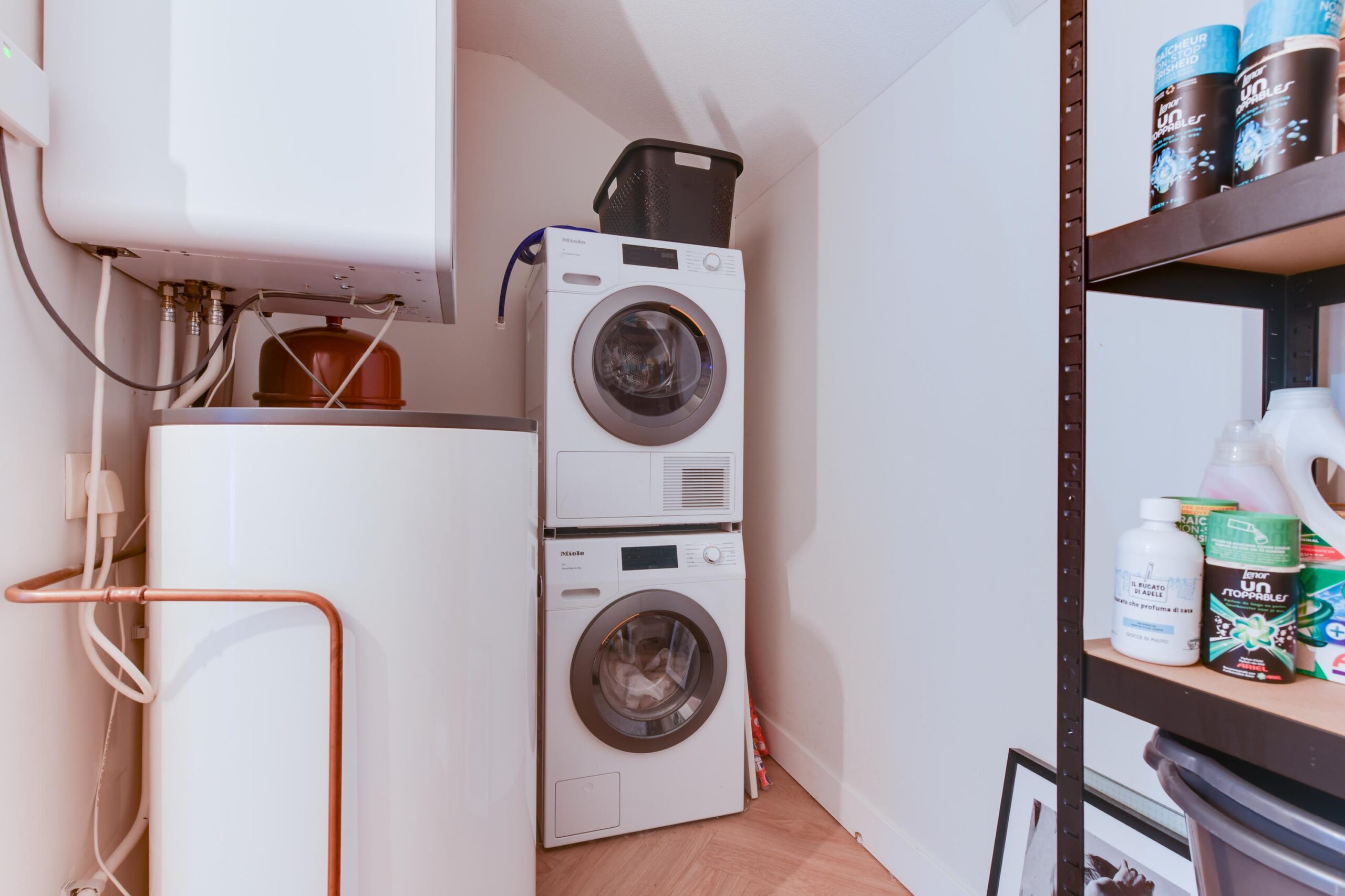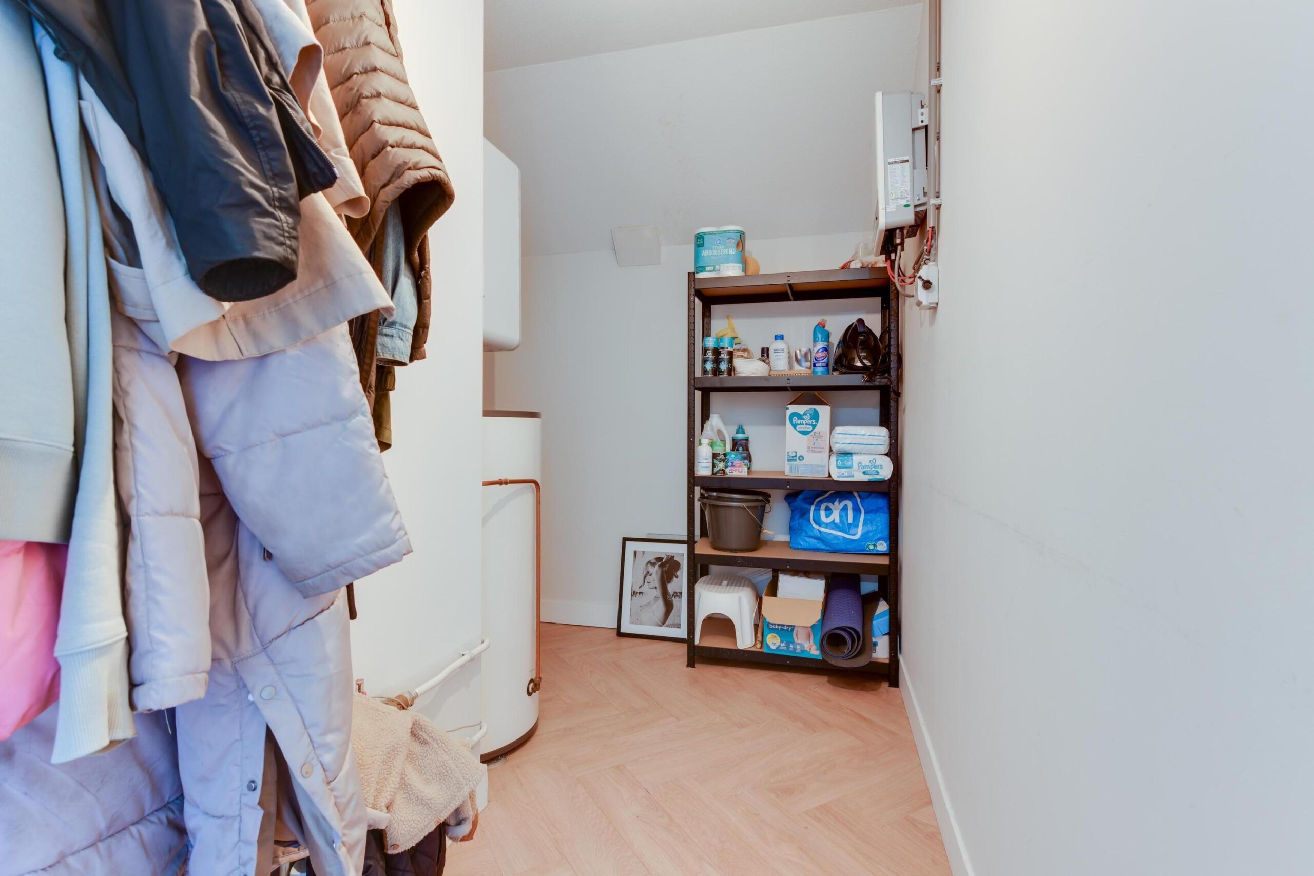 Verderop in de hal bevindt zich de praktische inpandige berging (ca. 7 m²) met aansluitingen voor wasmachine en droger, en de opstelling voor de elektrische boiler. Naast de berging is een modern afgewerkte toiletruimte aanwezig.