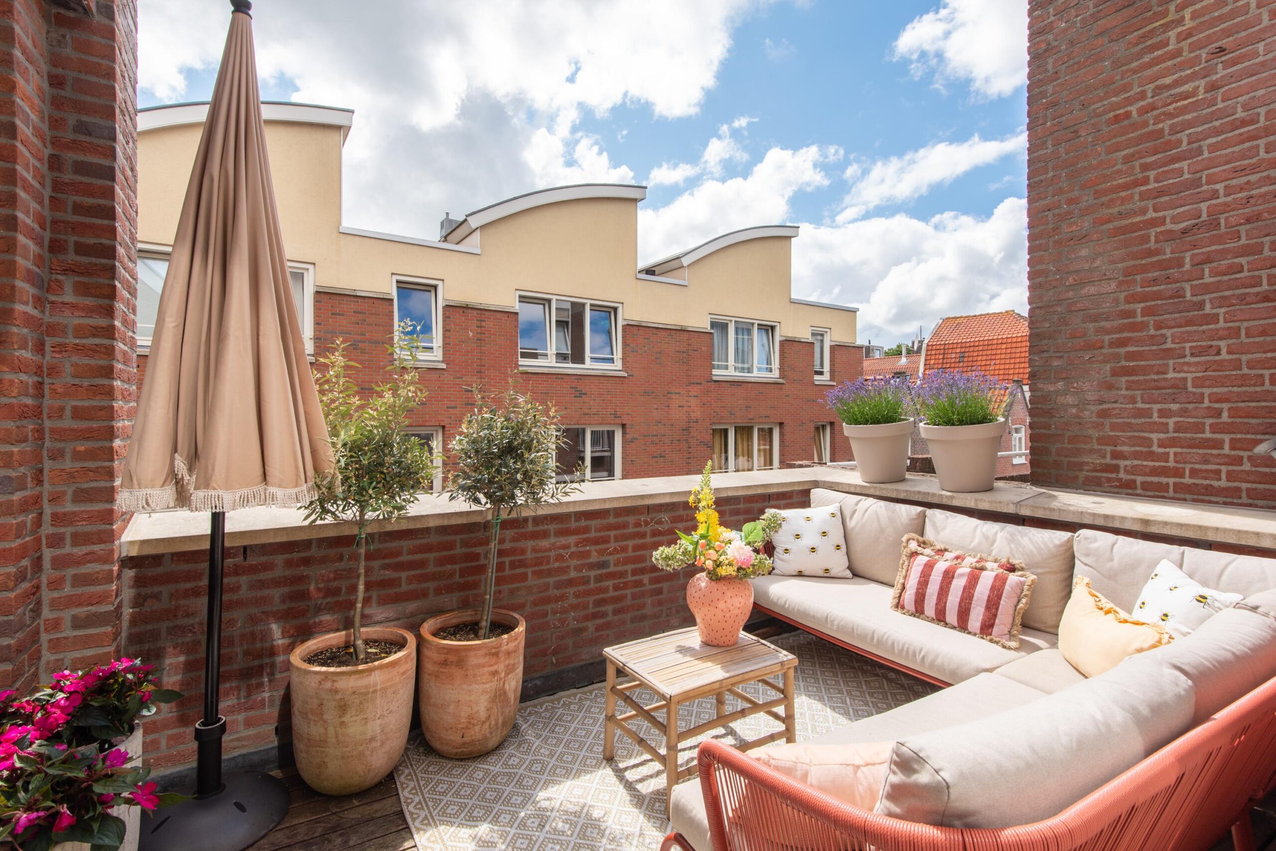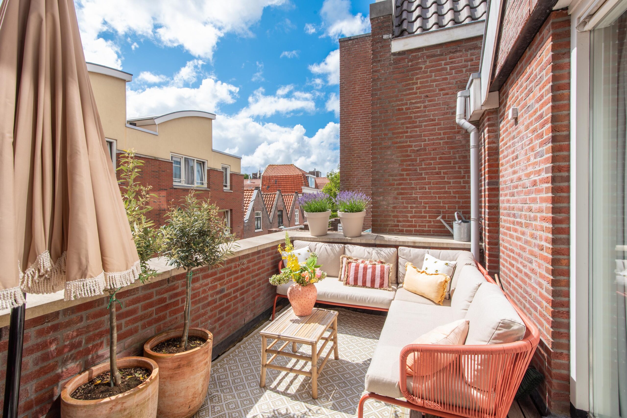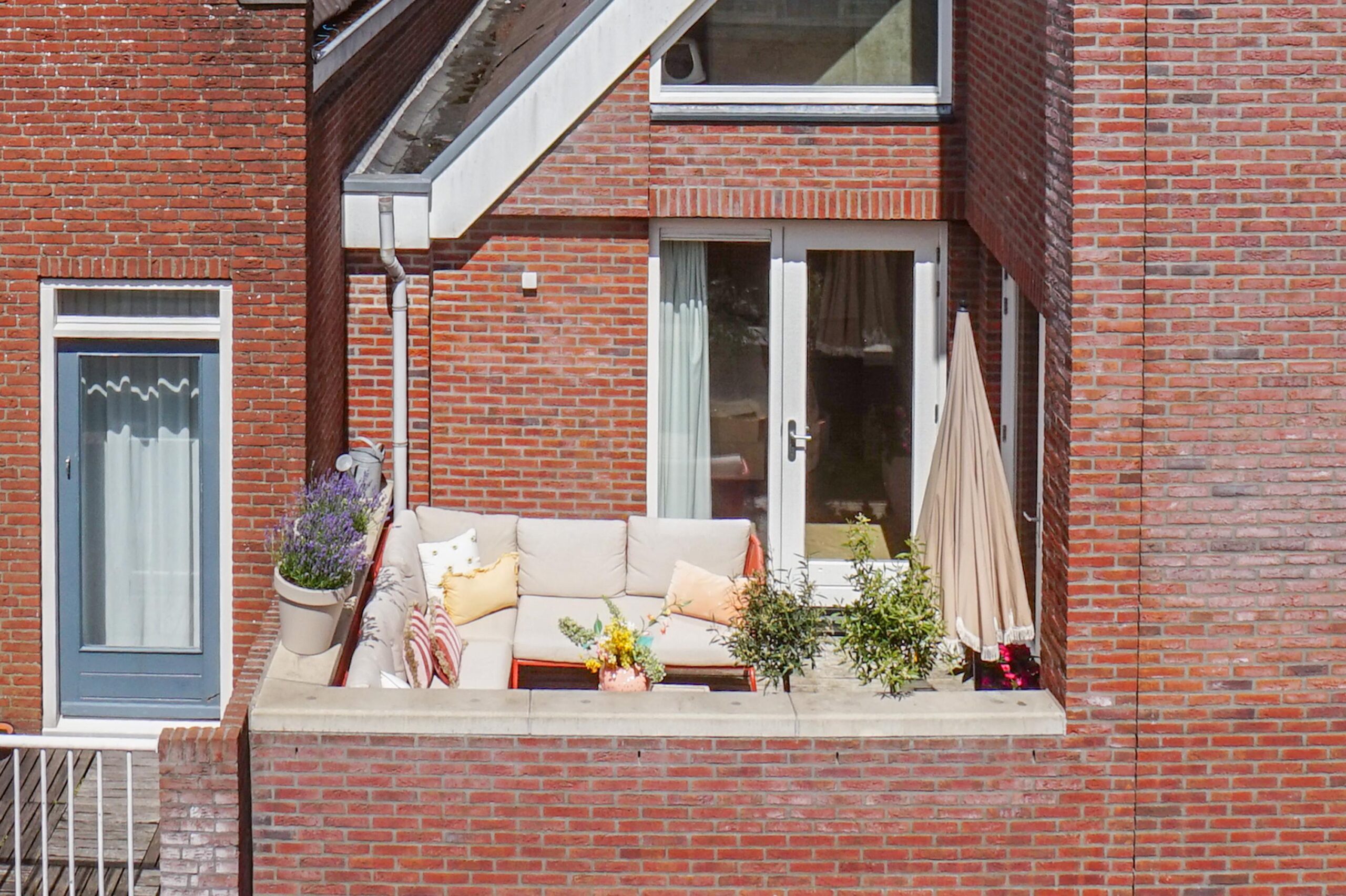 Het zonnige terras (ca. 9 m²) ligt op het zuidwesten en is bereikbaar vanuit zowel de woonkamer als de slaapkamer. Hier geniet je beschut van het buitenleven en het uitzicht op de straat.