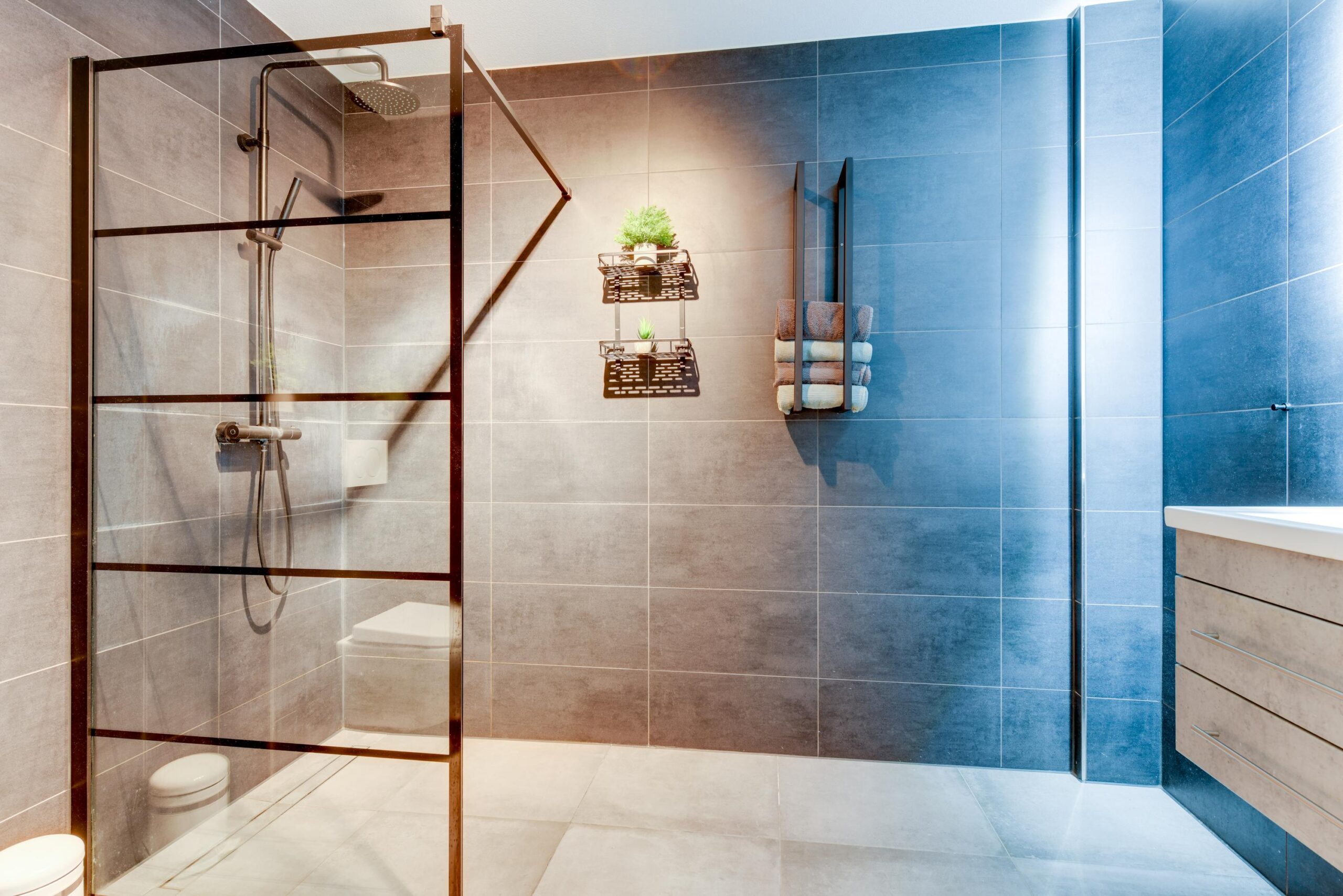 • Strakke badkamer met regendouche, toilet en wastafelmeubel;