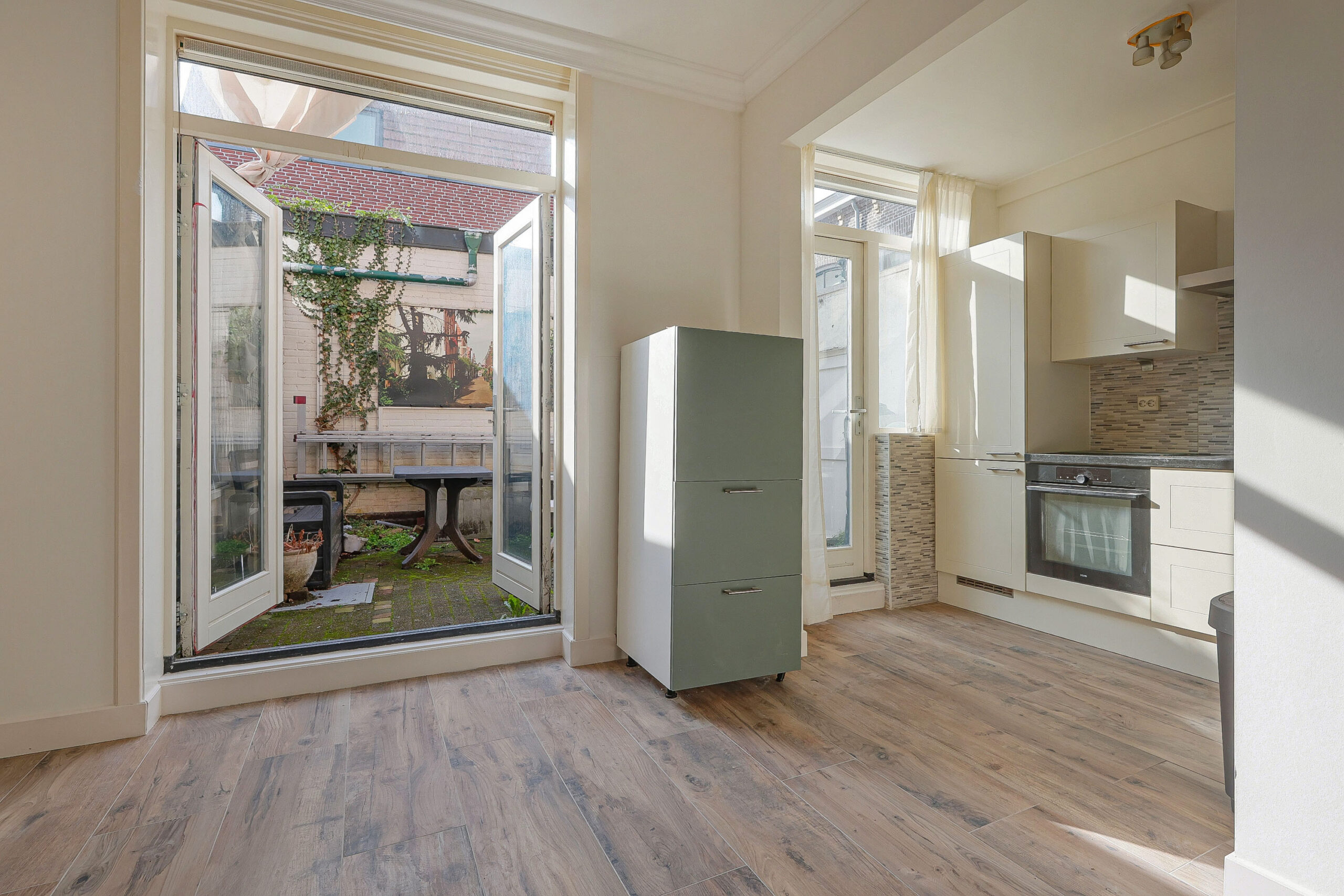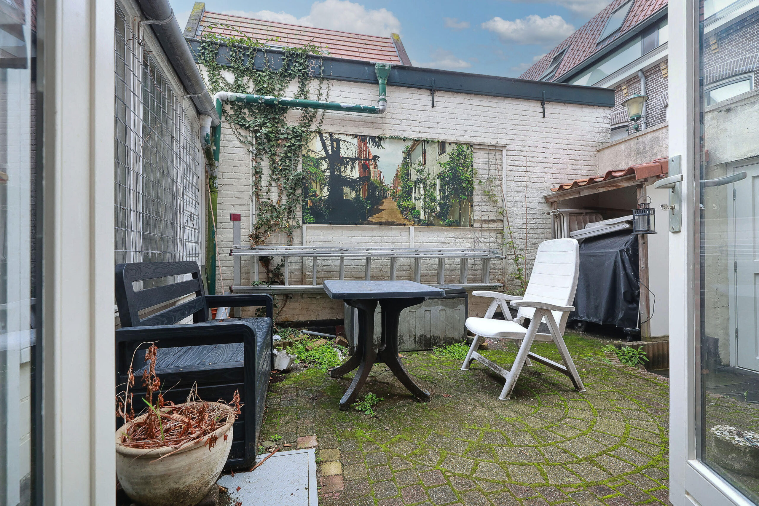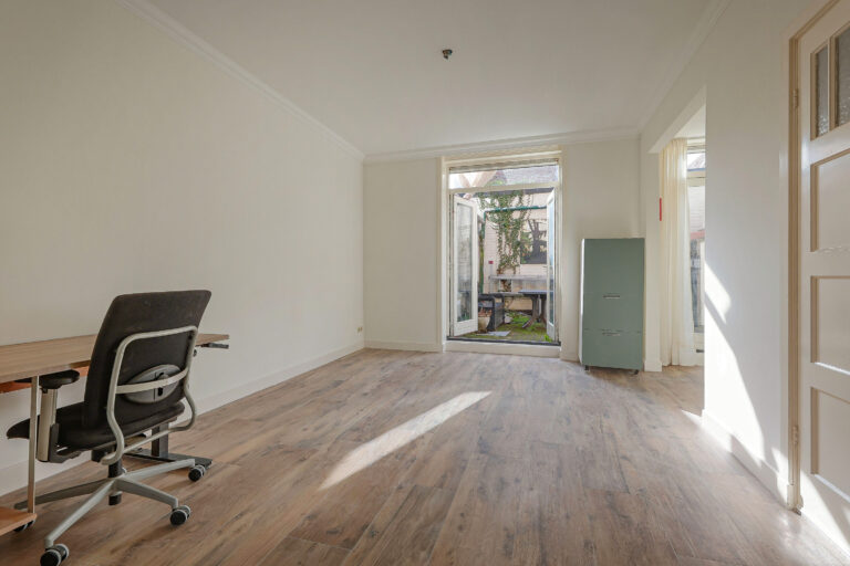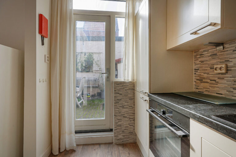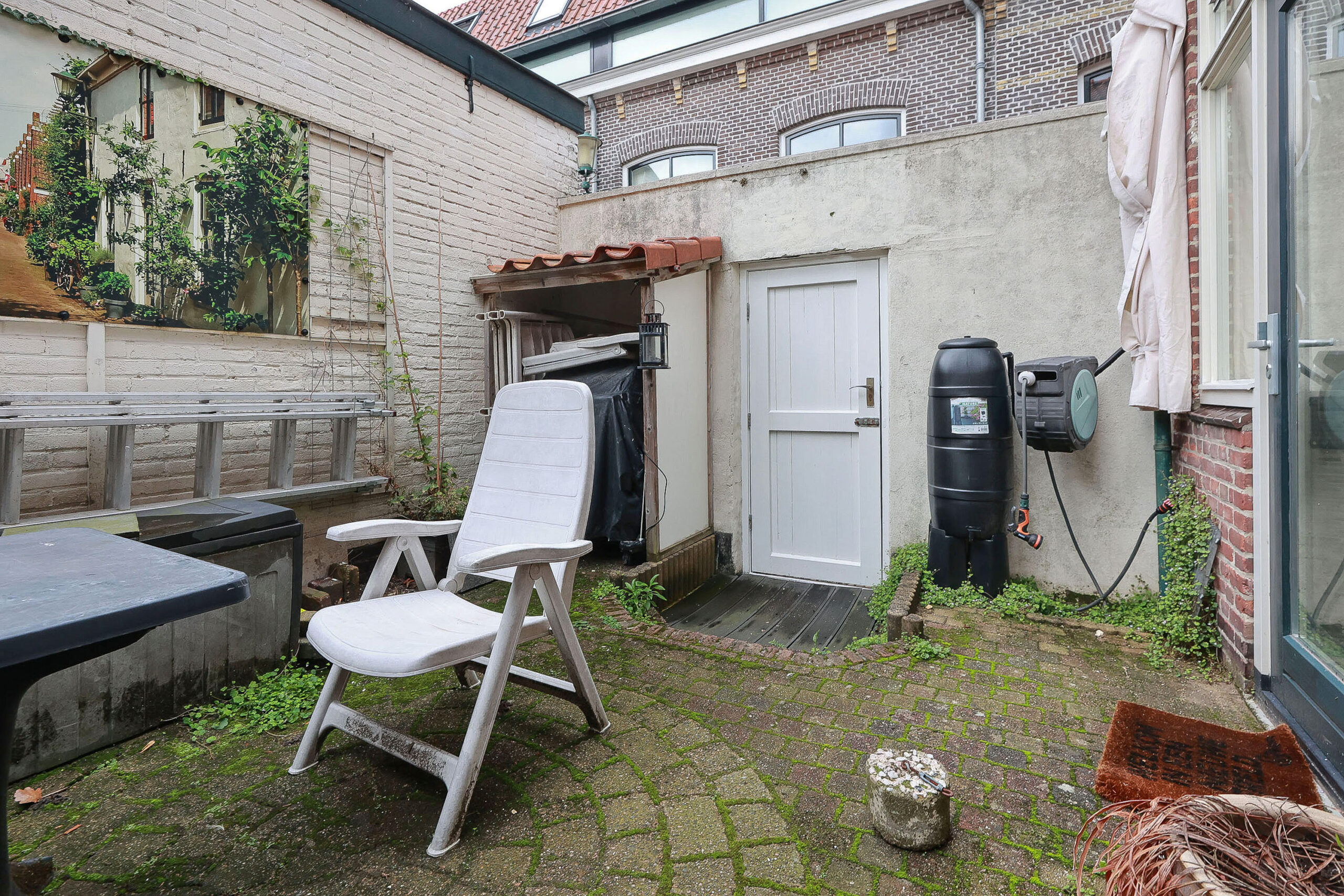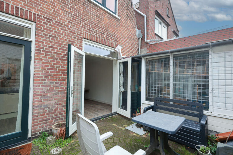 De knusse stadstuin ligt op het zuiden – een heerlijk plekje om van de zon te genieten. Achterin vind je een afdak voor je spullen, een achterom en een extra berging die direct aan de woning vastzit.