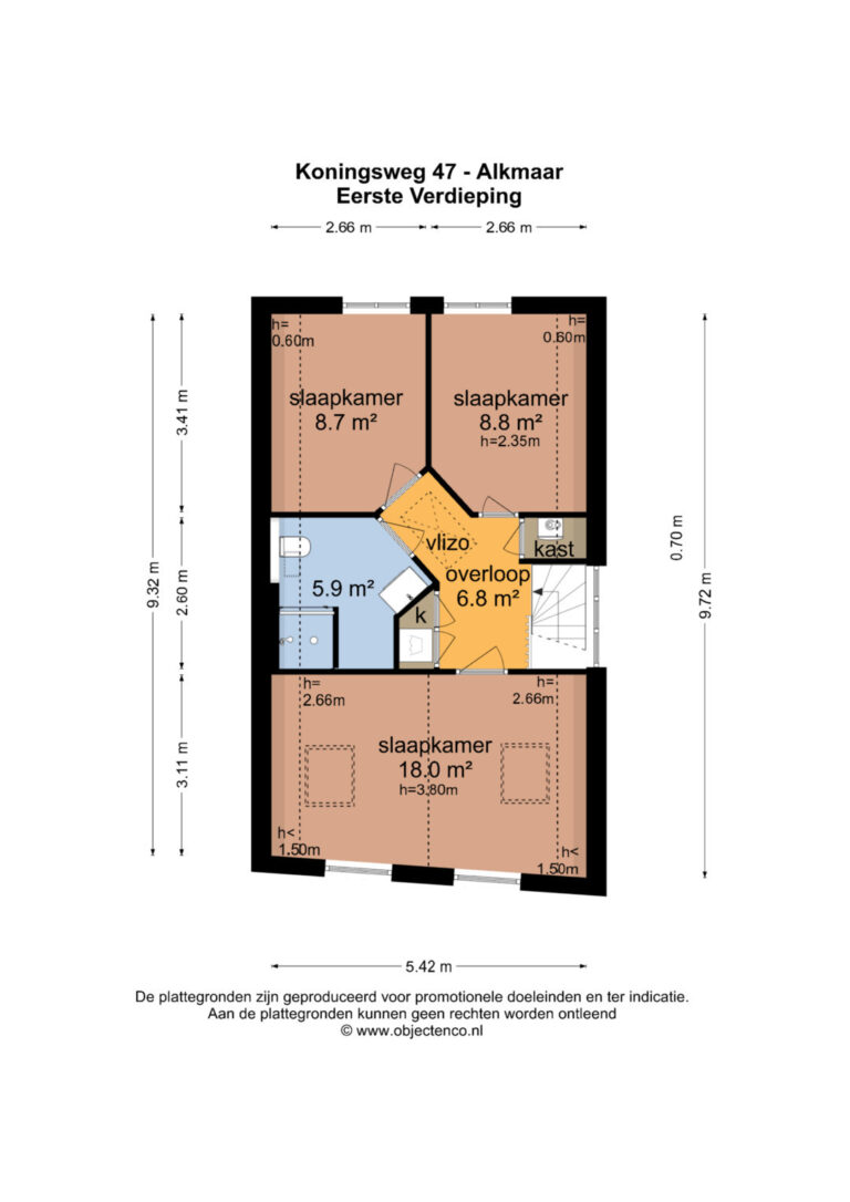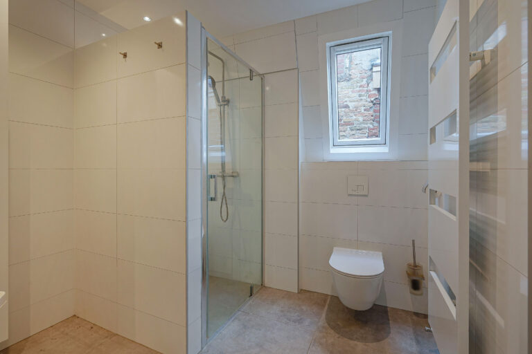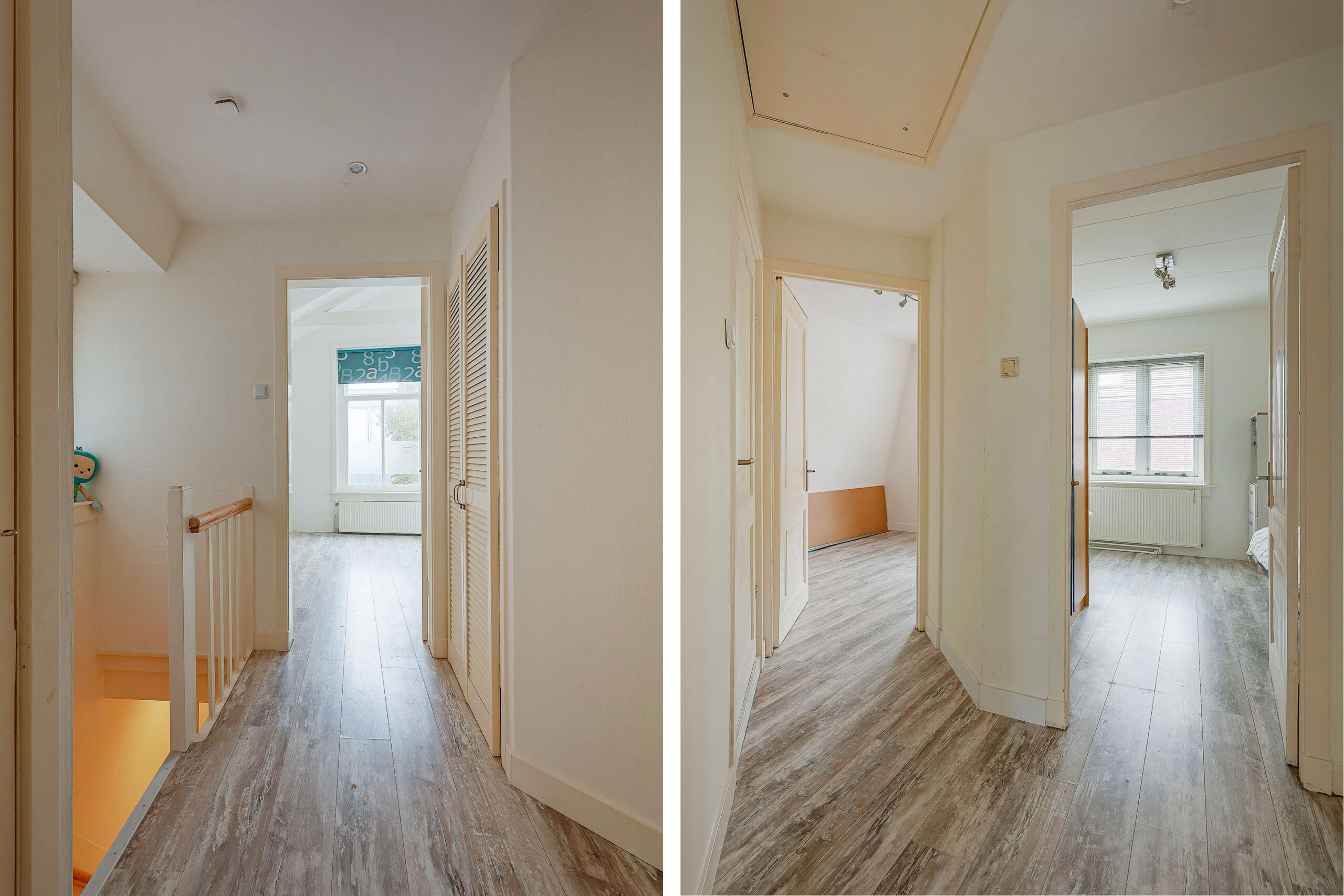De ruime, lichte slaapkamer van ca. 18 m² ligt aan de voorzijde. Aan de andere kant van de overloop bevinden zich twee slaapkamers van elk ca. 9 m². De moderne badkamer is voorzien van een inloopdouche, tweede toilet, wastafelmeubel en designradiator. De lichte overloop zorgt voor een fijne, open sfeer.