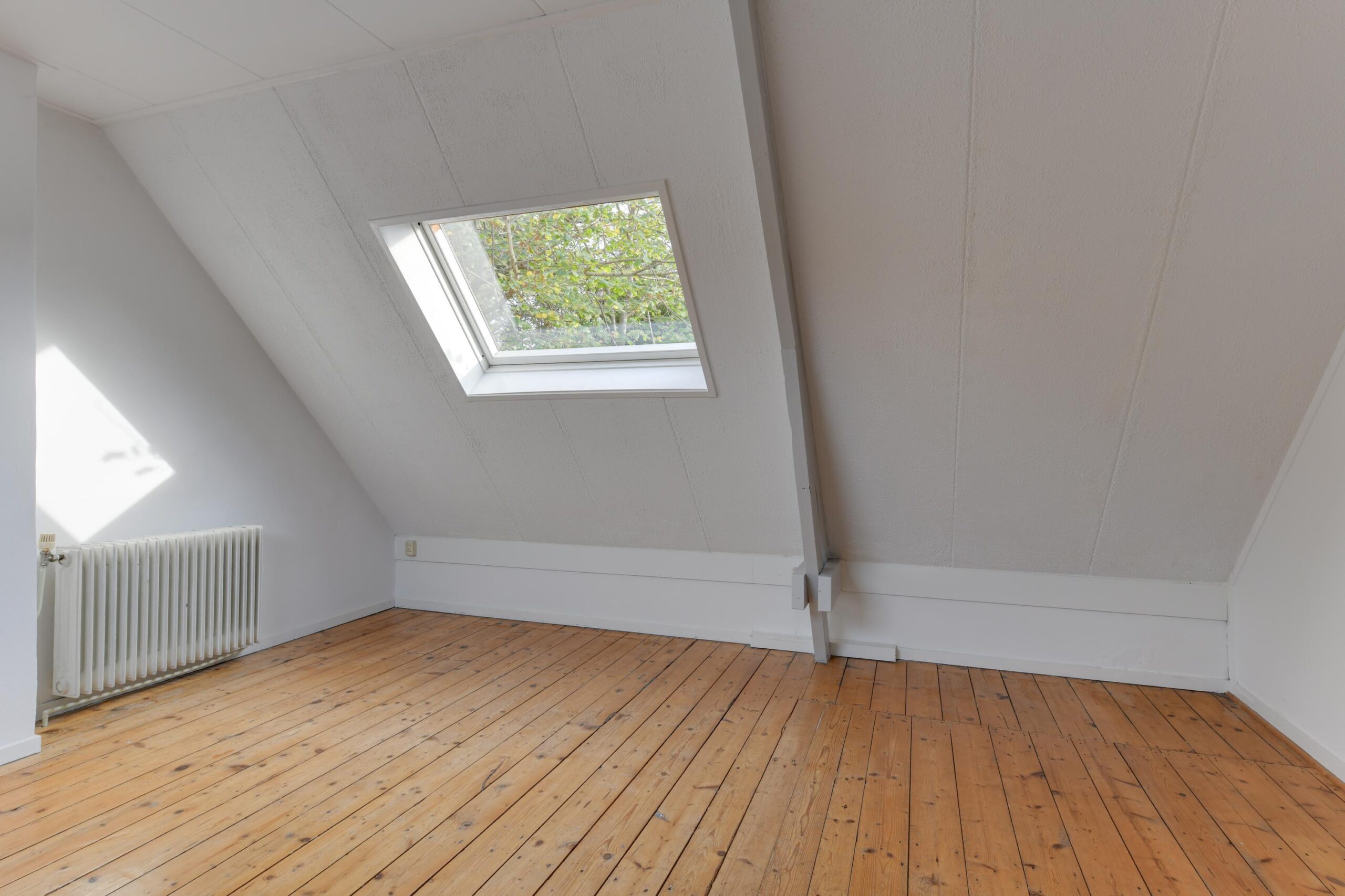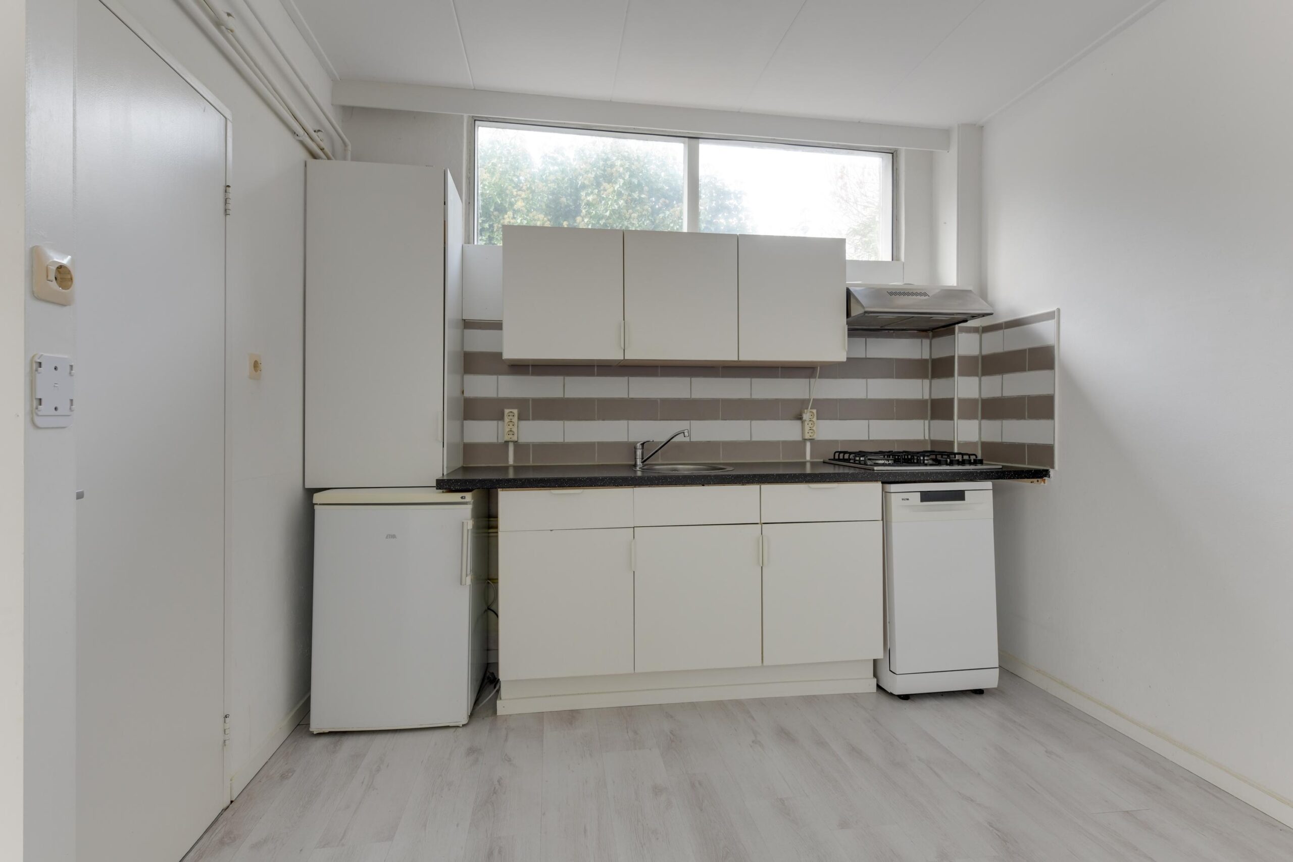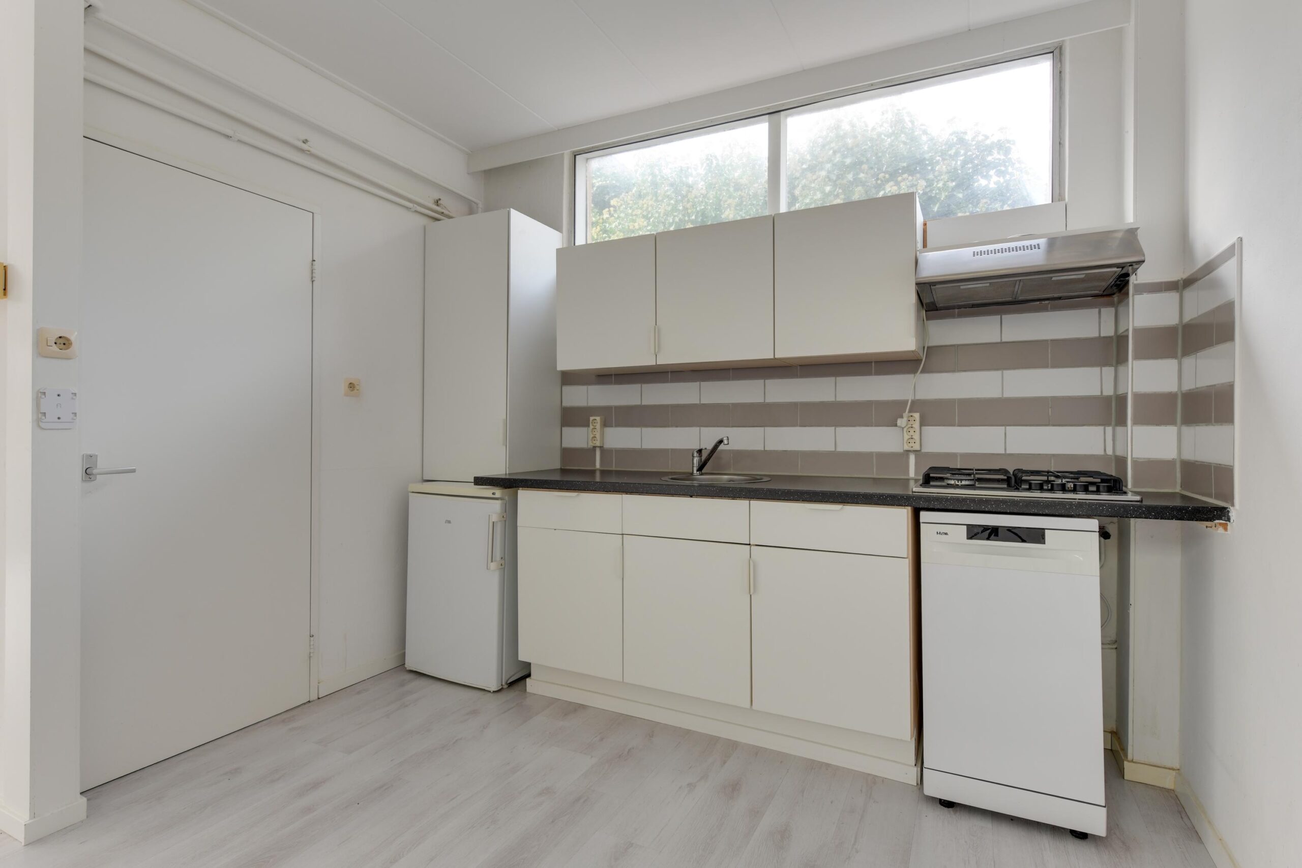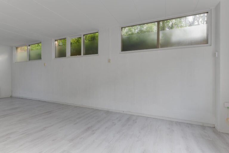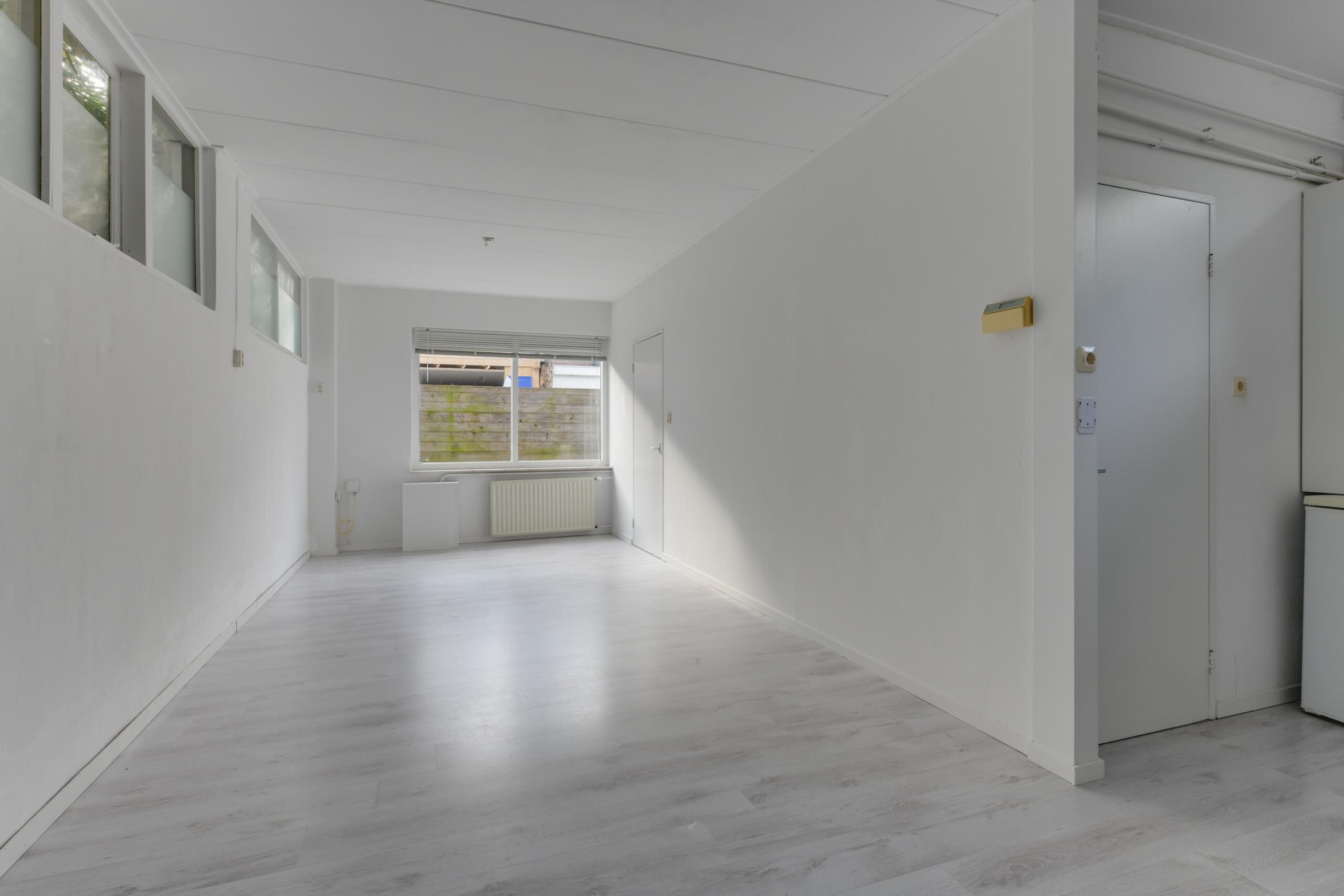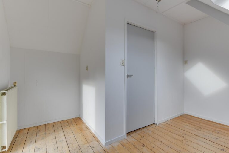 Je komt binnen in de hal, die toegang biedt tot de lichte woonkamer van ca. 25 m². Door de fijne lichtinval en de open verbinding met de keuken voelt deze kamer ruim en gezellig aan. De open keuken is eenvoudig maar functioneel en vormt een goede basis om naar wens te moderniseren. De praktische bijkeuken is ideaal voor extra opslag of bijvoorbeeld een wasruimte. Vanuit de keuken is het toilet bereikbaar.