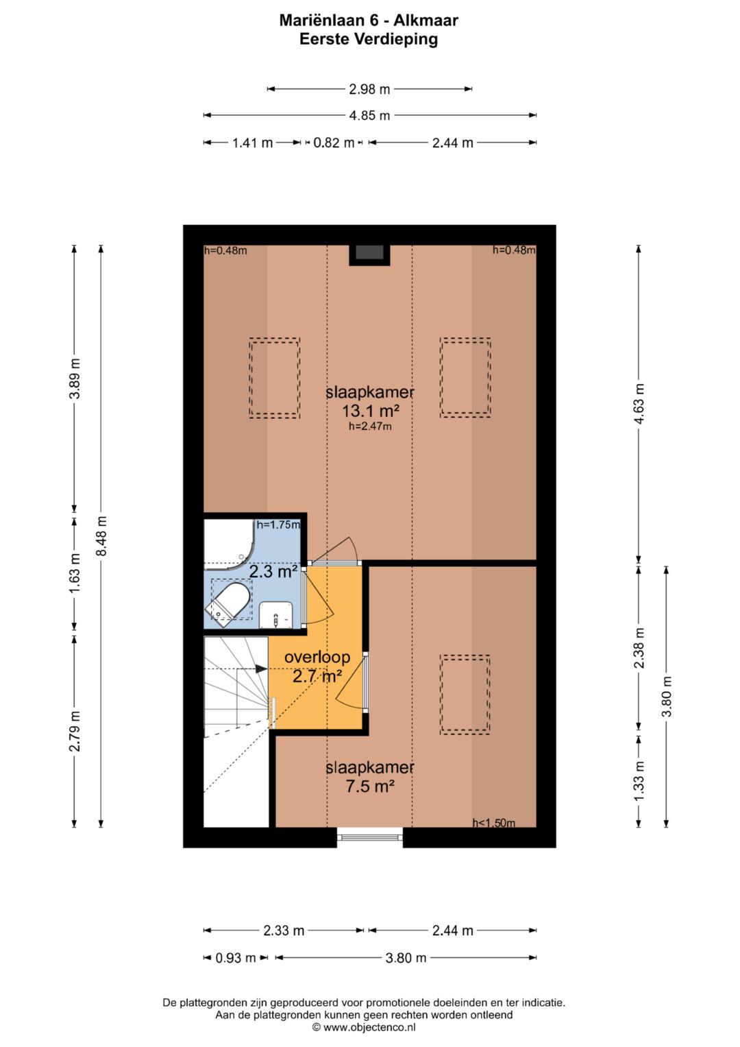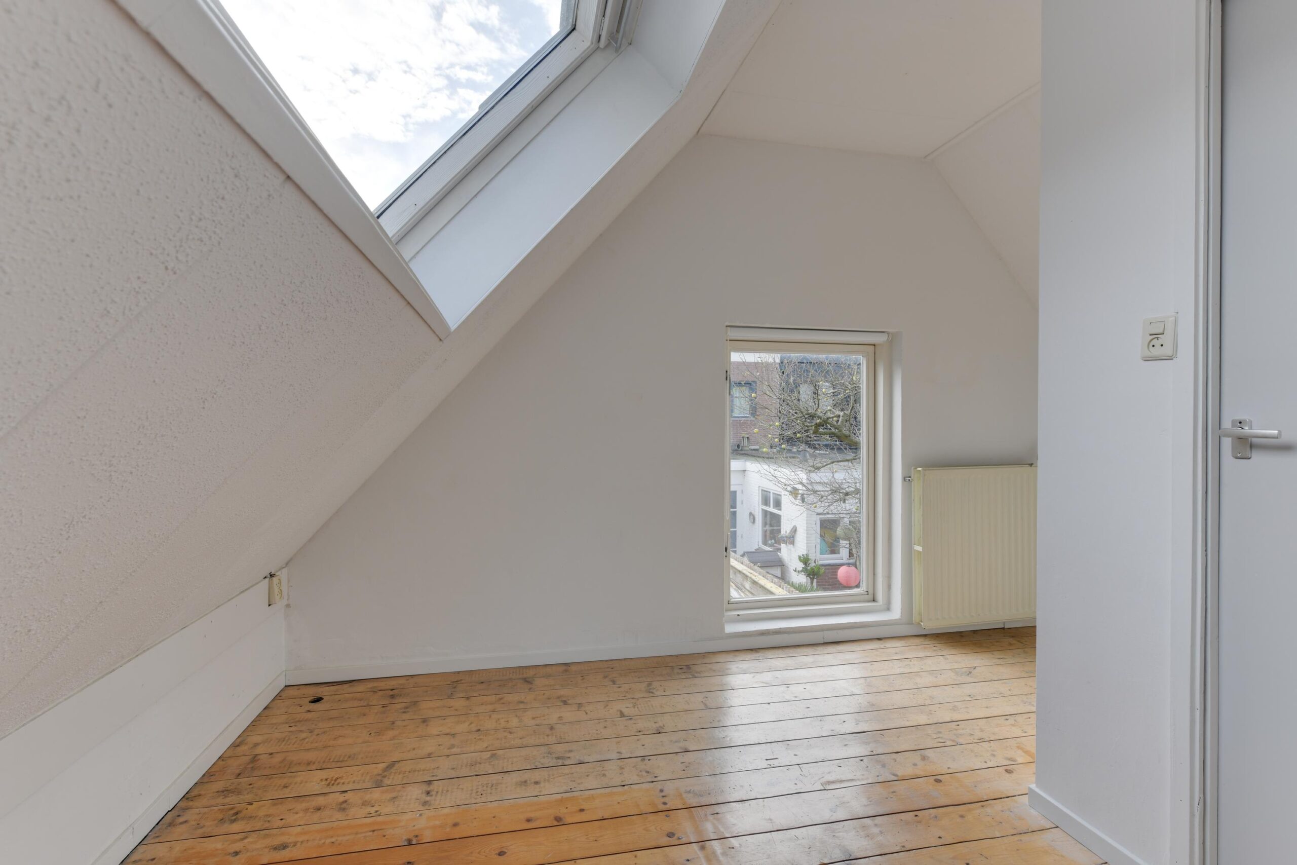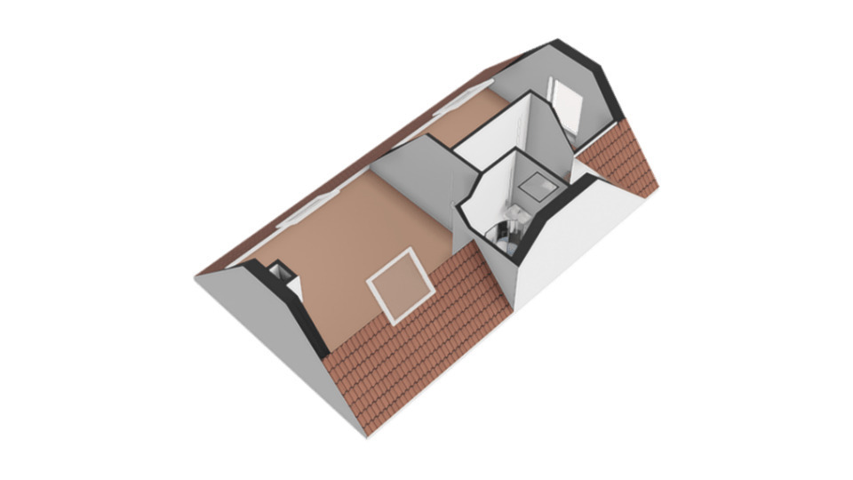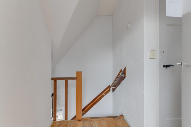Op de verdieping vind je twee goed ingedeelde ca. 8 m² en 13 m² grote slaapkamers, een overloop en de badkamer. De badkamer is uitgerust met een douche, tweede toilet en wastafel, compact maar compleet.