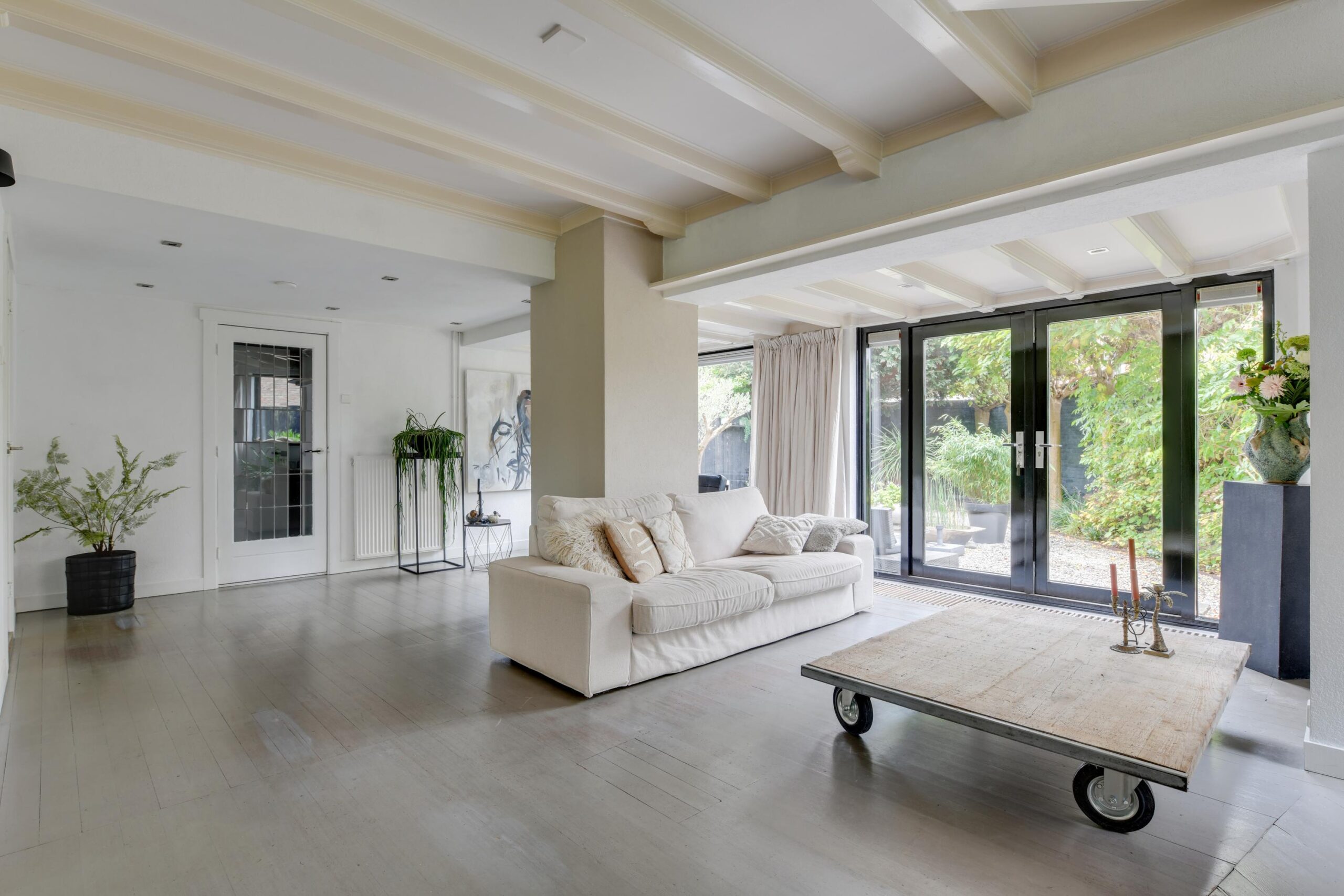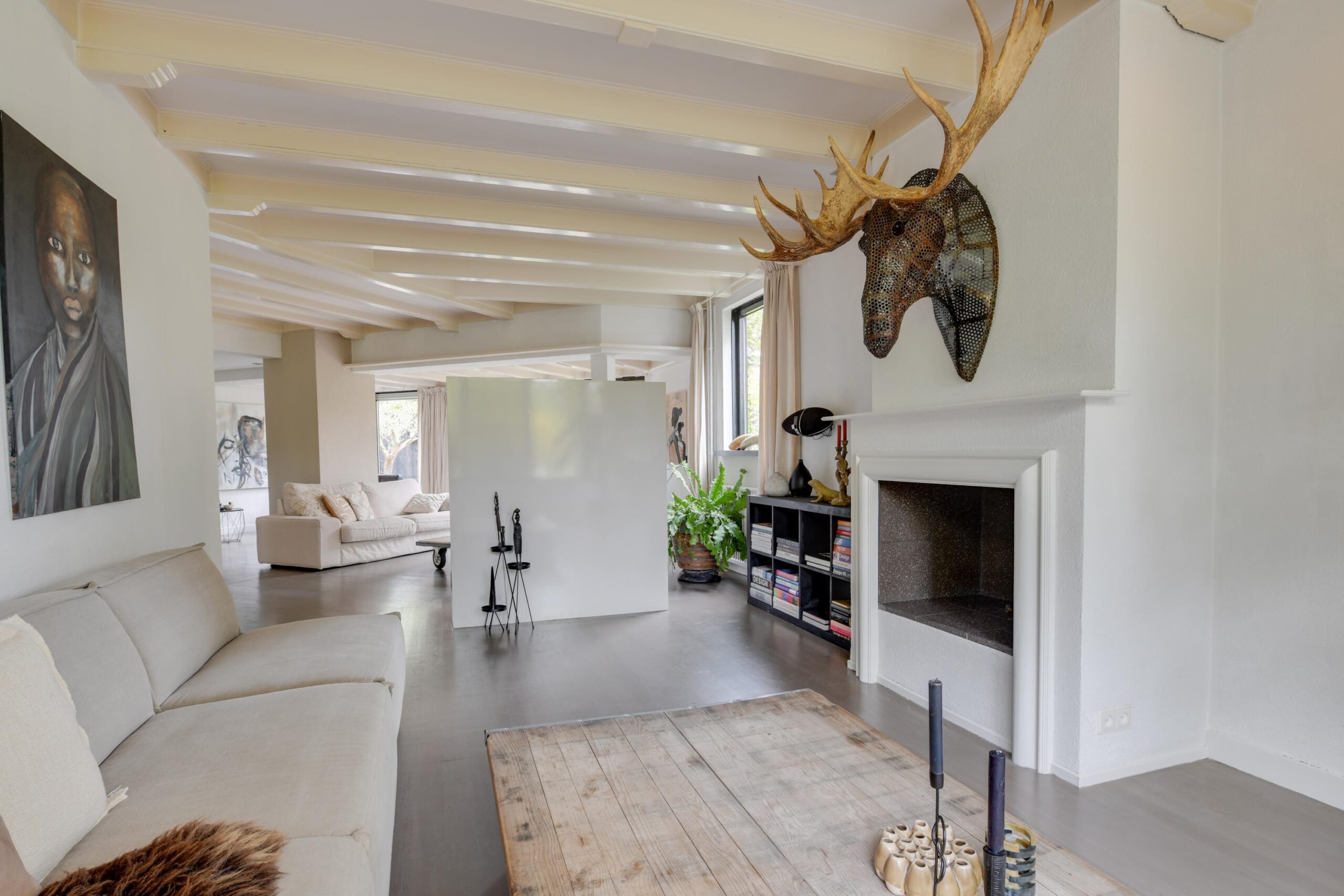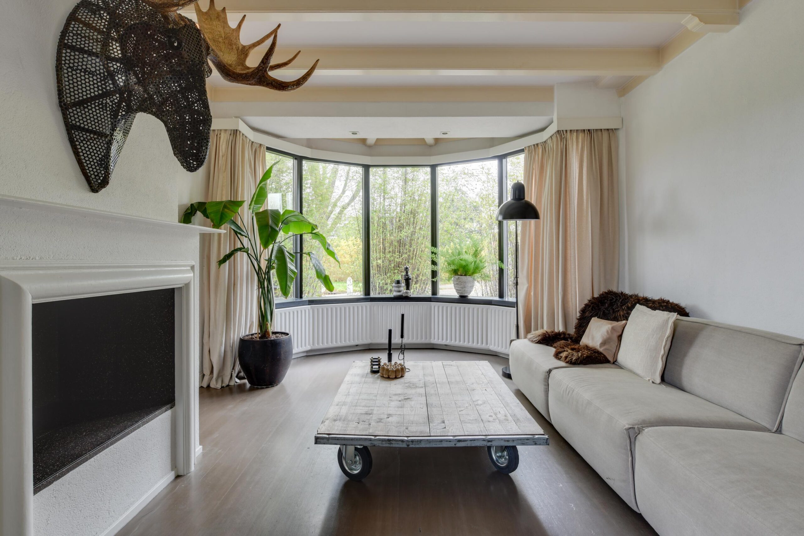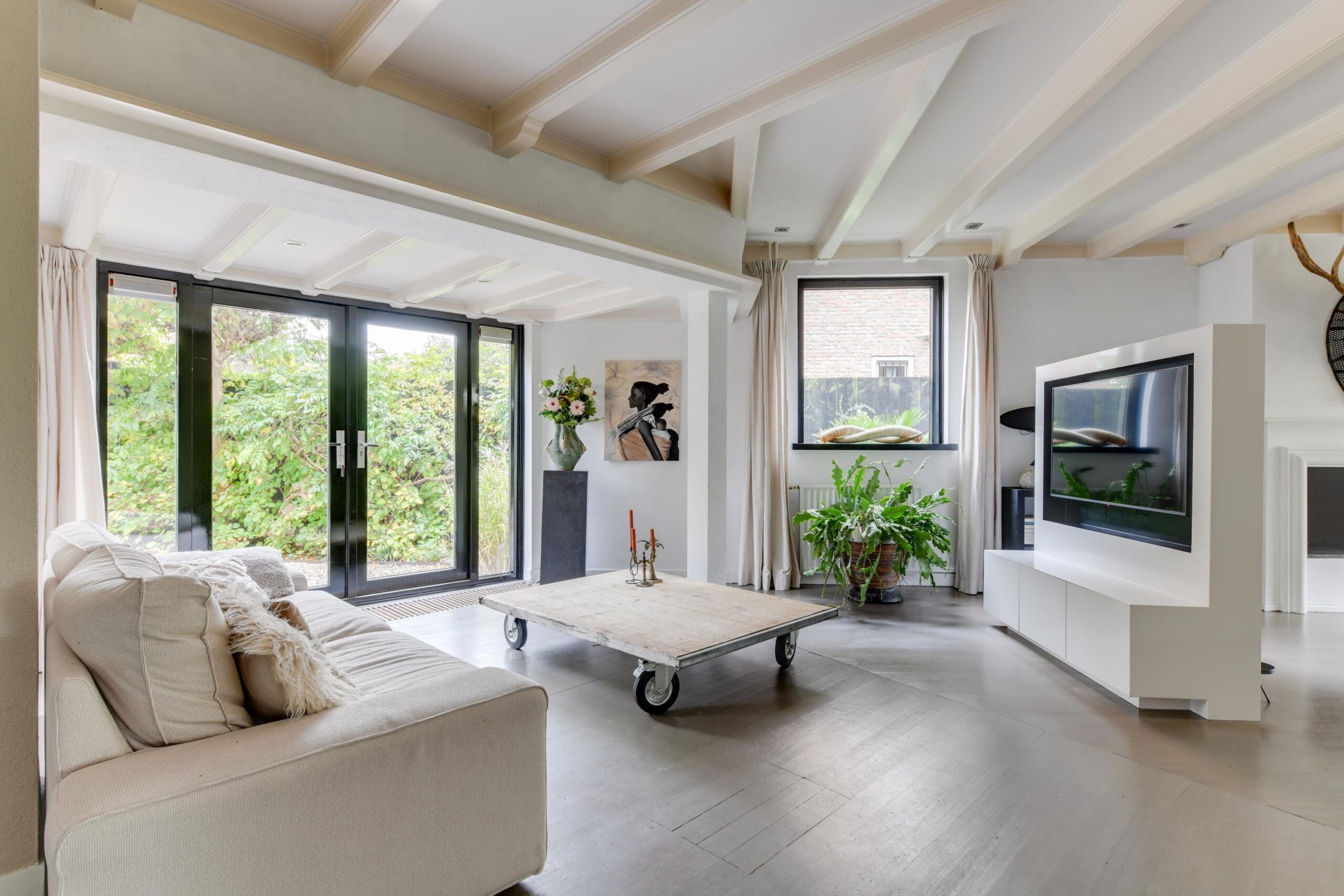 Entree, hal met leistenen vloer, zeer sfeervolle en lichte woonkamer met fraaie erker, houten vloer, open haard (gas) en toegang tot de tuin door middel van de openslaande deuren.