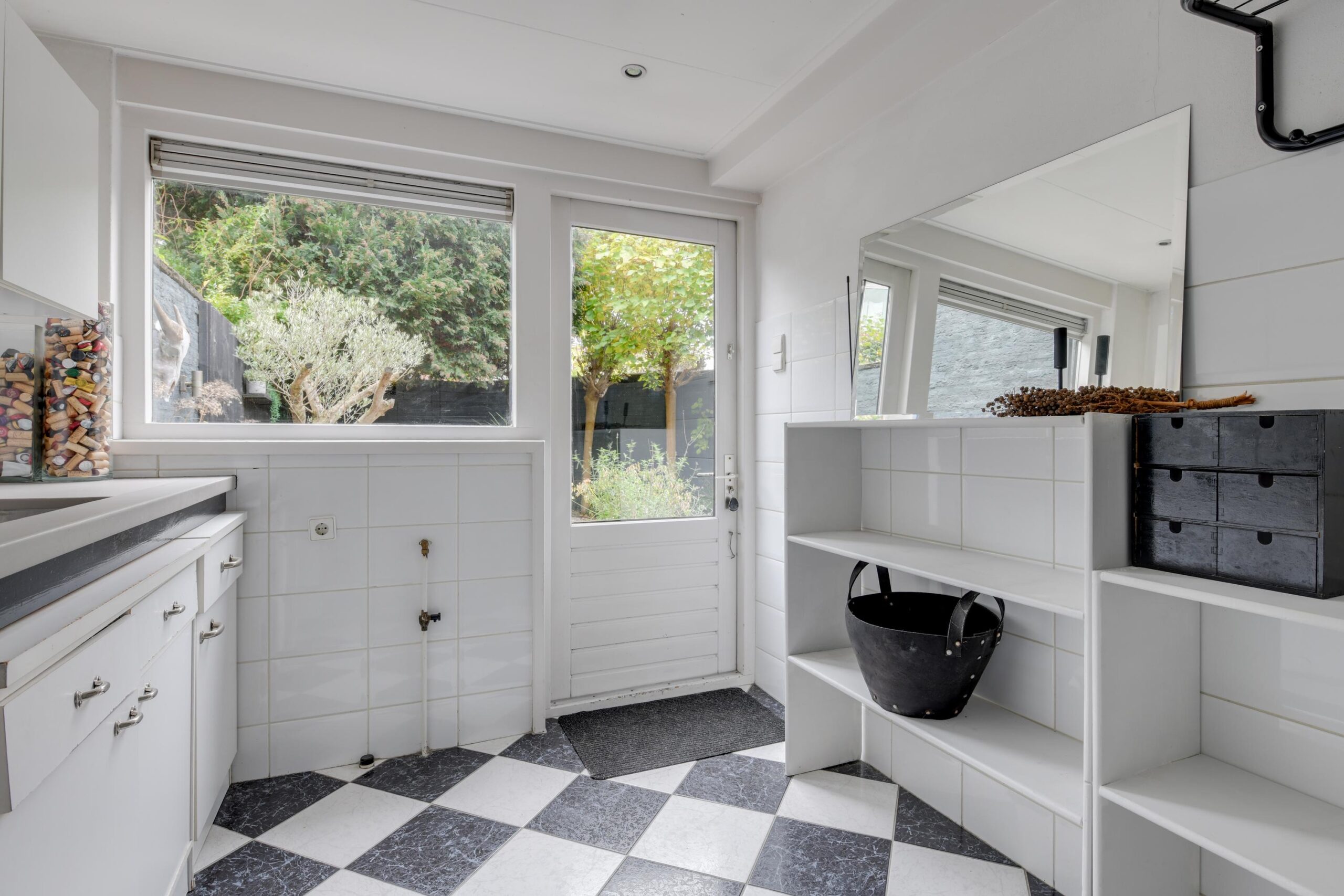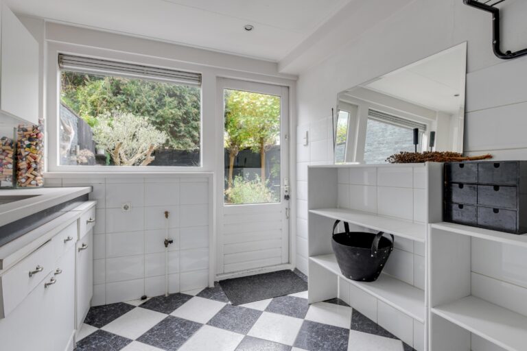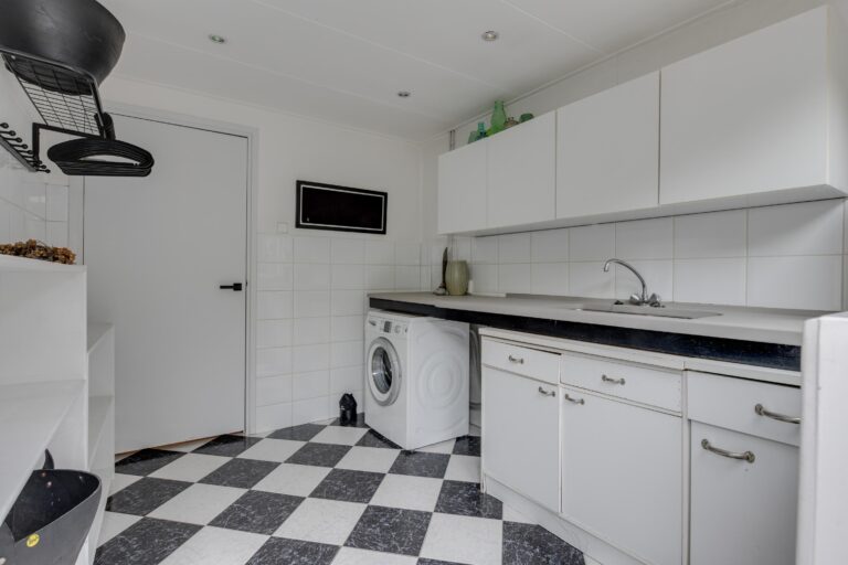 Aansluitend treft u een tussenportaal met toilet en een bijkeuken met pantry en aansluitingen voor wasmachine en droger.