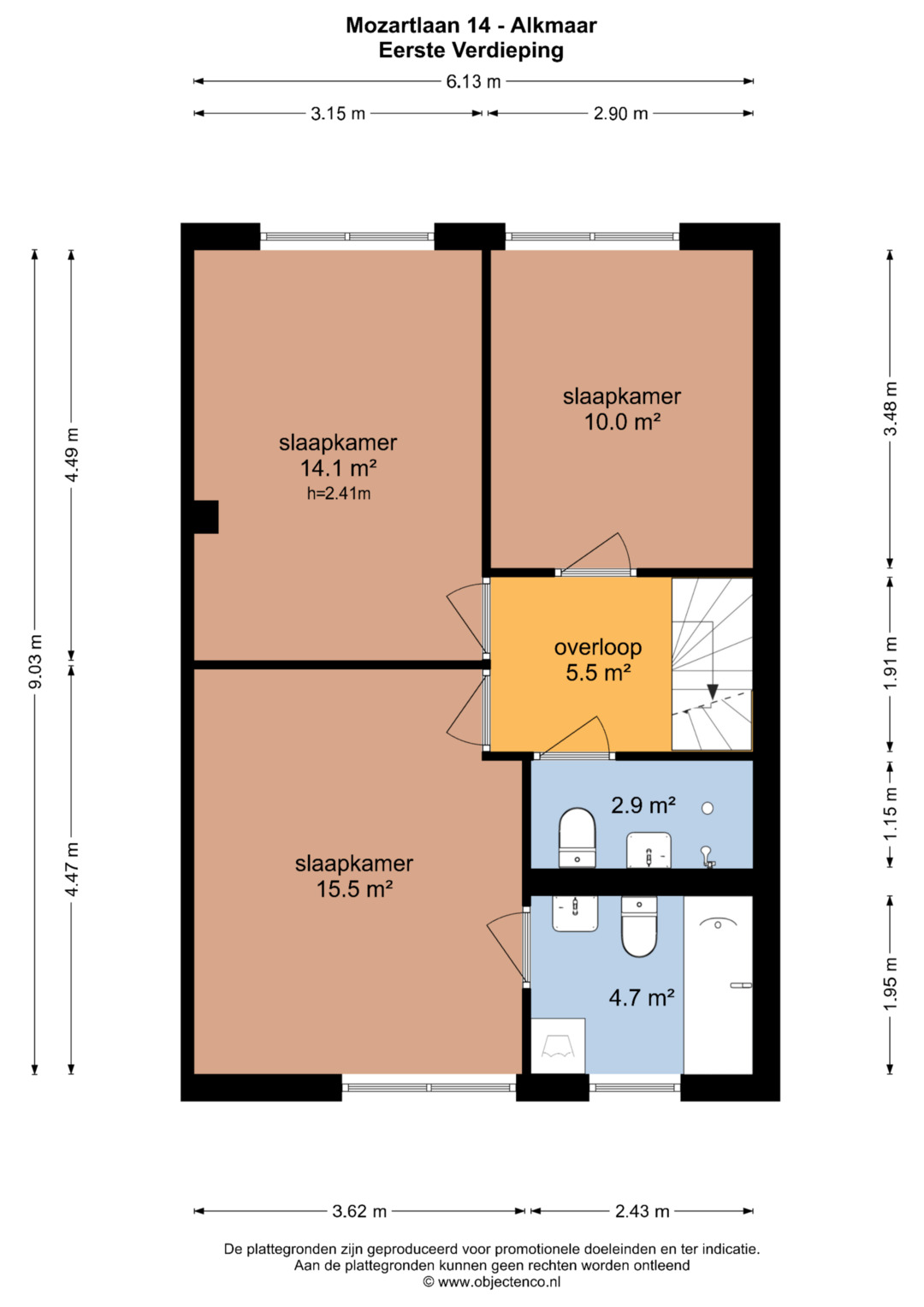Op de overloop vind je toegang tot de slaapkamers en badkamer. De royale master bedroom aan de voorzijde (ca. 15,5 m²) beschikt over een eigen badkamer (ca. 4,5 m²) met ligbad, douche, wastafel, toilet en aansluiting voor de wasmachine. Aan de achterzijde bevinden zich twee goed bemeten slaapkamers (ca. 14 m² en ca. 10 m²). De tweede badkamer (ca. 3 m²) is voorzien van een douche, toilet en wastafel.